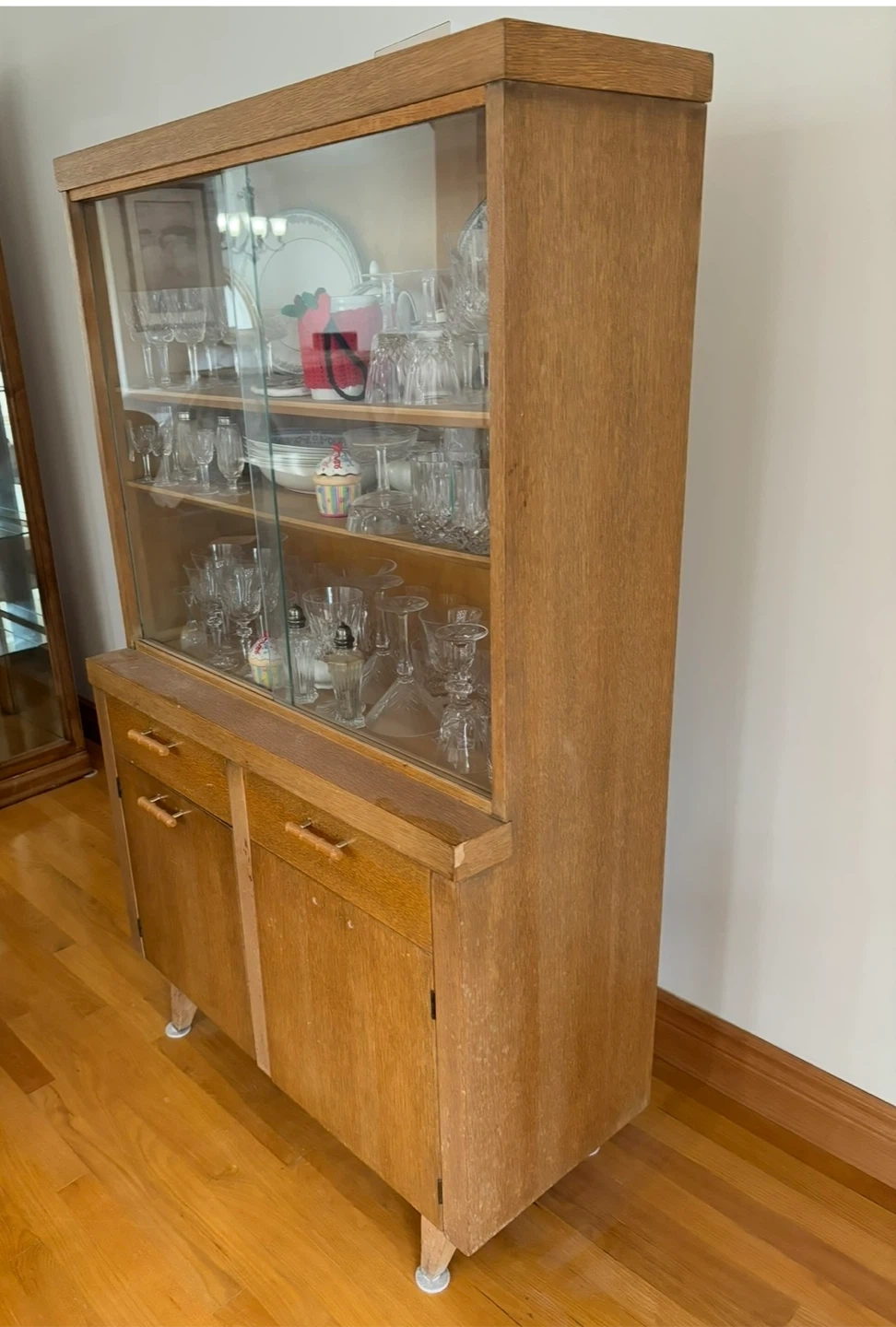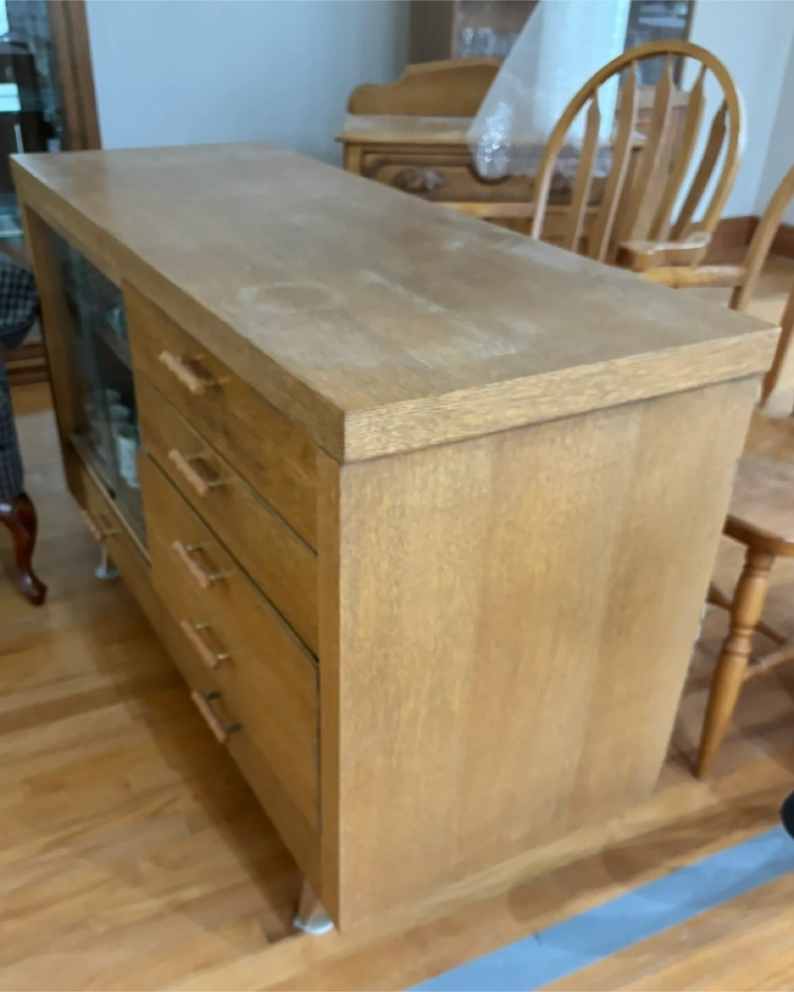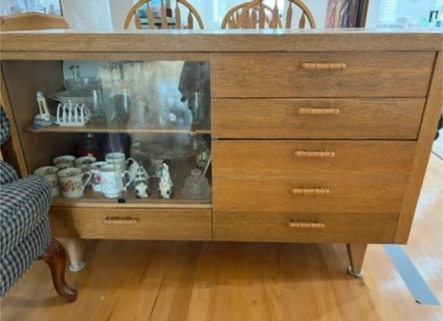 0I'm selling a wooden dining table and a sideboard. They're both in good condition and would be perfect for a dining room or kitchen. The sideboard has a glass door and drawers for storage. Let me know if you're interested!