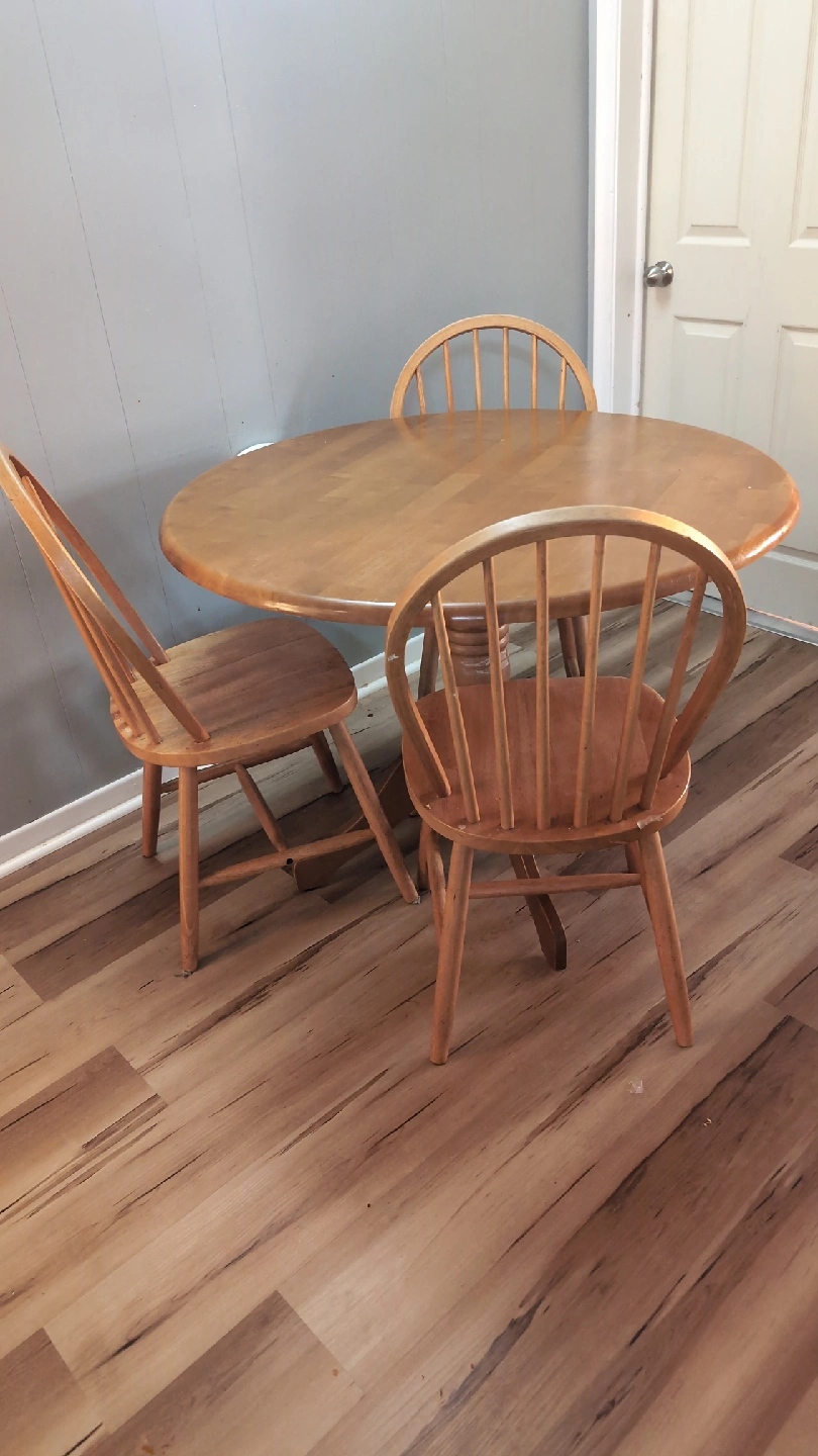 Selling a wooden dining table complete with three matching chairs! The set is in good condition and would be a great addition to any kitchen or dining area. Perfect for small spaces or cozy meals with friends and family