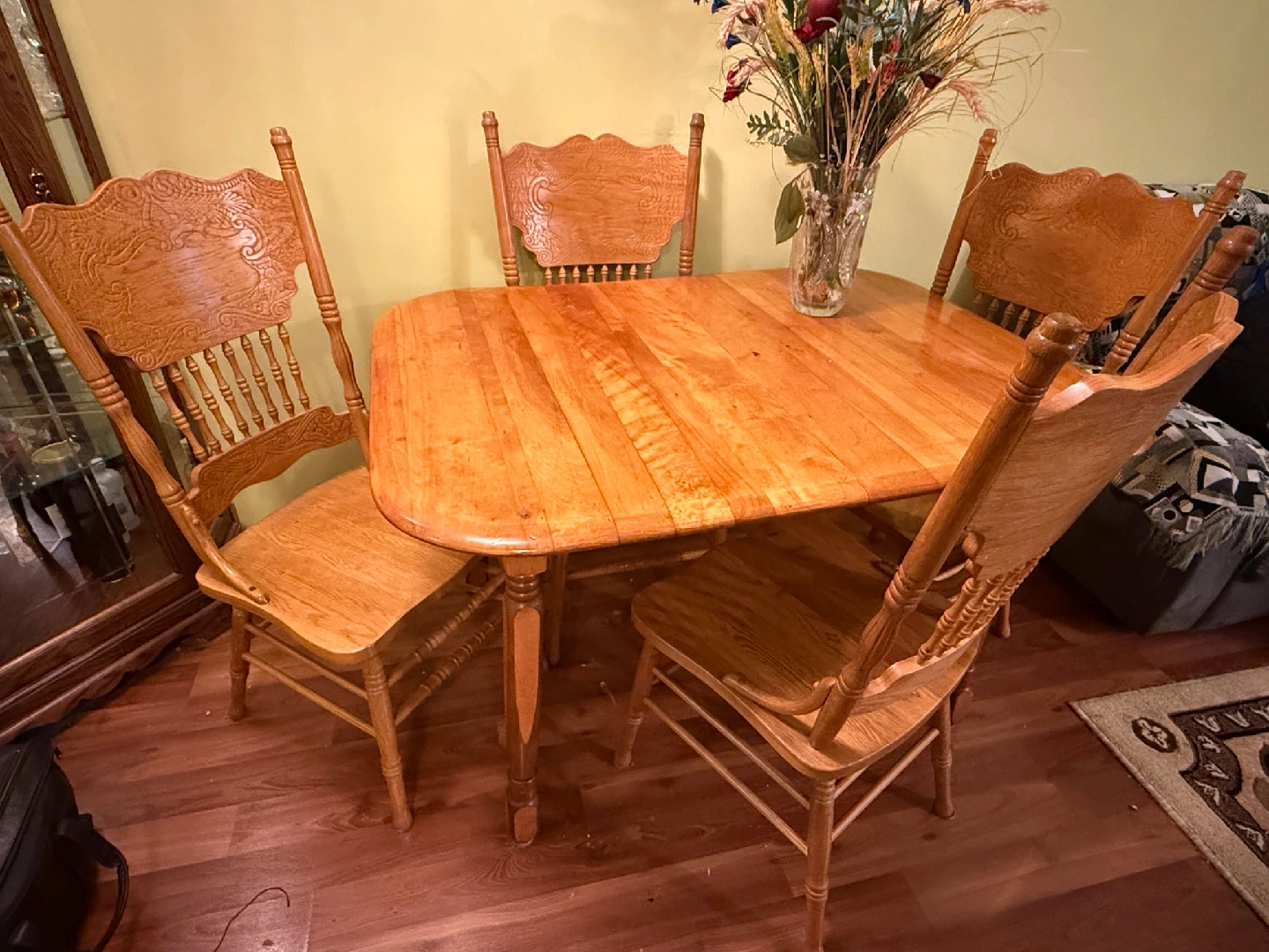 70Selling a wooden dining table with four matching chairs. The set is in good condition and would be a great addition to any home. The table has a unique design, and the chairs are sturdy and comfortable. Perfect for family dinners or entertaining guests!