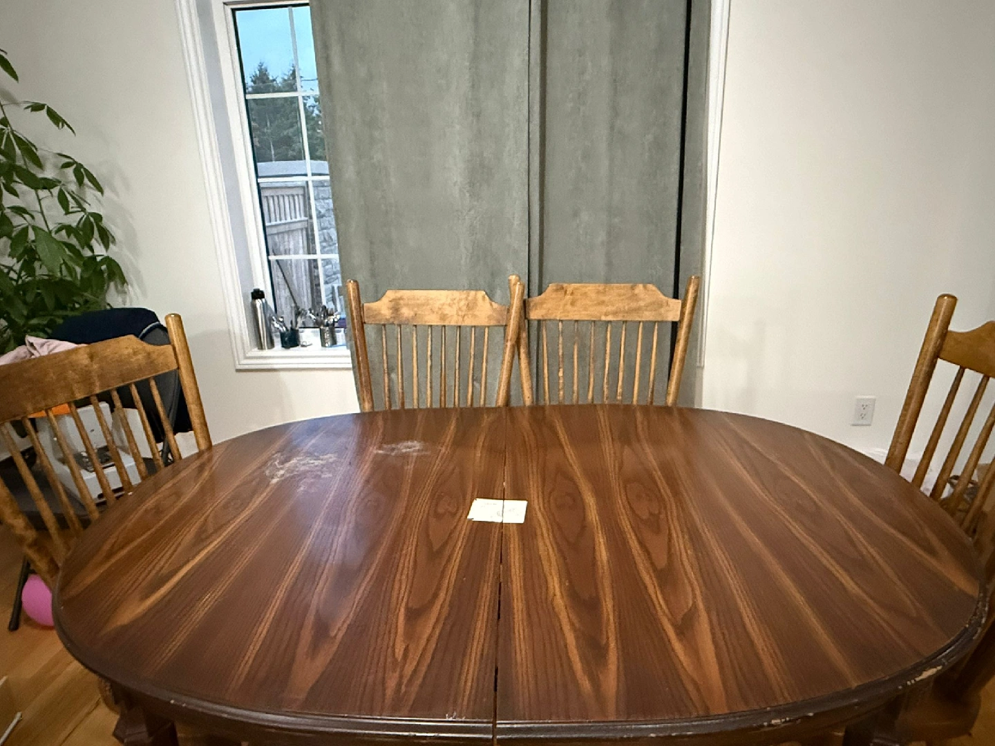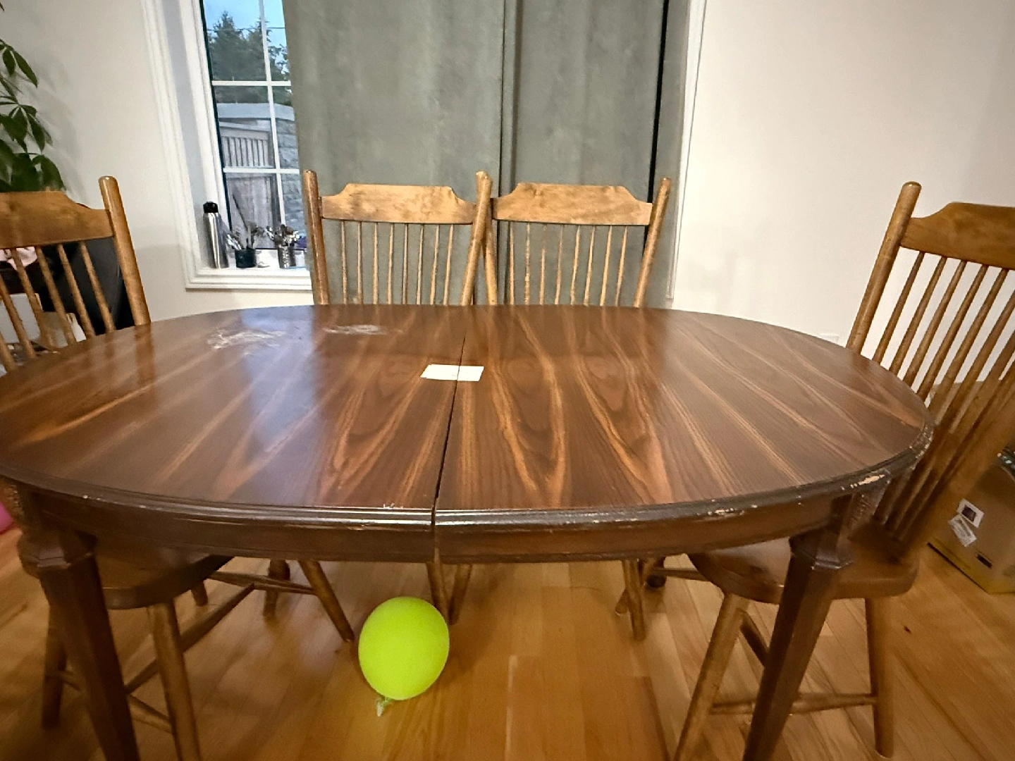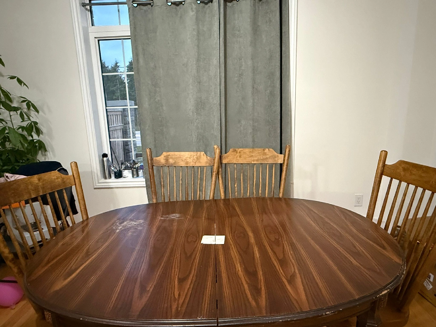10This is a strong wooden dining table with 6 matching chairs, all in good condition. The chairs are sturdy and easy to move. The table can be disassembled easily for moving. Table Height: 29.5 inches Table Shape: Oval Length (Diameter): 59.8 inches