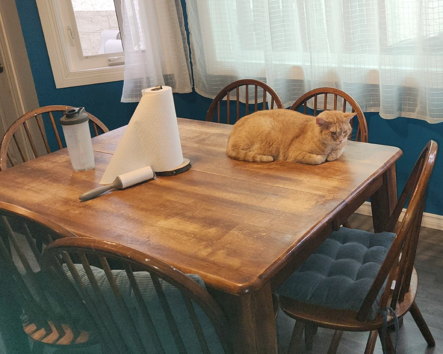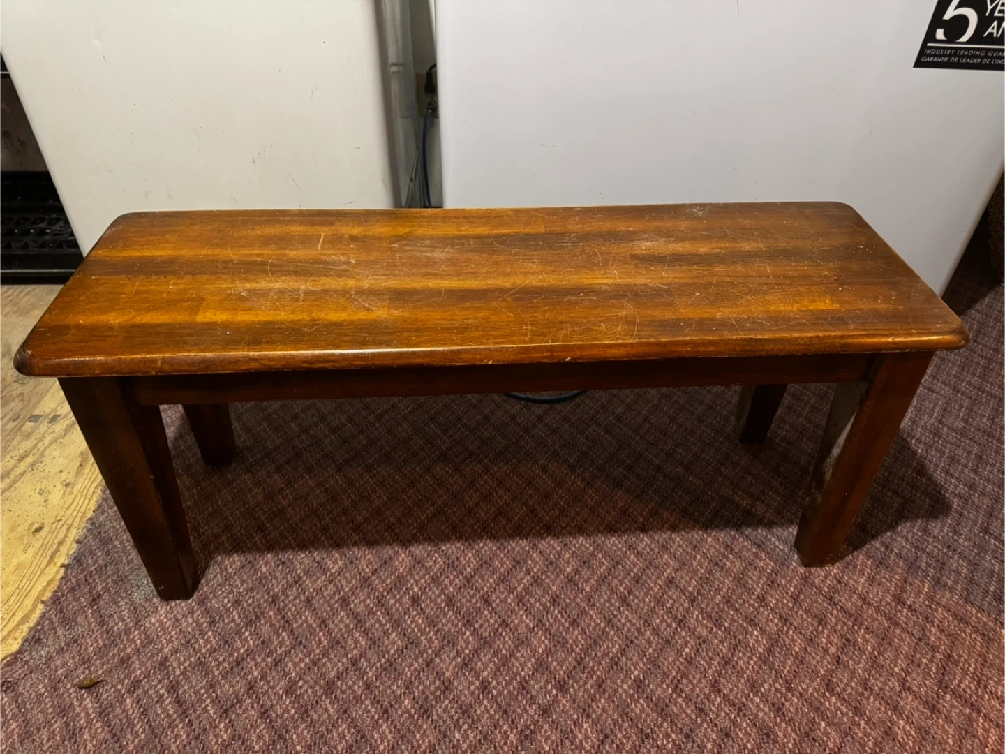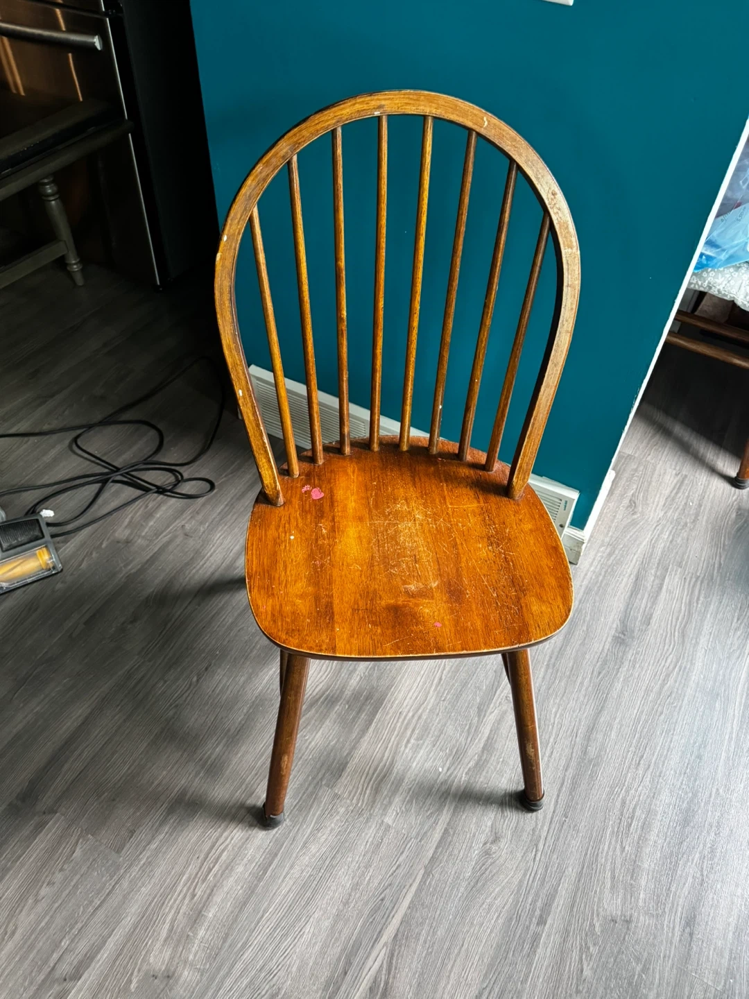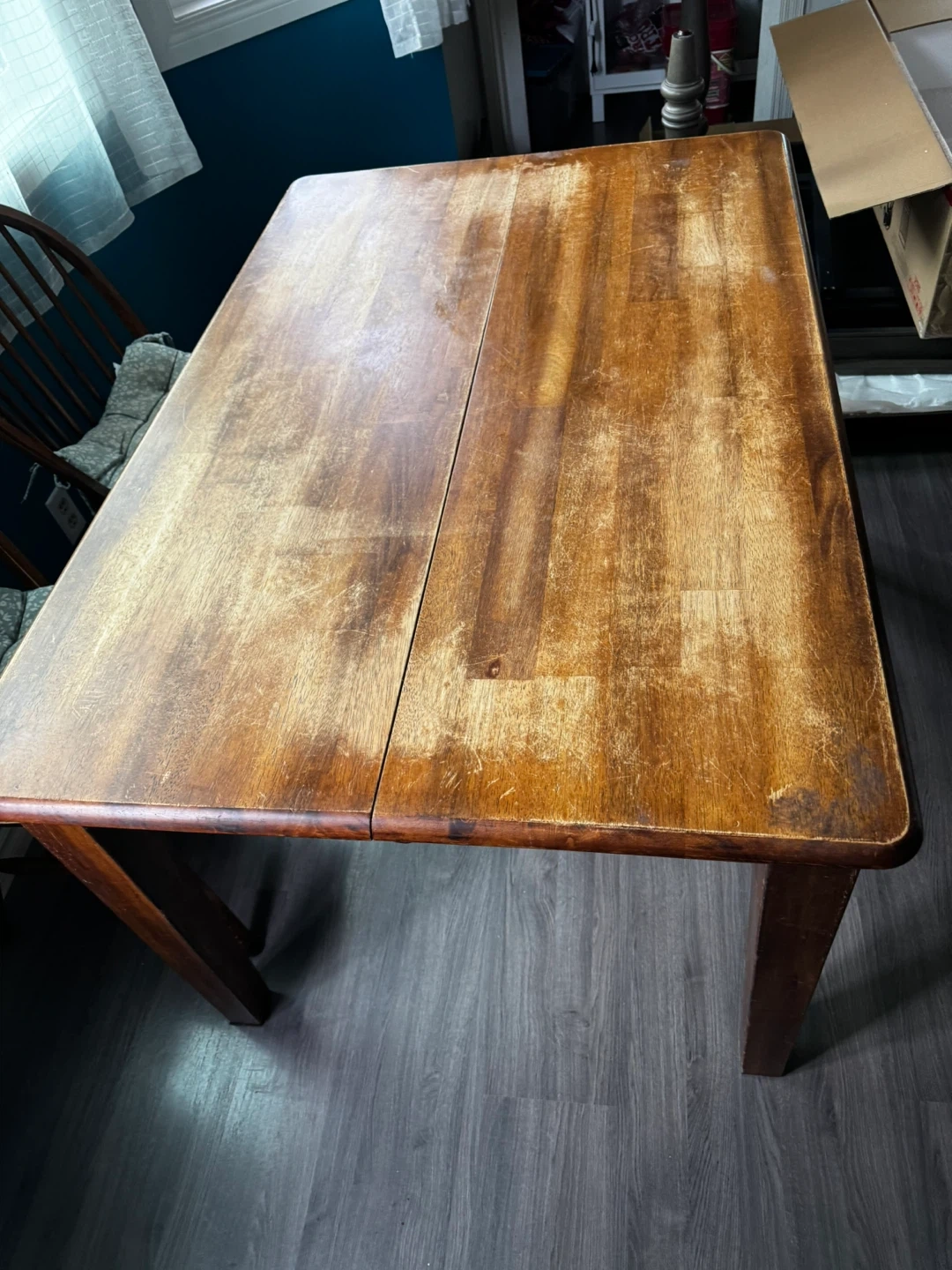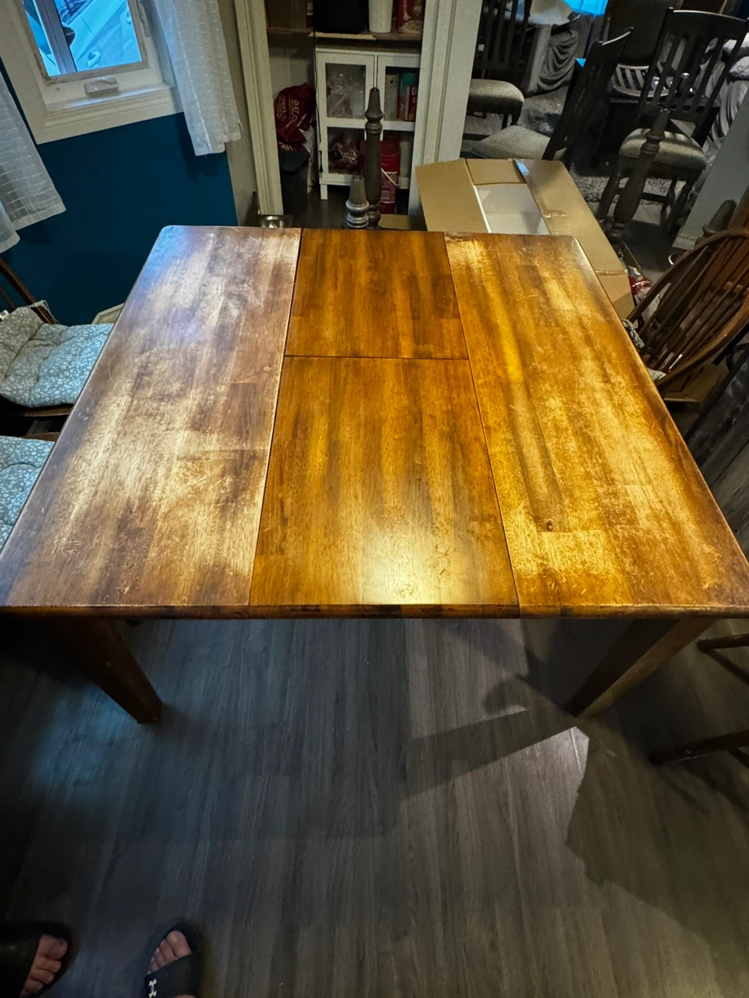 Selling a wooden butterfly dining table with matching chairs and bench. The set is in loved condition, showing some signs of wear and tear but the right person could restore it to beautiful . Perfect for a cozy dining space but can also accommodate up to 8 people comfortably. Chair pads are free with the set if you would like them