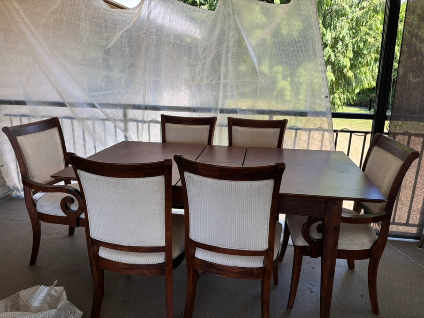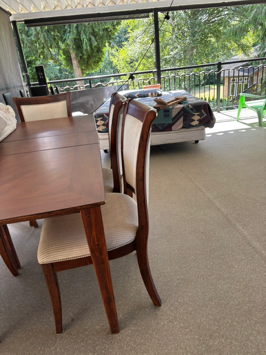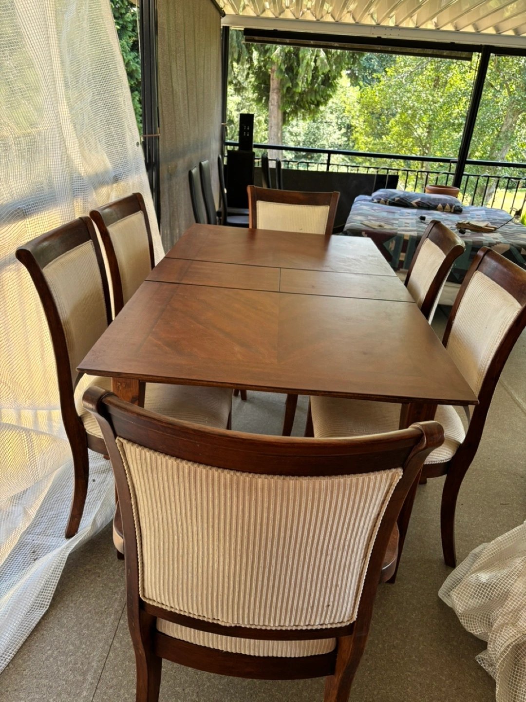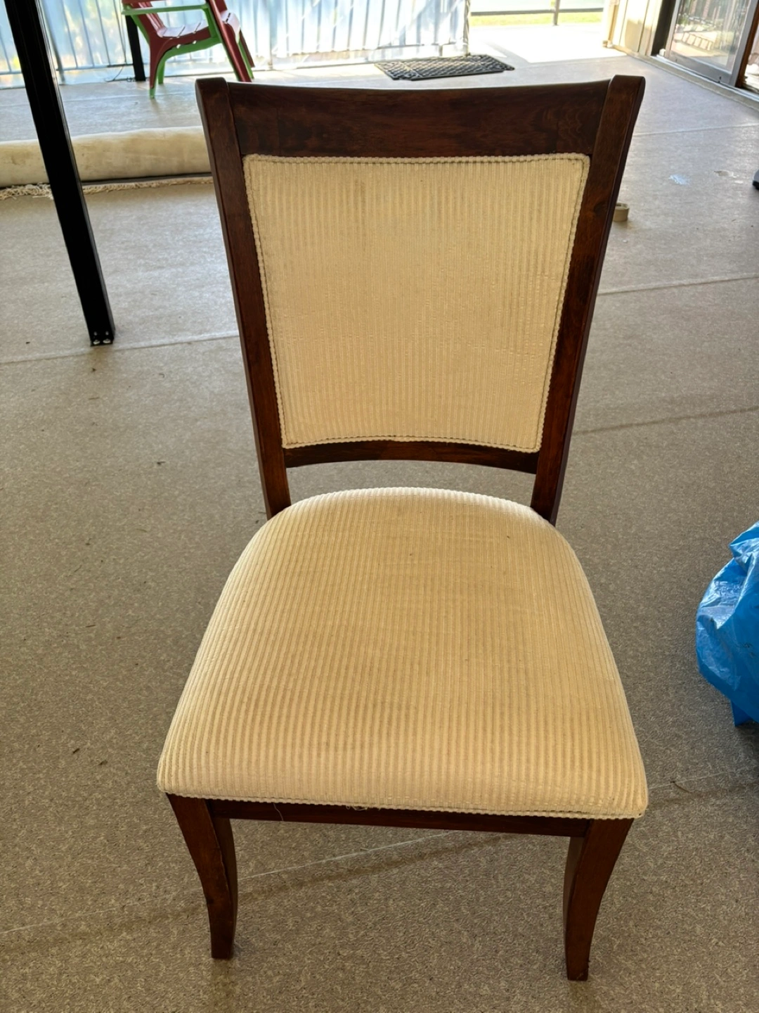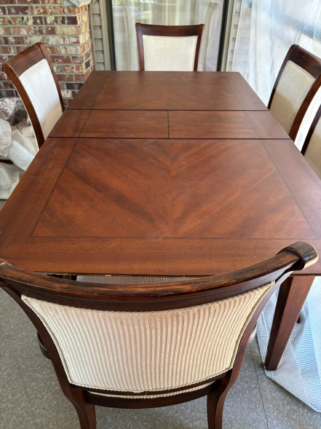 Selling a wooden dining table with matching chairs. The set appears to be in good condition and would be a great addition to any dining space. The table has a classic design, and the chairs feature a comfortable upholstered seat. Perfect for family meals or entertaining guests!
