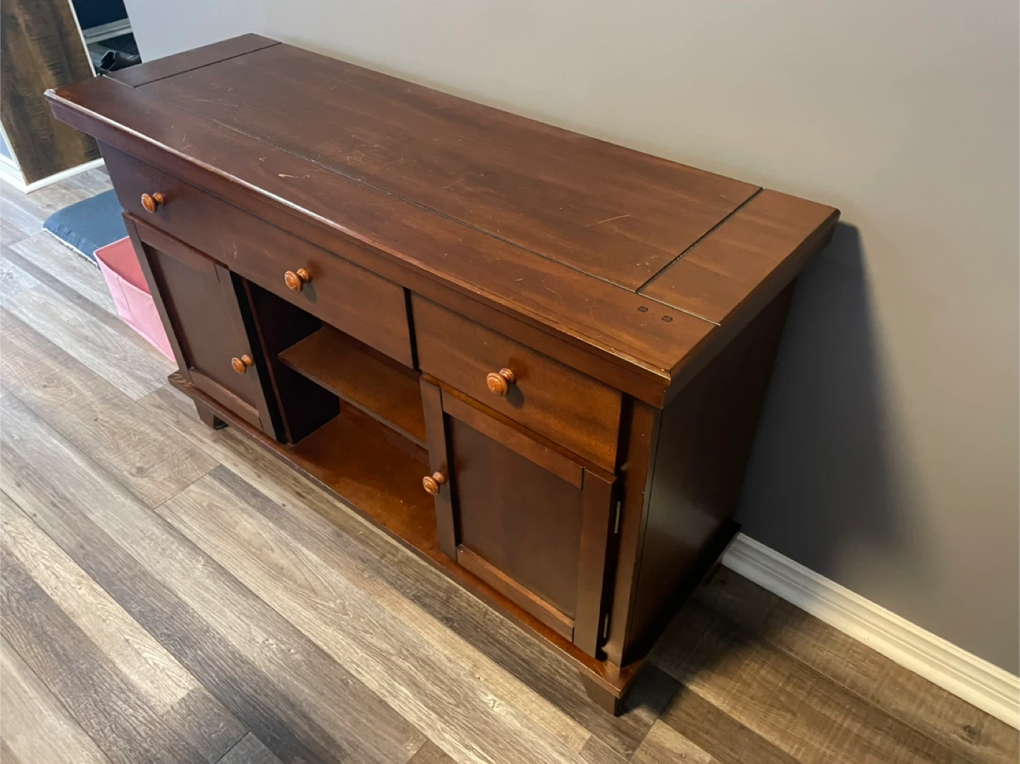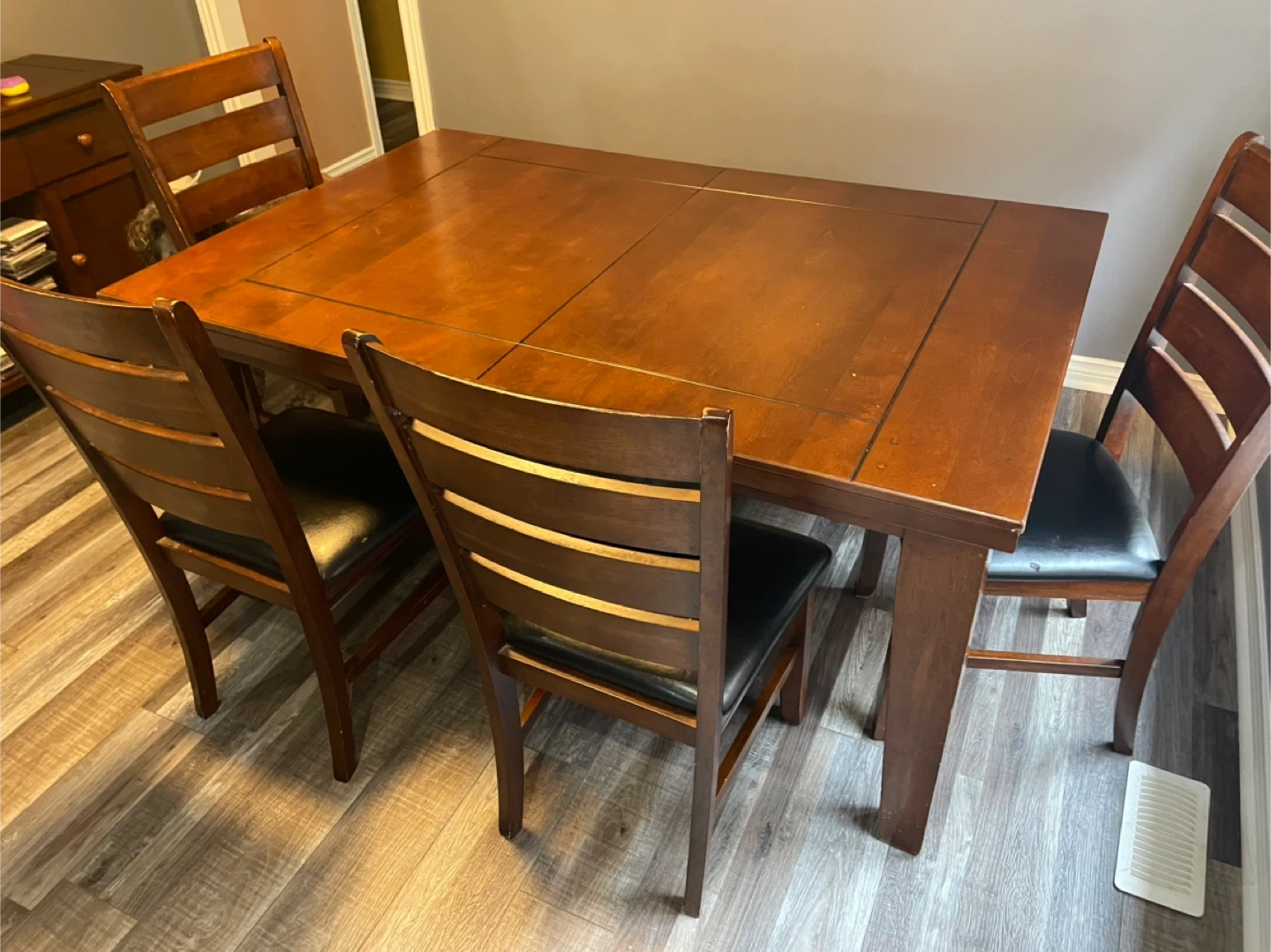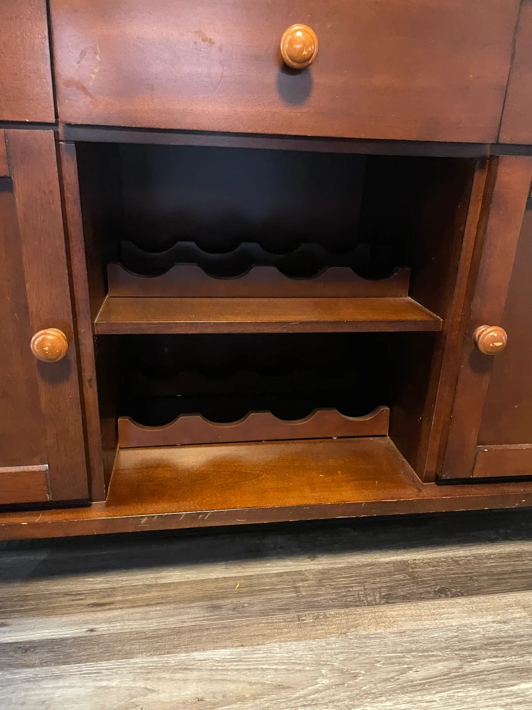 10Selling a wooden dining table with chairs. The table measures approximately 62 inches in length and 42 inches in width. It's a sturdy set, perfect for family dinners or gatherings! Includes hutch with wine rack and drawers.