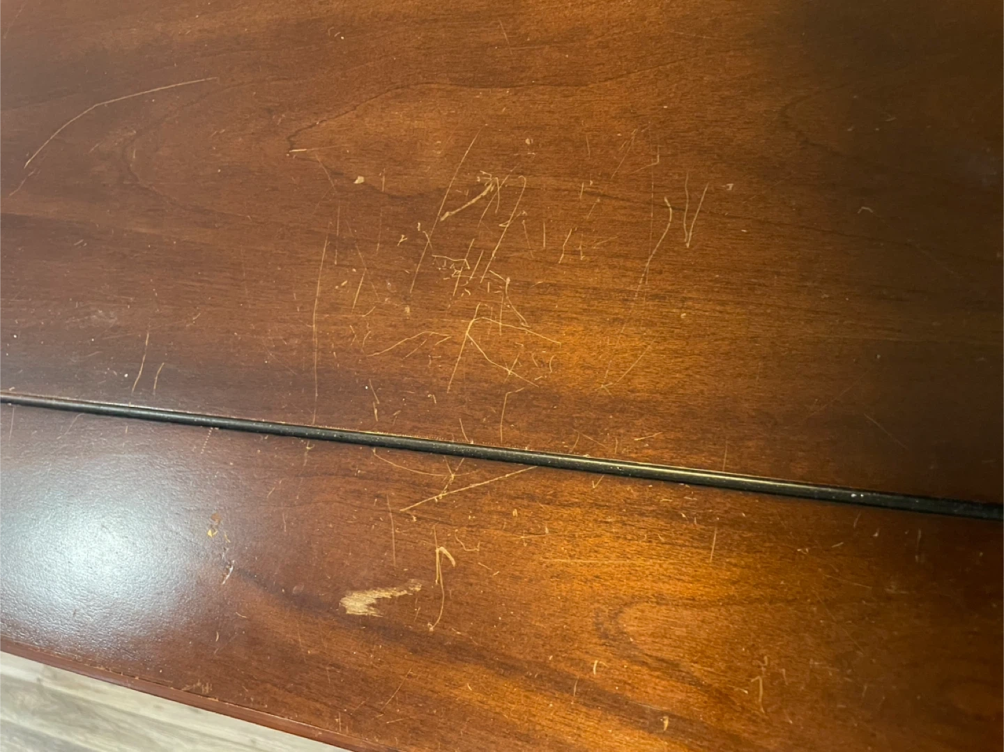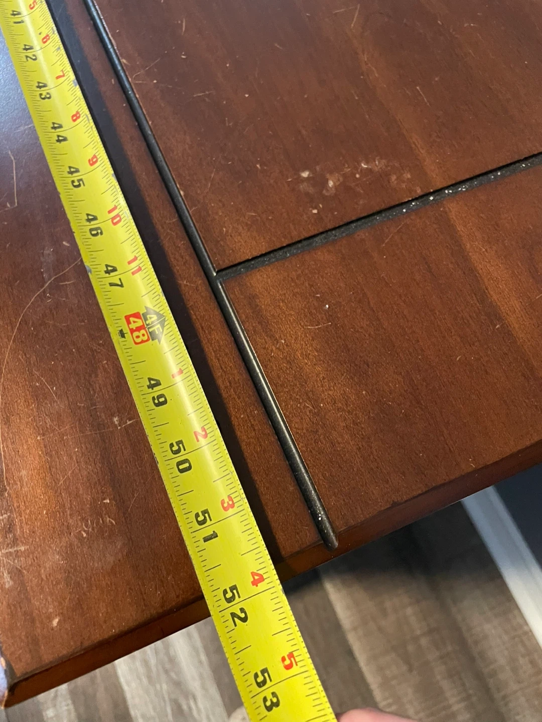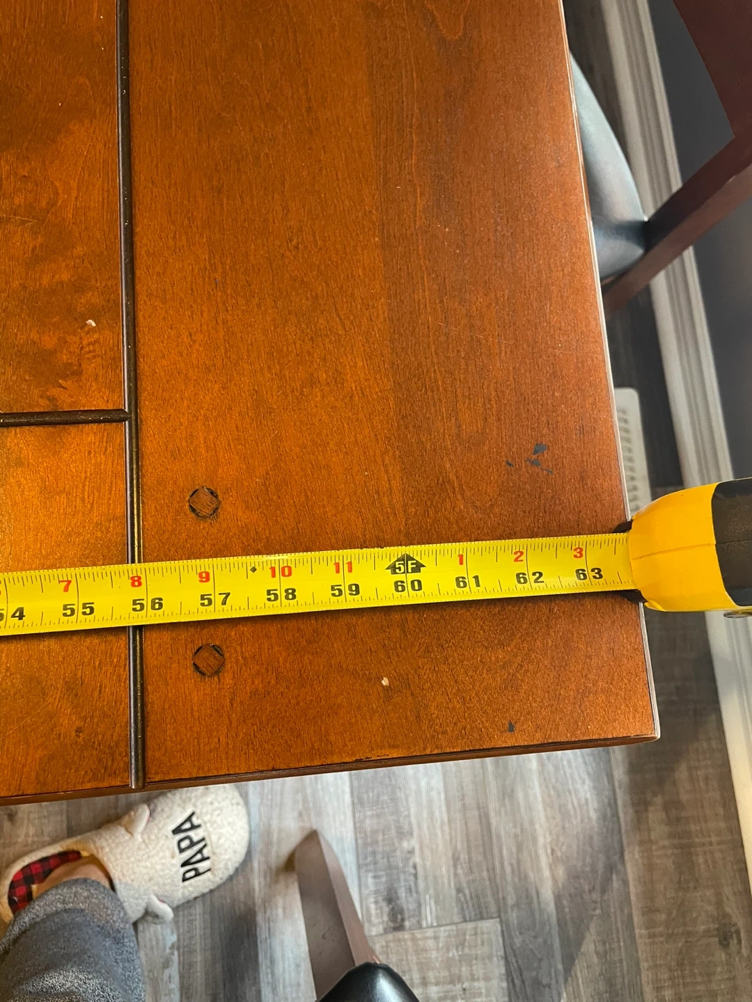 10Selling a wooden dining table with chairs. The table measures approximately 62 inches in length and 42 inches in width. It's a sturdy set, perfect for family dinners or gatherings! Includes hutch with wine rack and drawers.