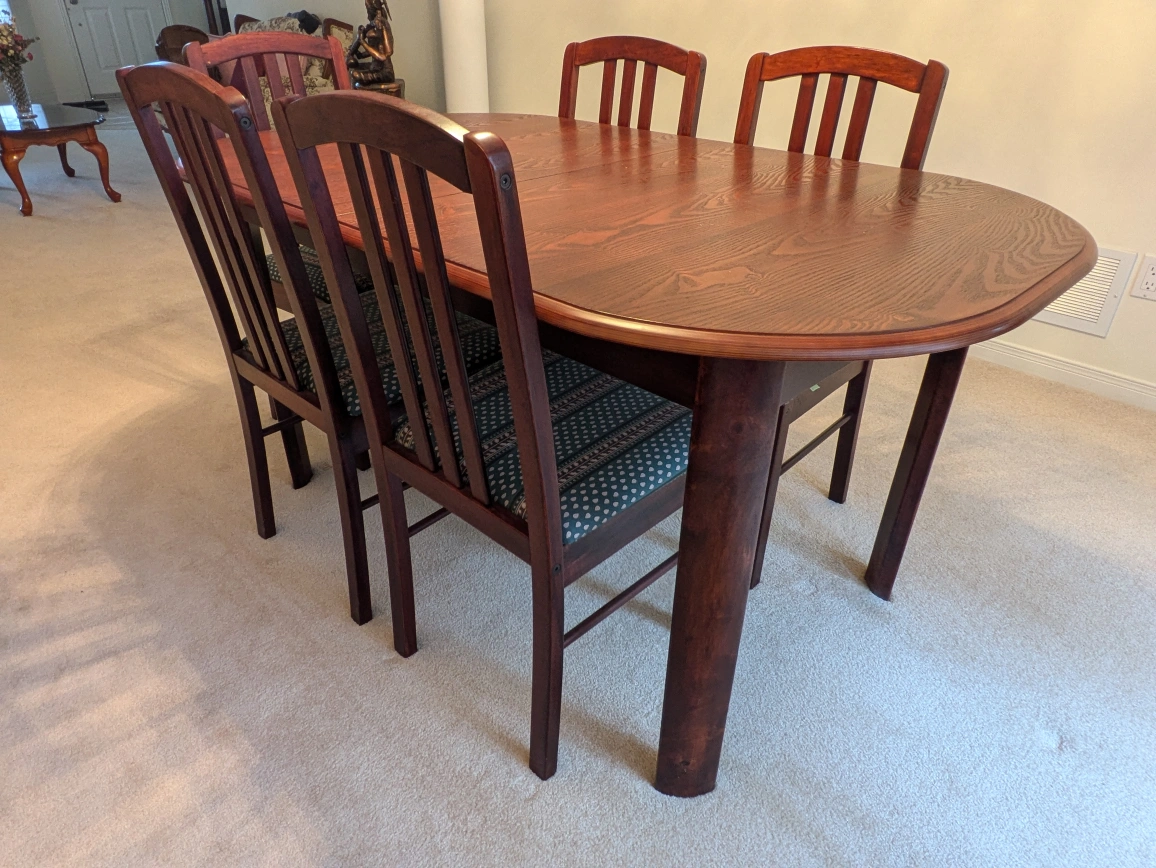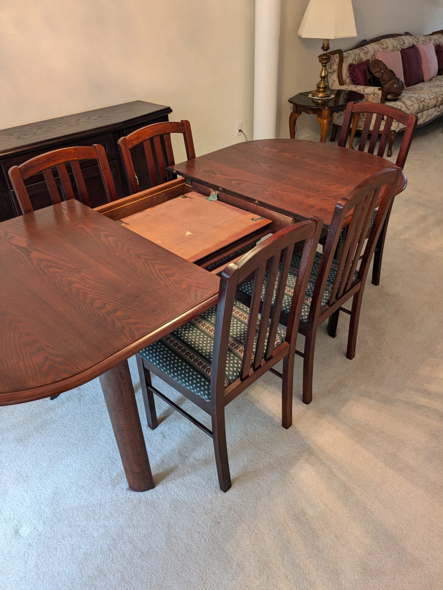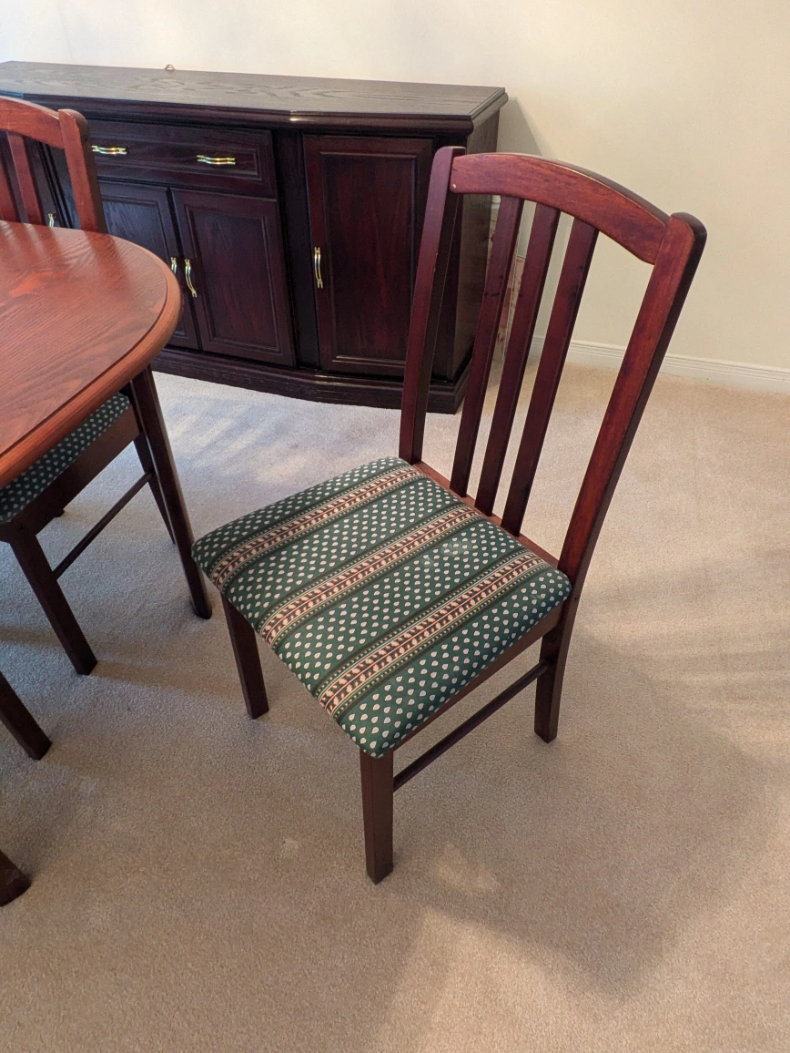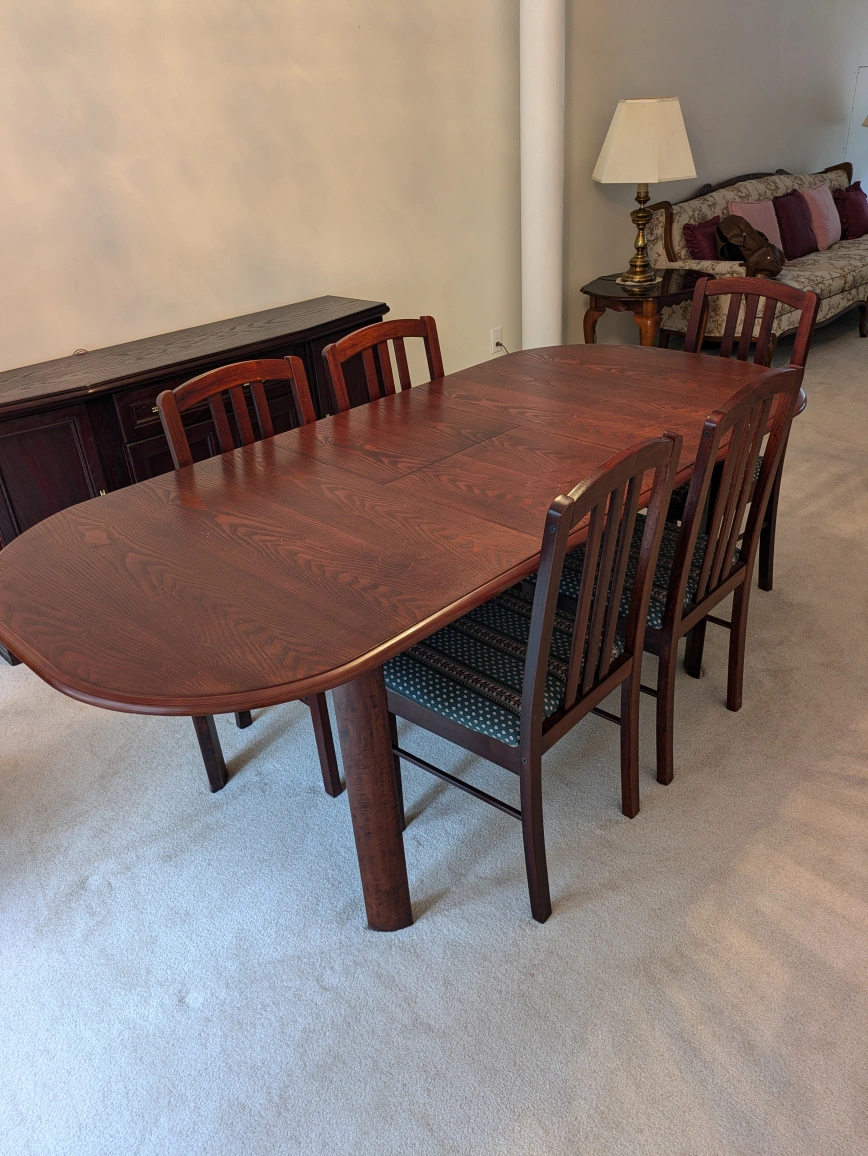 Selling a lovely wooden dining table that comes with six chairs. The table has a rich, dark wood finish and a unique extending leaf feature for when you need extra space. The chairs have comfortable, patterned cushions. It's a great set for family meals or entertaining guests! Width: 35" Regular Length: 58" Extendable Length: 75" Must pick up this item.