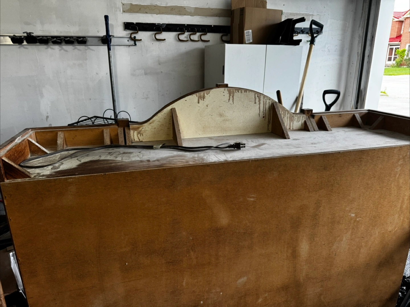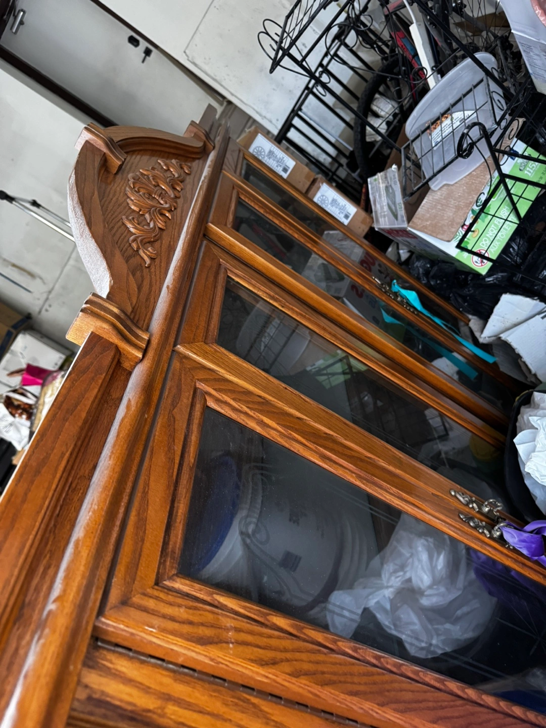 Hutch Wooden cabinet with glass doors. Features multiple shelves. Great for displaying your favourite possessions. Carved detailing along the top of the cabinet.