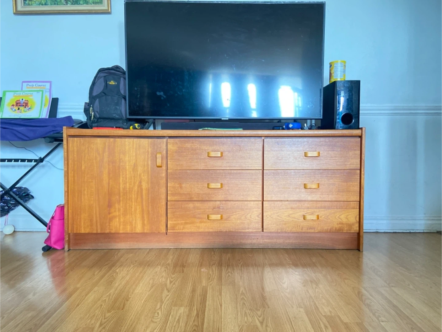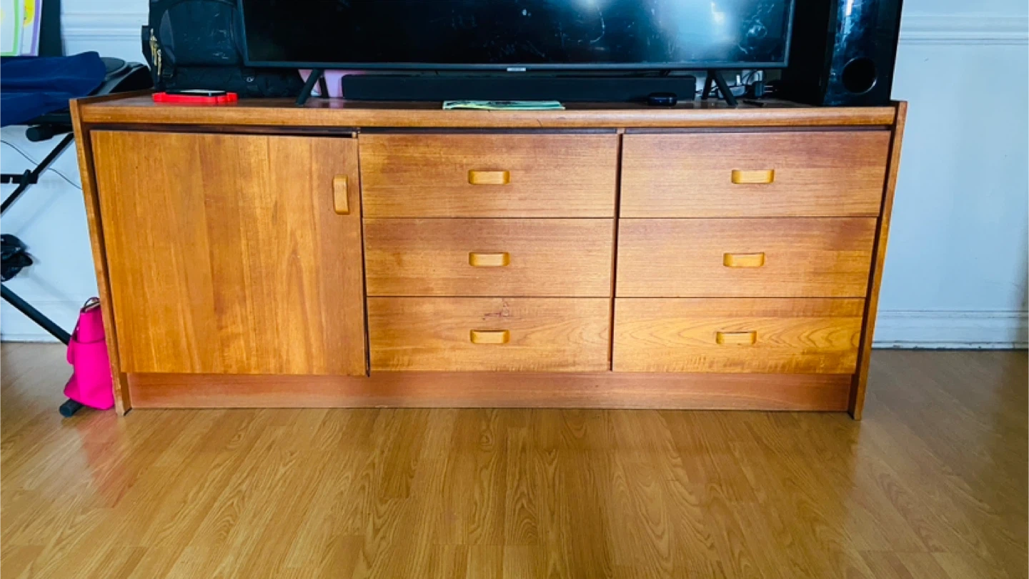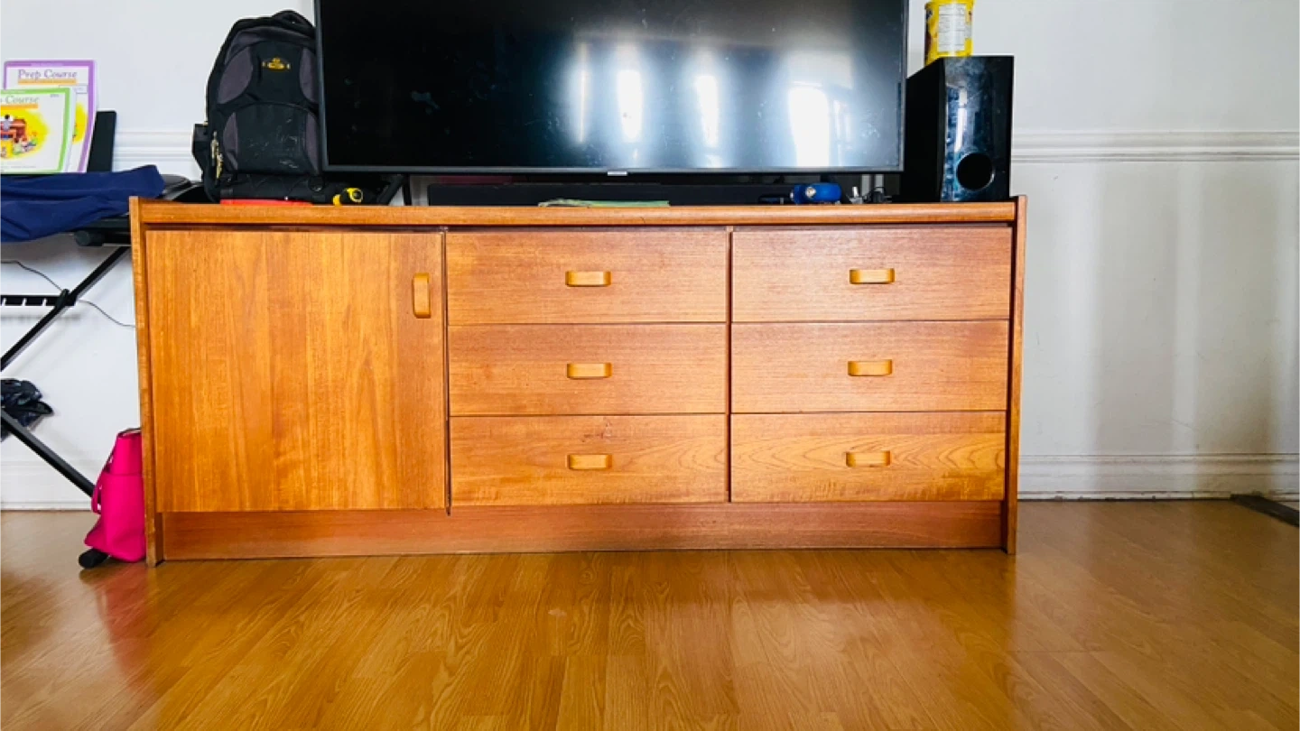 Selling a wooden dresser in good condition. It has a cabinet on the left side and six drawers on the right. Perfect for extra storage! Left side cabinet screw has to be tight I don’t have ln keys.asap