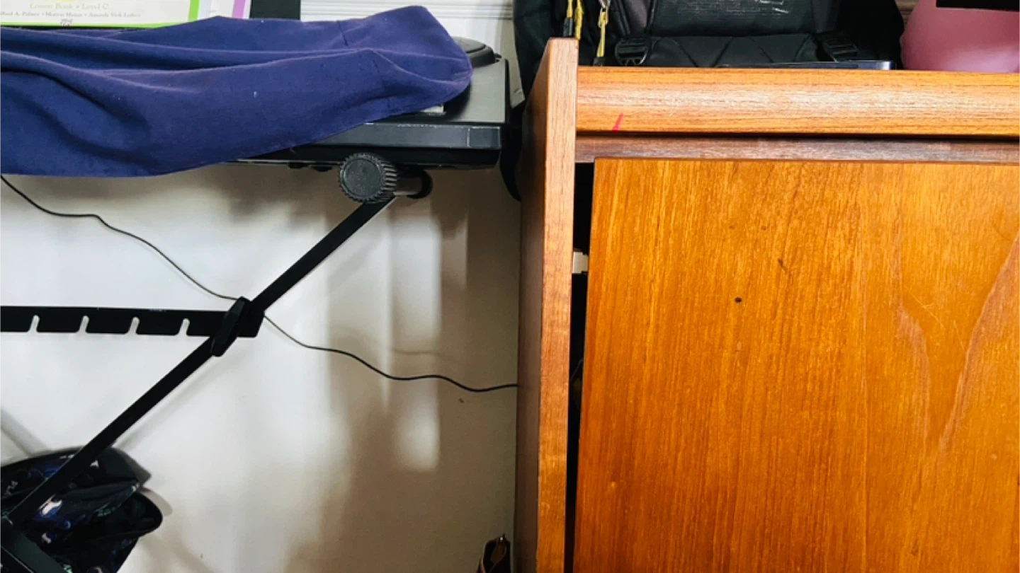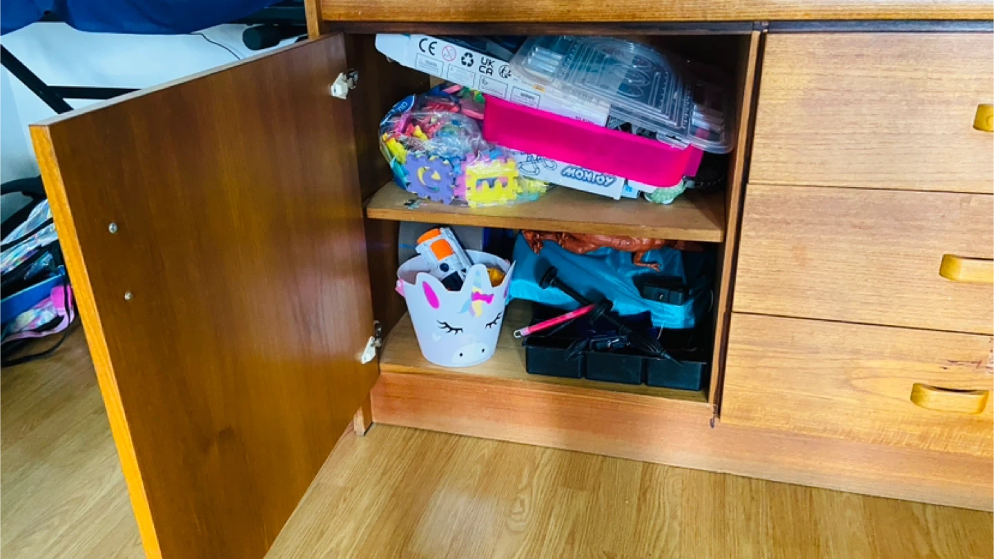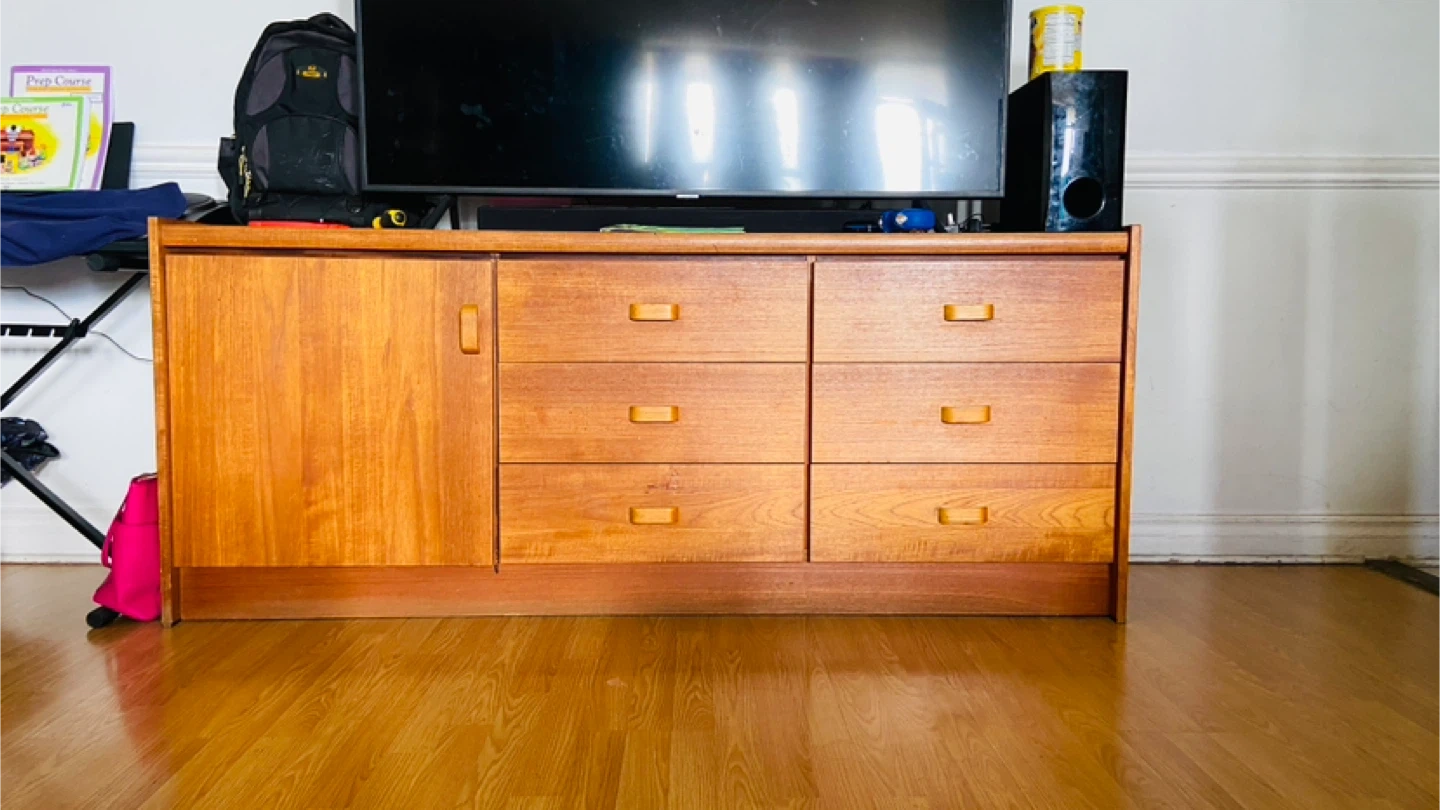 Selling a wooden dresser in good condition. It has a cabinet on the left side and six drawers on the right. Perfect for extra storage! Left side cabinet screw has to be tight I don’t have ln keys.asap