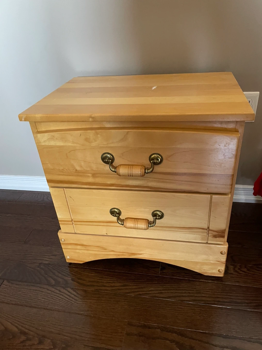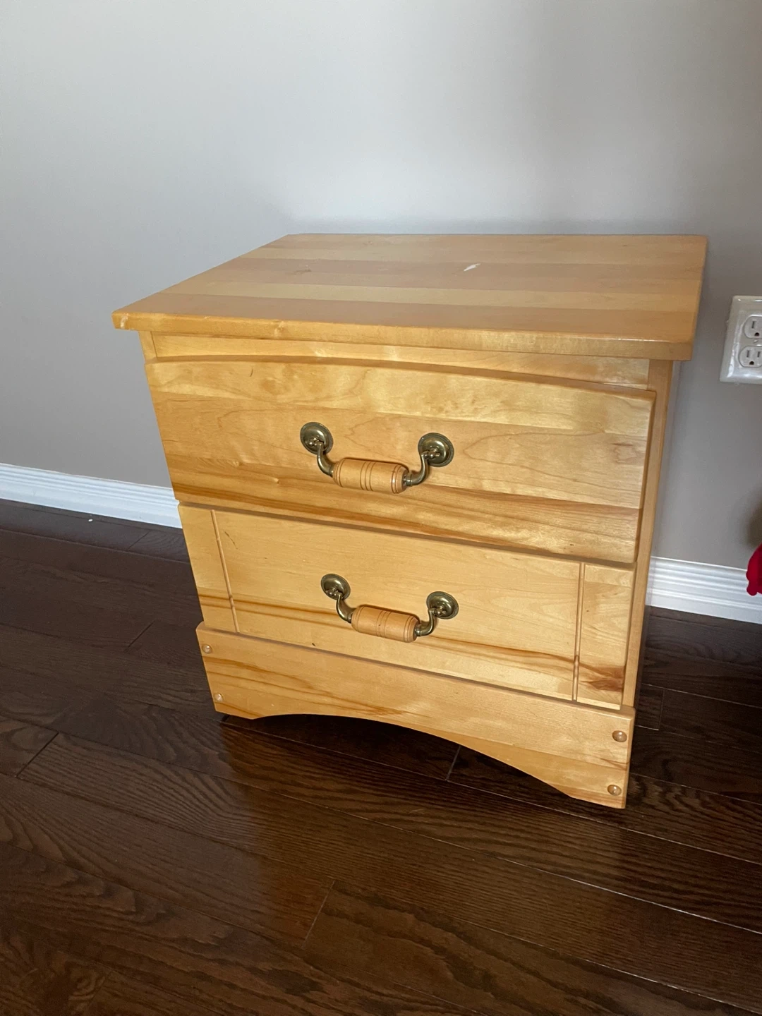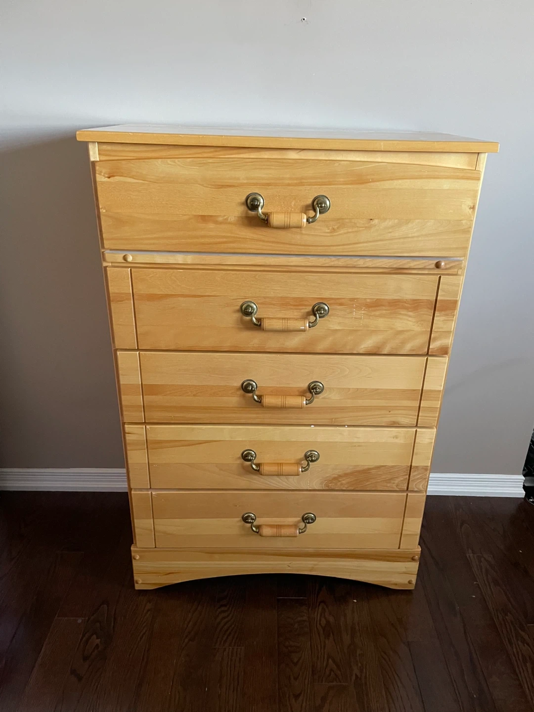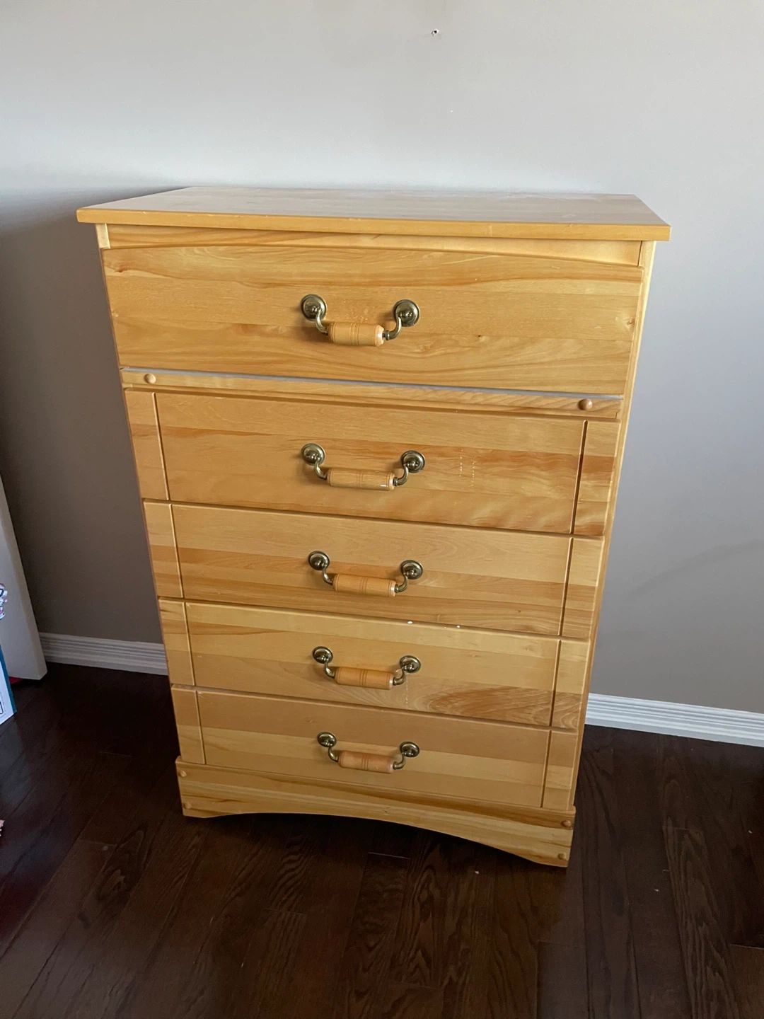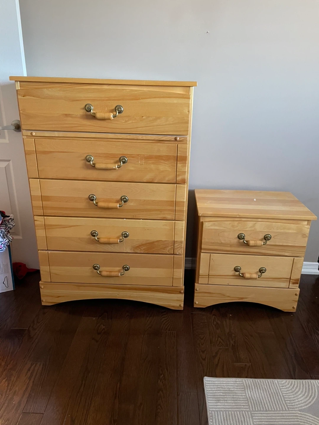 Selling a lovely wooden dresser with five drawers and a matching nightstand with two drawers. They're in great shape and would look perfect in any bedroom! $250