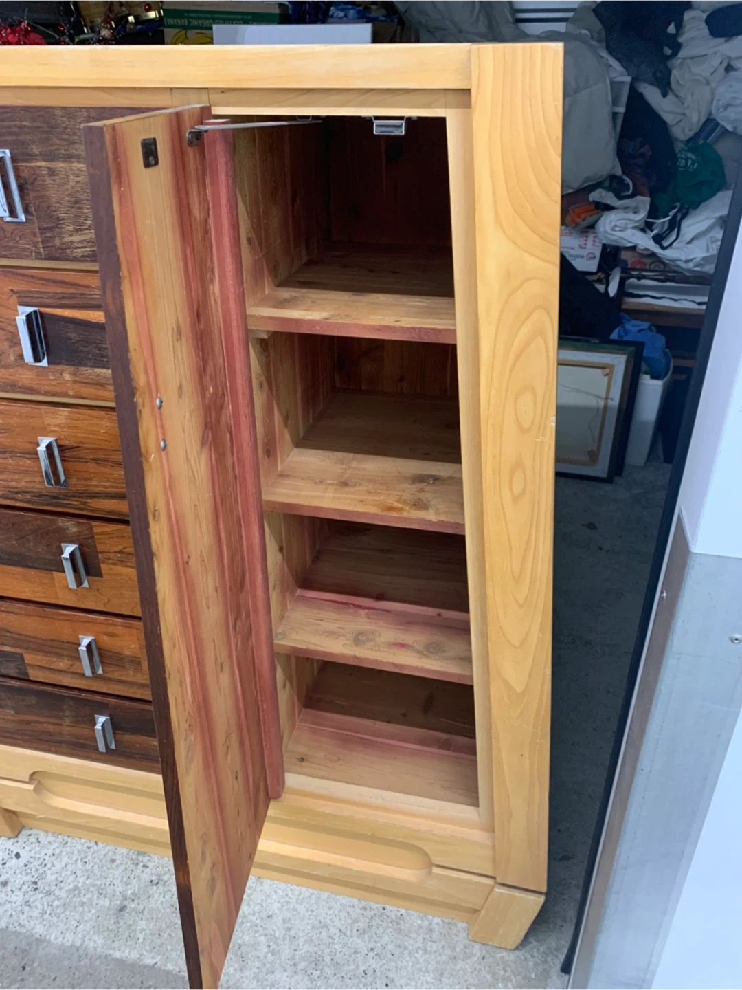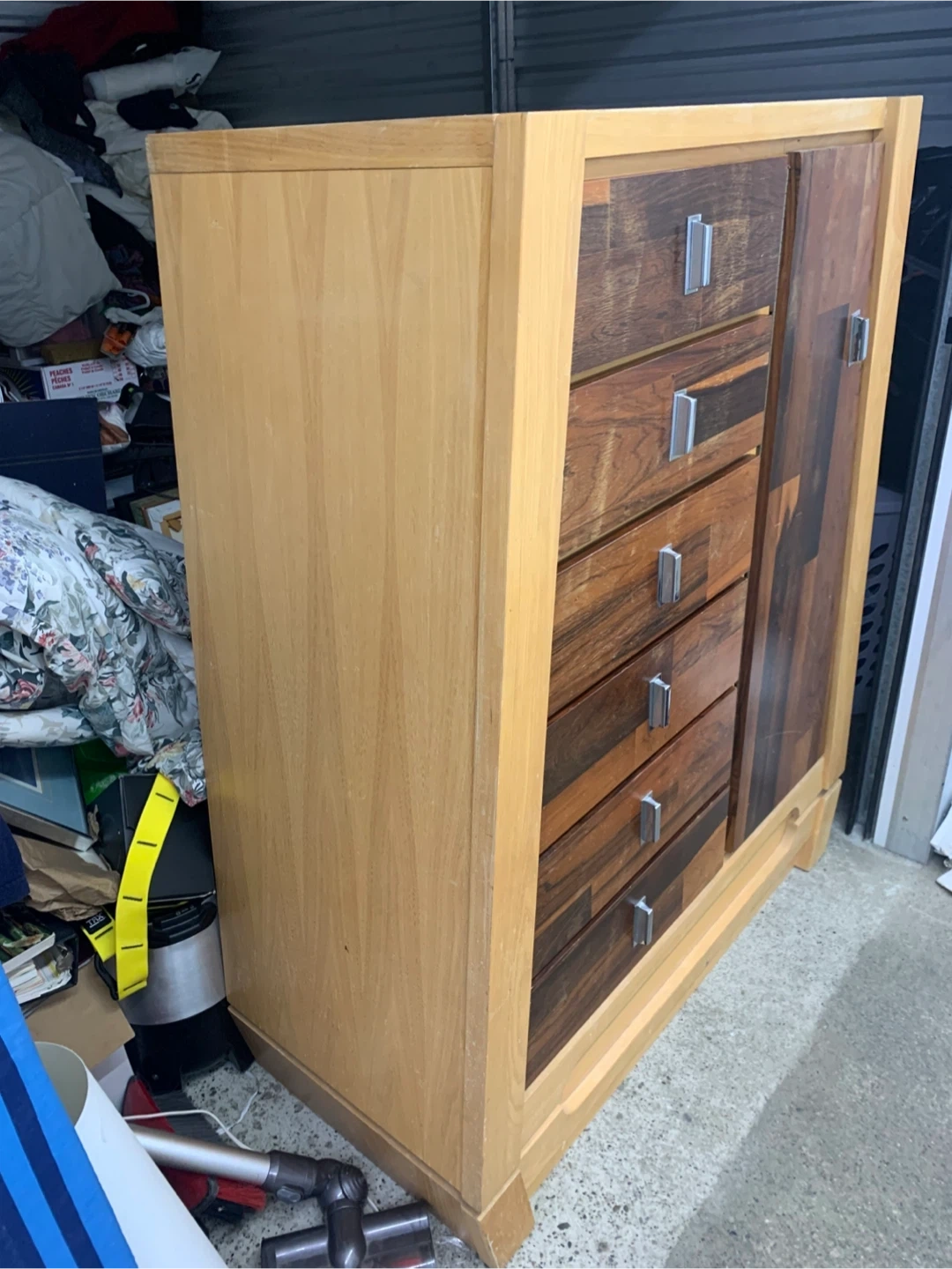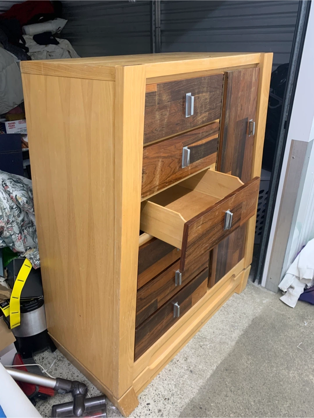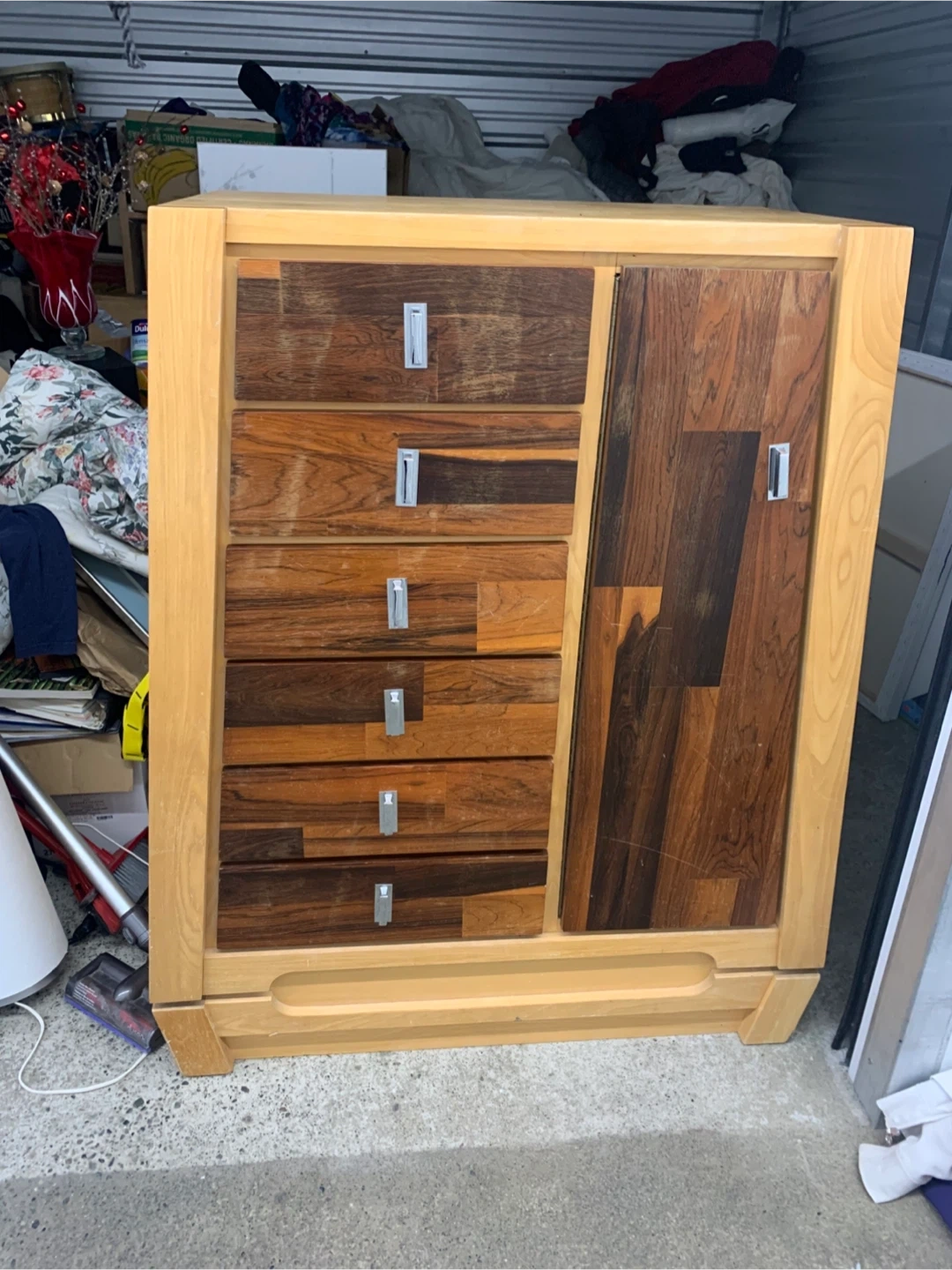 70Selling a wooden dresser that features a combination of drawers and a cabinet! The dresser has a light-coloured wooden frame with darker wood used for the drawer fronts and cabinet door. It offers plenty of storage space for your clothes and other items. It's in good condition and ready for a new home!