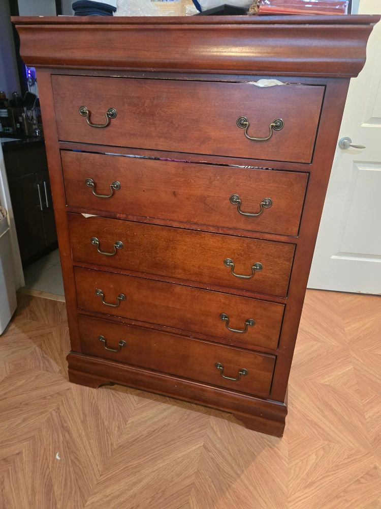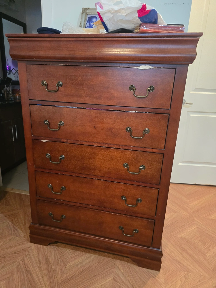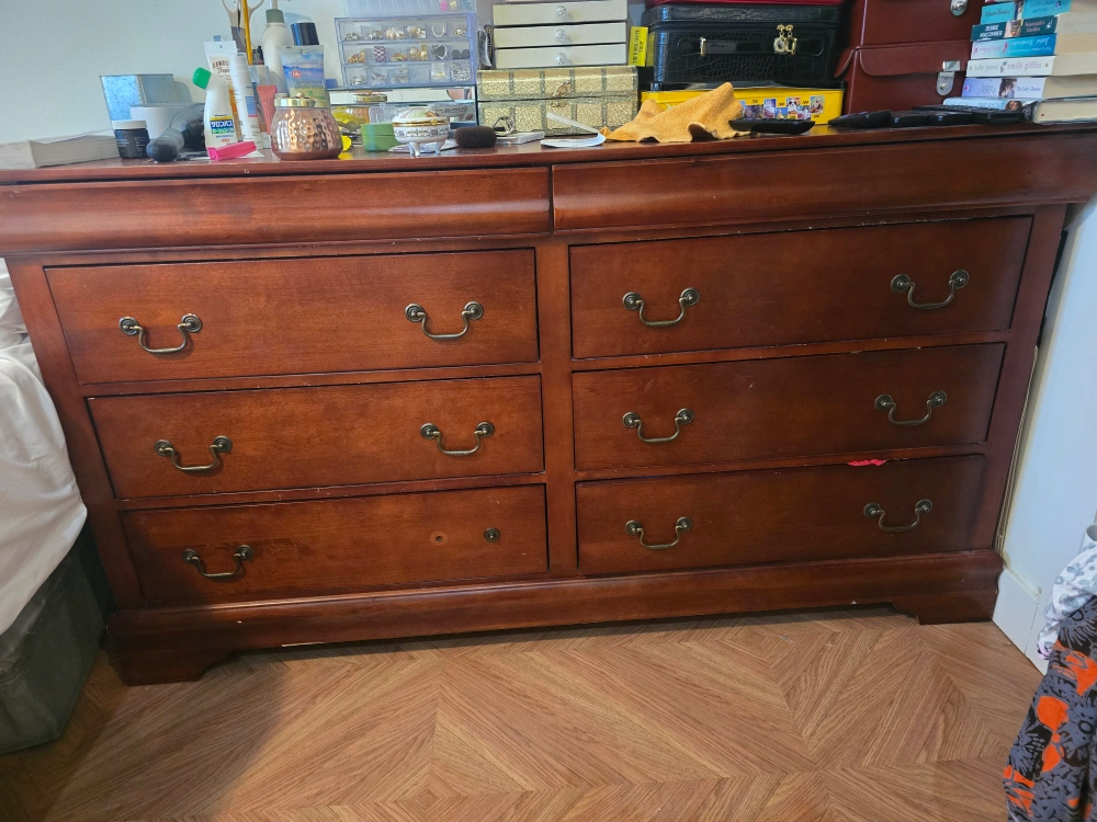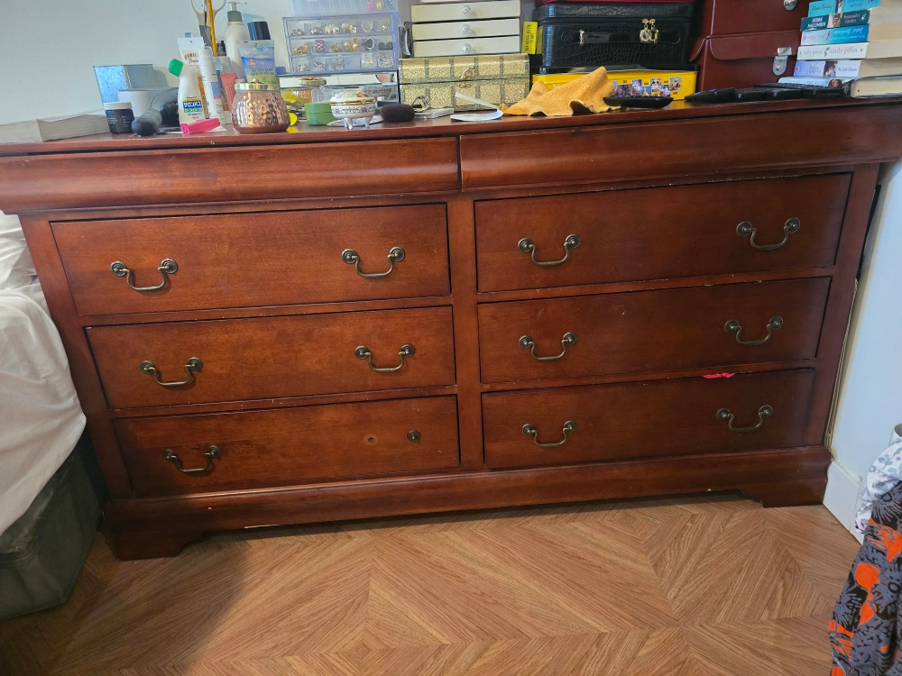 Here's a wooden dresser with multiple drawers, perfect for organizing your clothes and belongings. It shows some signs of use, but is still a functional piece of furniture for any bedroom or living space