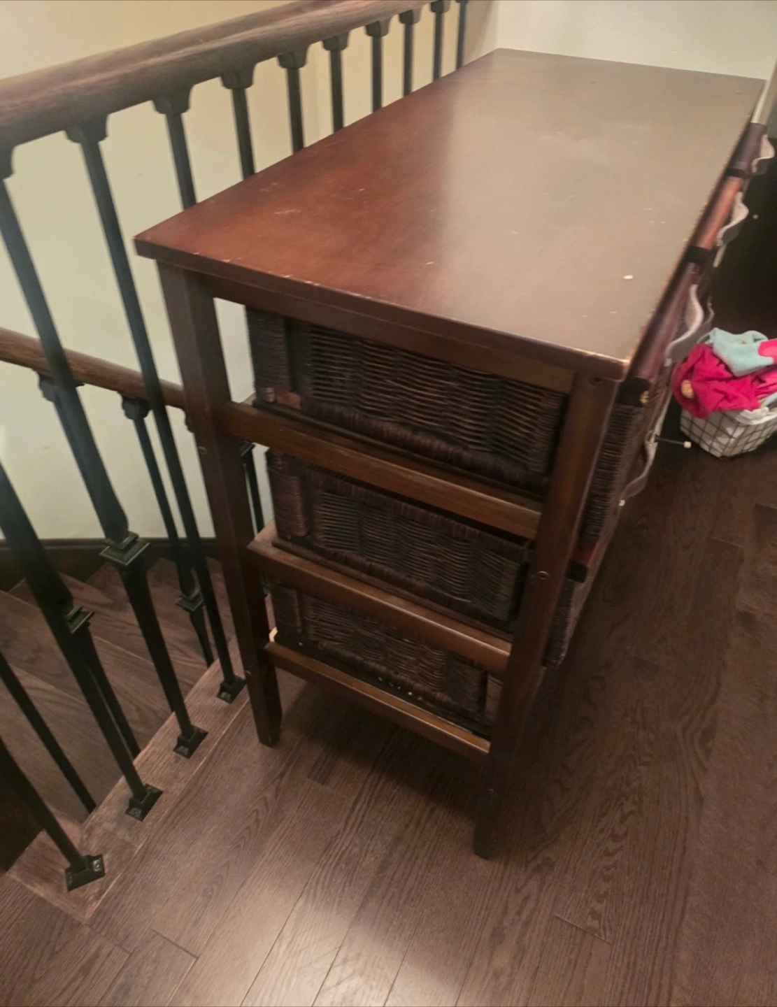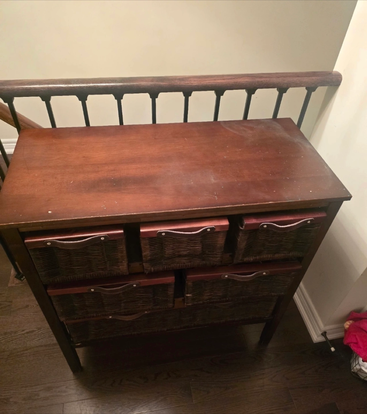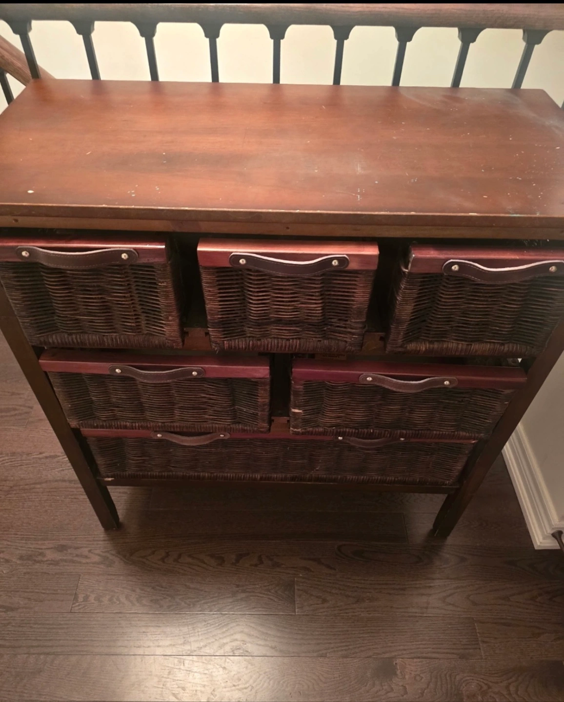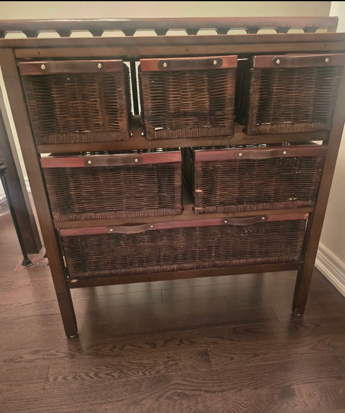 Selling a wooden dresser featuring six wicker baskets. It's perfect for adding a rustic touch to any room and provides ample storage space. The dresser is in good condition and ready for a new home!