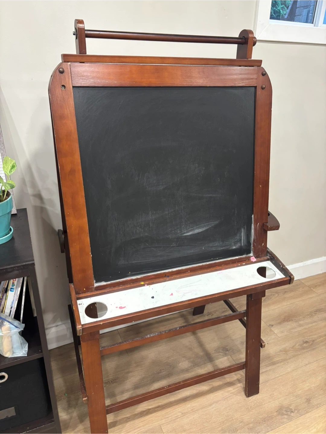 10Selling a wooden easel chalkboard. It's in good condition and would be perfect for a child's room or playroom. It has a classic look and is very sturdy