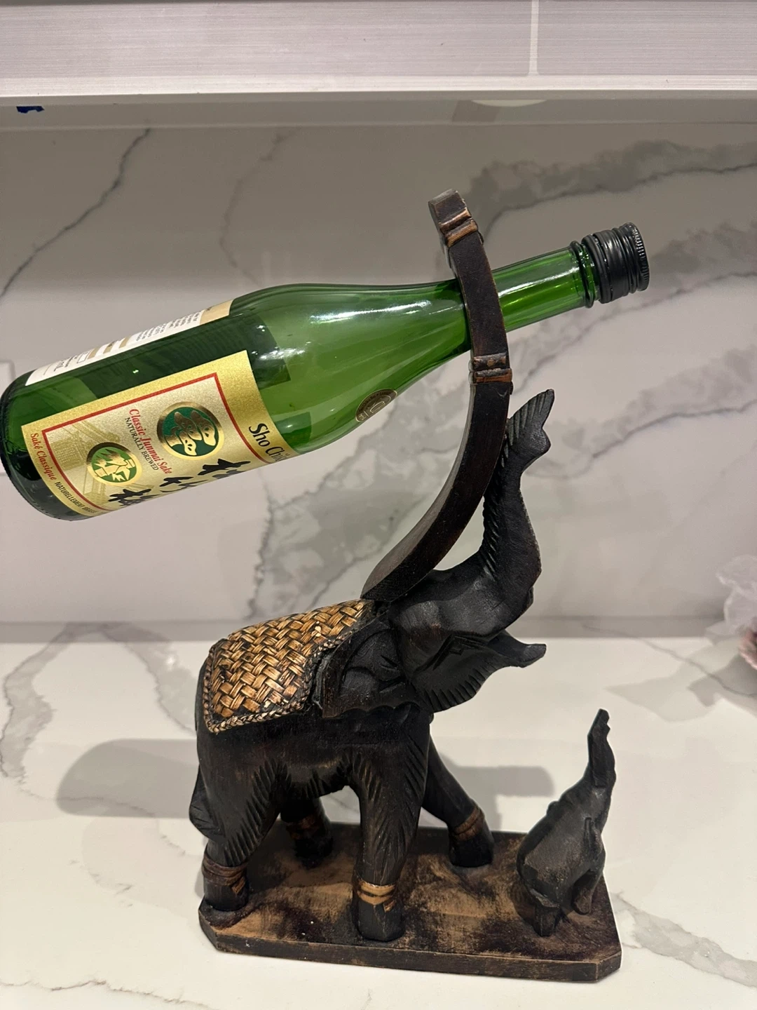 77This is a unique wooden elephant wine bottle holder. It features a larger elephant and a smaller baby elephant, both with intricate detailing. It's perfect for adding a touch of charm to your home decor