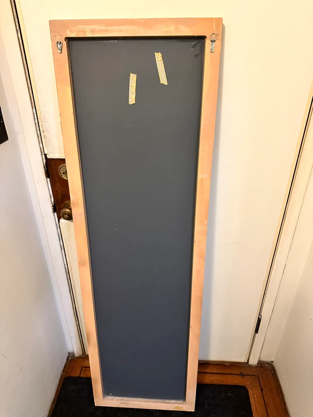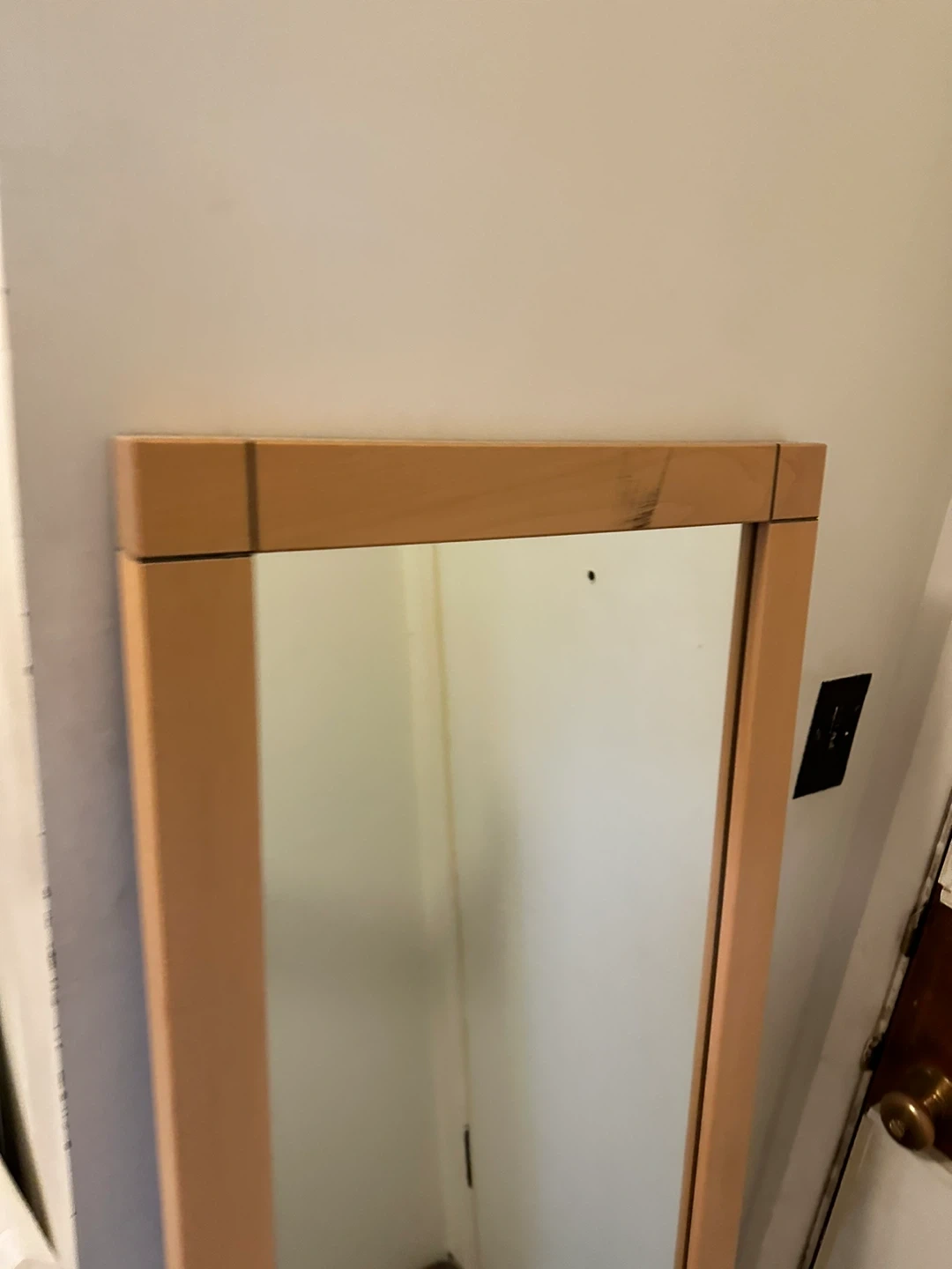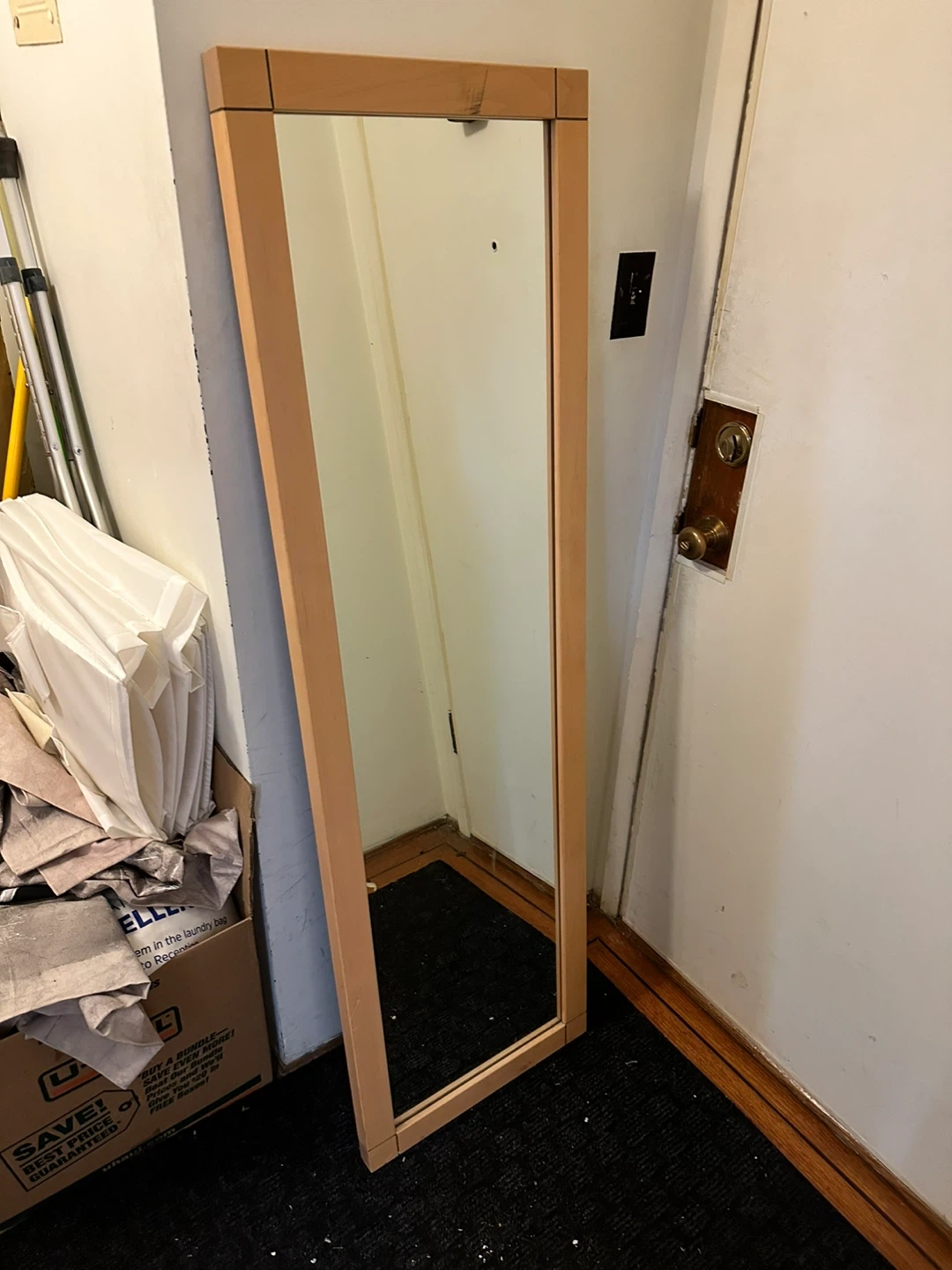 97Selling a full-length mirror with a light wooden frame It's in good condition and ready to brighten up your space Perfect for bedrooms, hallways, or dressing rooms Size = 5ft (60in) x 18in 152.4cm x 45.72cm Can hang on wall or lean on wall.