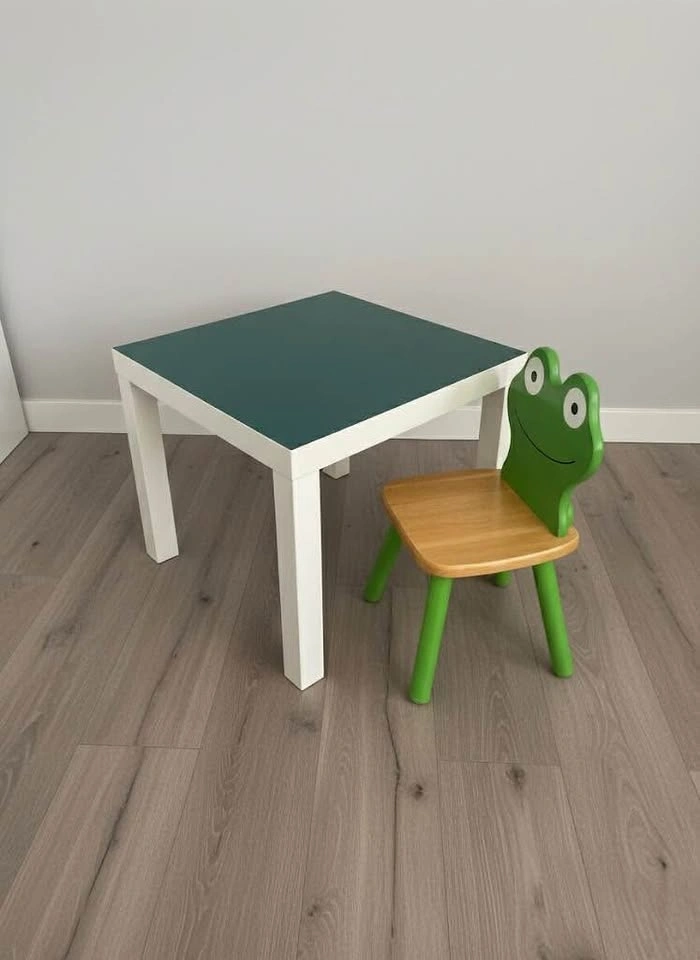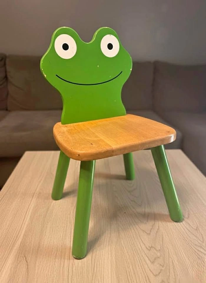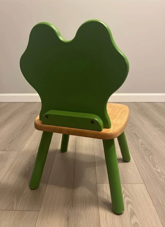 Adorable and sturdy wooden child's chair with a fun, bright green frog backrest. Perfect for a playroom, reading nook, or bedroom! Very good used condition. Solid wood construction. Bright colors with minor wear consistent with a well-loved piece. Will throw in the green IKEA table as well. Fits perfect together.