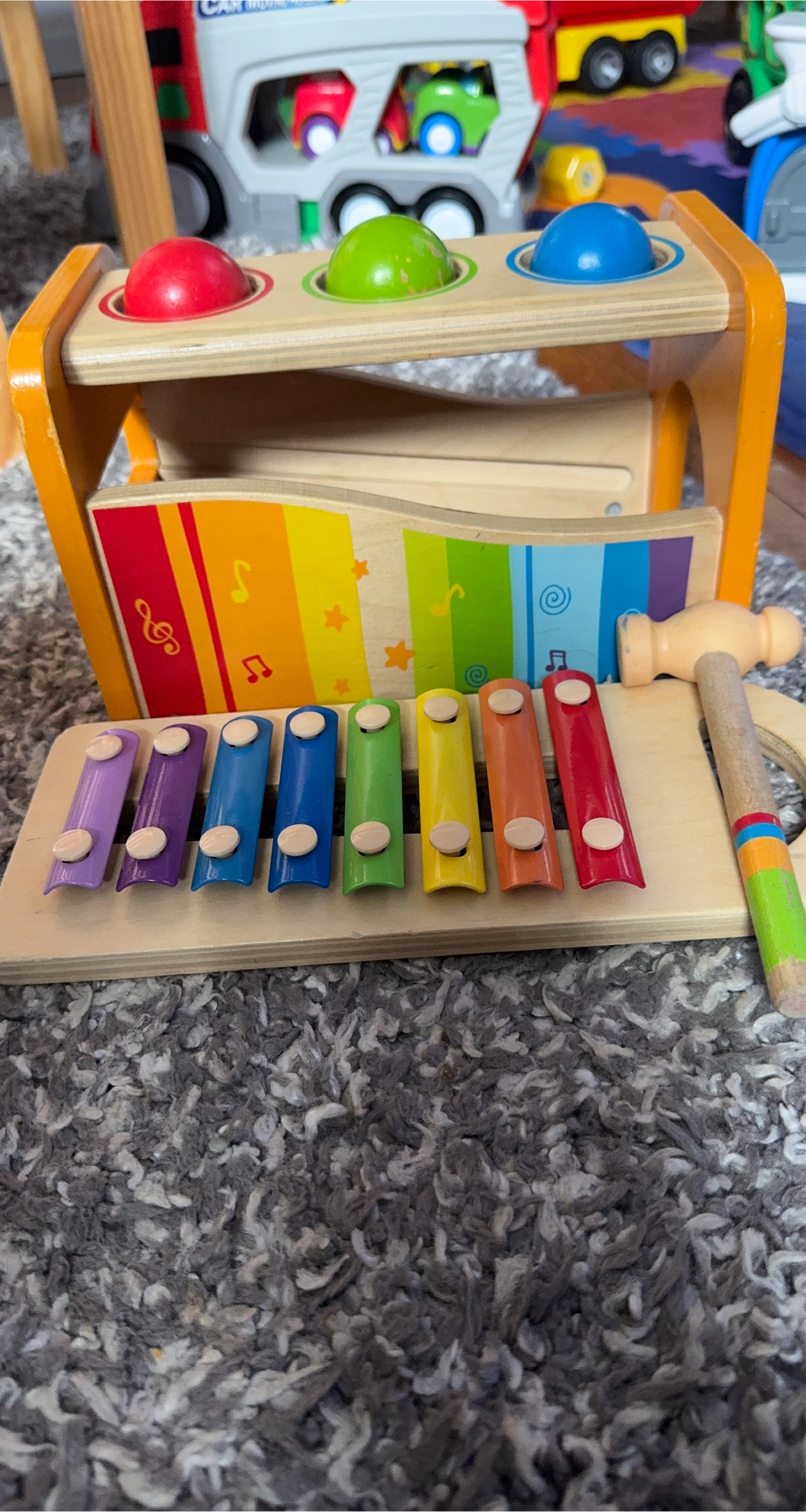 153This is a fun wooden toy that combines hammering and xylophone playing! It features colorful balls to hammer and a xylophone with different notes. It's great for developing hand-eye coordination and musical skills for little ones