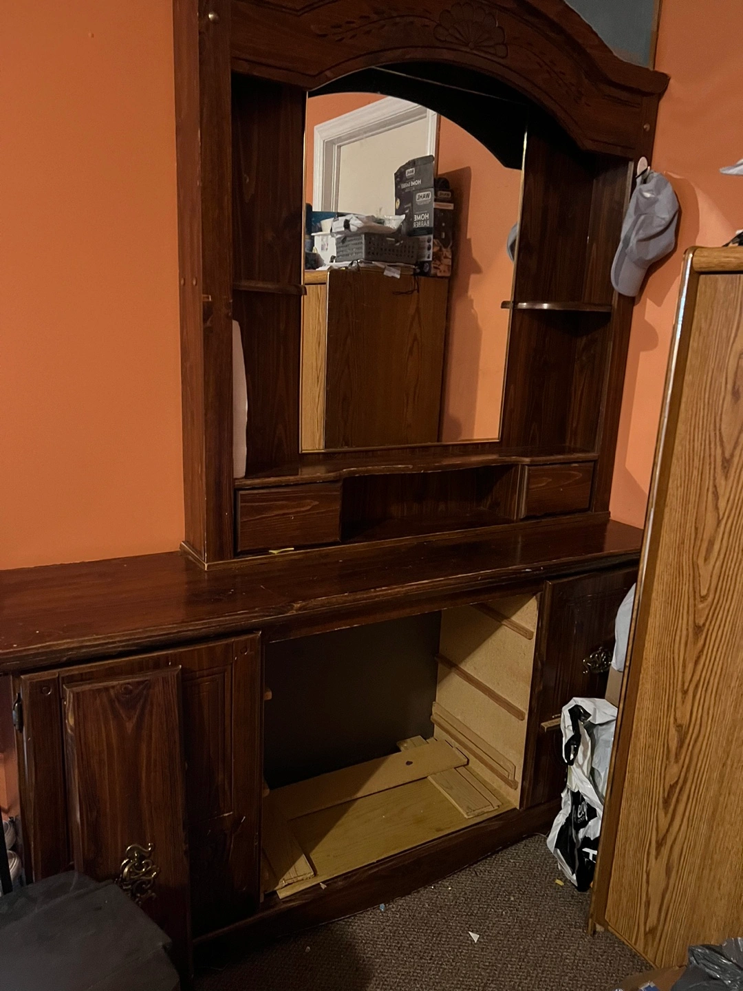 Selling a wooden hutch with a mirror. This piece offers storage and display options. It features a mirror, drawers, and cabinet space. It's in used condition, but still has lots of life left!