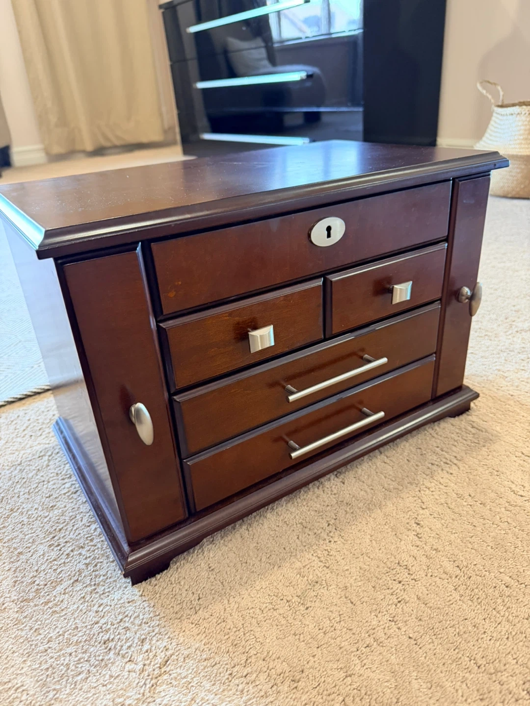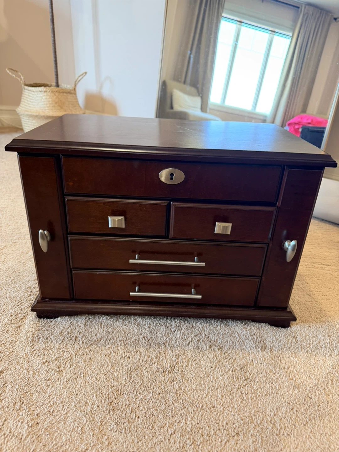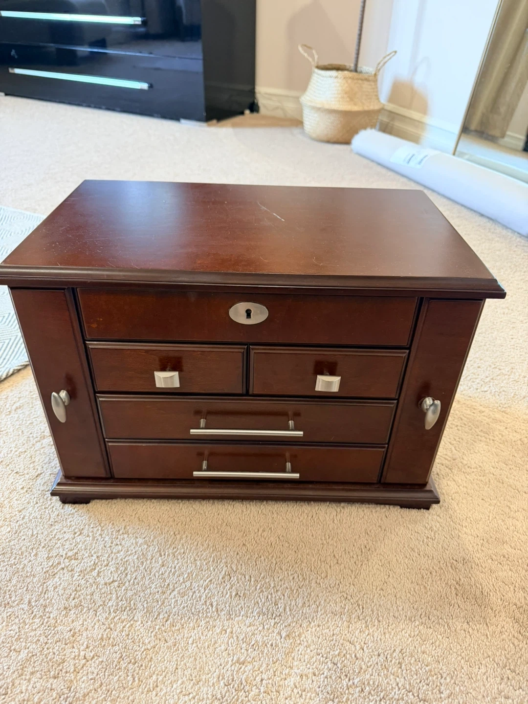 83Selling a lovely wooden jewelry box! It's in great shape and perfect for keeping all your treasures organized. It features a mirror and plenty of compartments for rings, necklaces, and more. A stylish addition to any bedroom or dressing room!