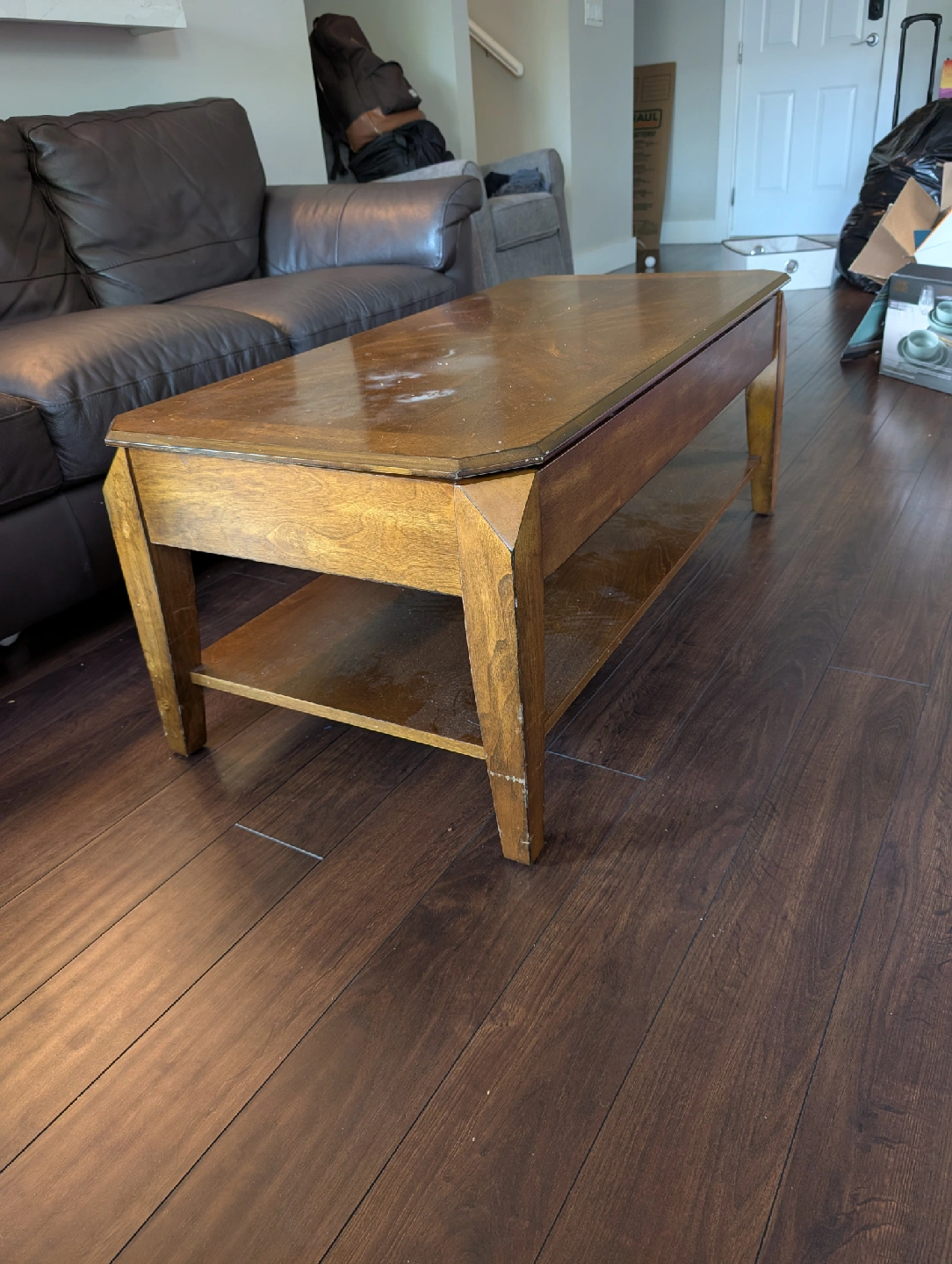 Selling a wooden lift top coffee table and matching side table. It has a unique design and a lift-top feature, which is great for working from home or enjoying a meal while watching TV. The table shows some signs of use, but it's still sturdy and functional. Perfect for adding a touch of warmth to your living room!