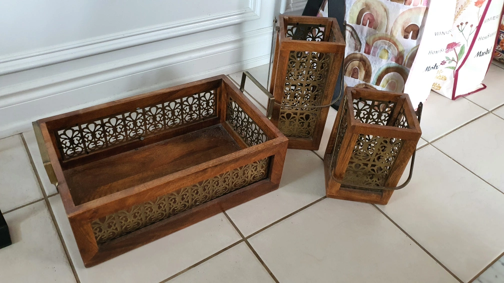 Here are some decorative storage baskets. They feature a wooden frame with metal detailing. Perfect for adding a touch of rustic charm to any room!