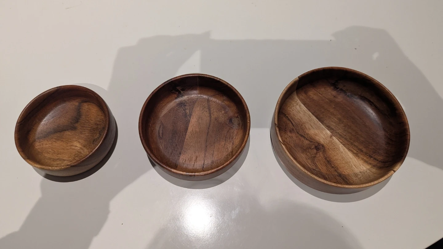 65Selling a set of three wooden nesting bowls. The largest bowl is approximately 6 inches in diameter. They're in great shape and perfect for serving snacks or organizing small items! Bundle with any of my other listings for a discounted price.