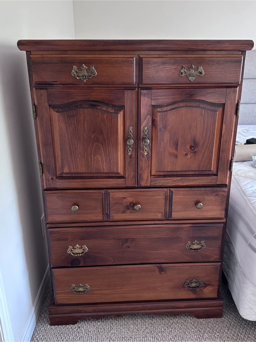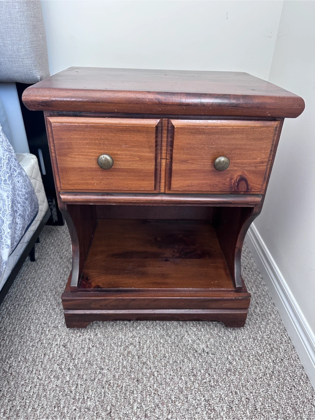 Selling a matching wooden nightstand and armoire set. Both pieces are in good condition and have a lovely warm tone. The nightstand features one drawer and an open shelf for storage, while the armoire offers ample space for clothing and other items.
