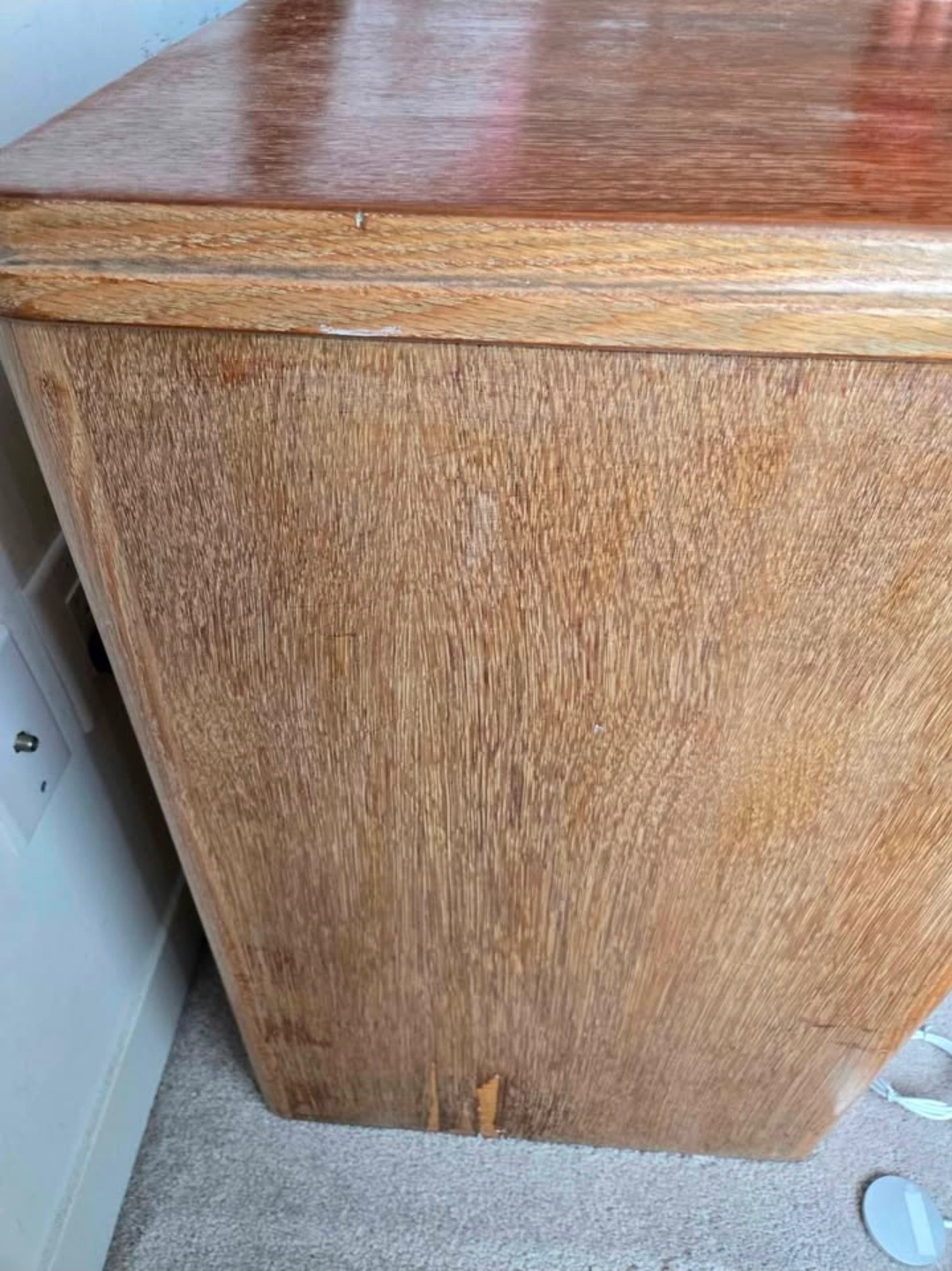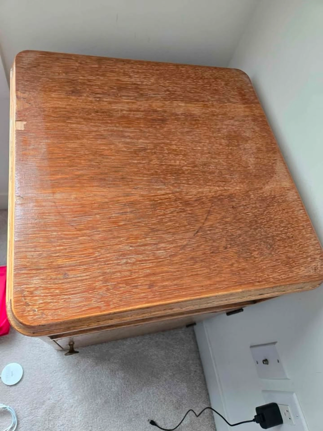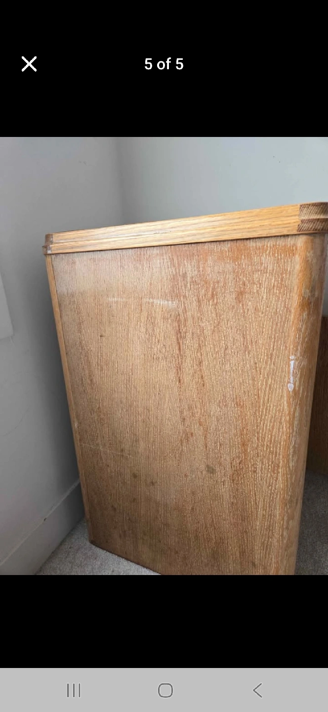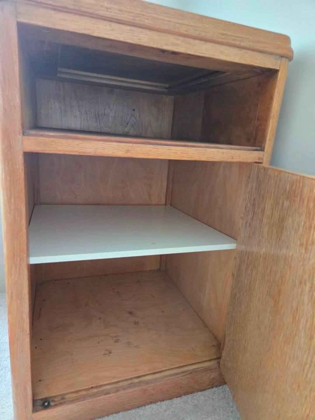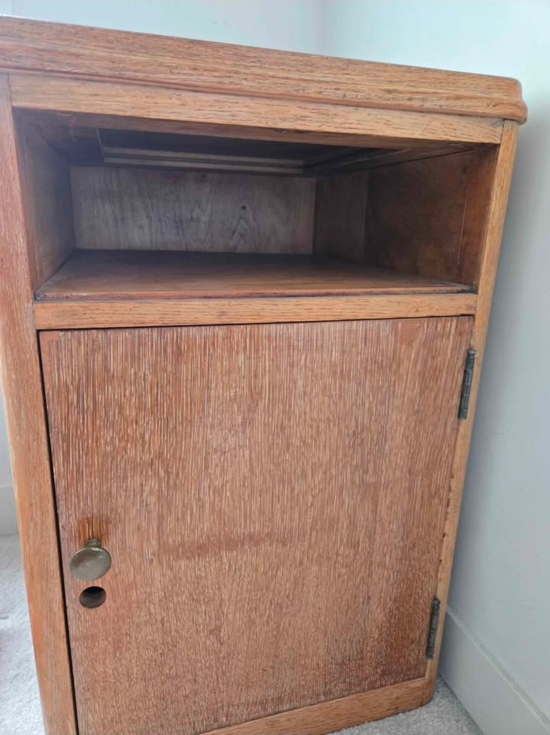 Selling a wooden nightstand with a door and open shelf. It has some wear and tear, as shown in the photos, but is still functional and sturdy. Perfect for adding some storage to your bedside! selling as it is!