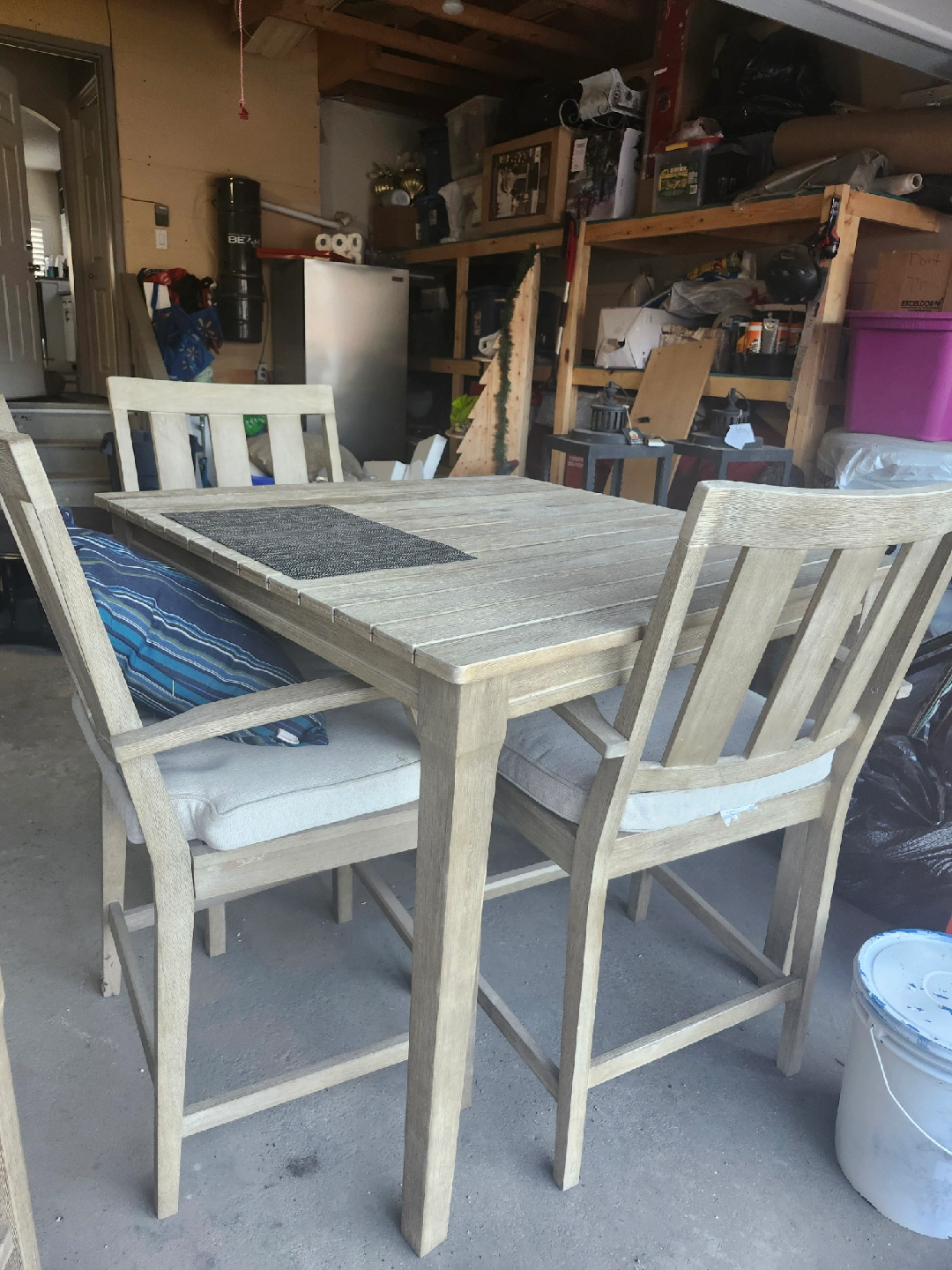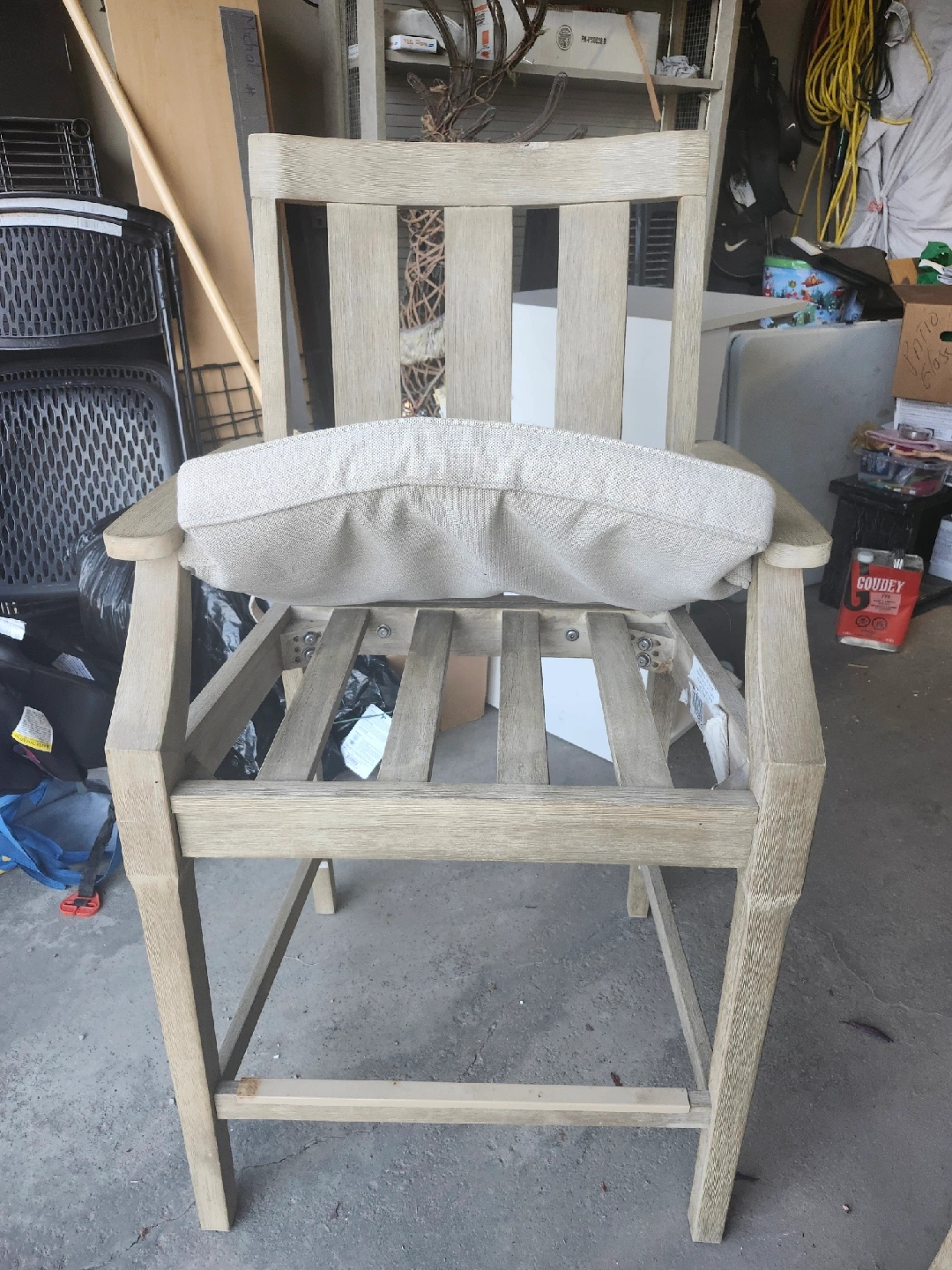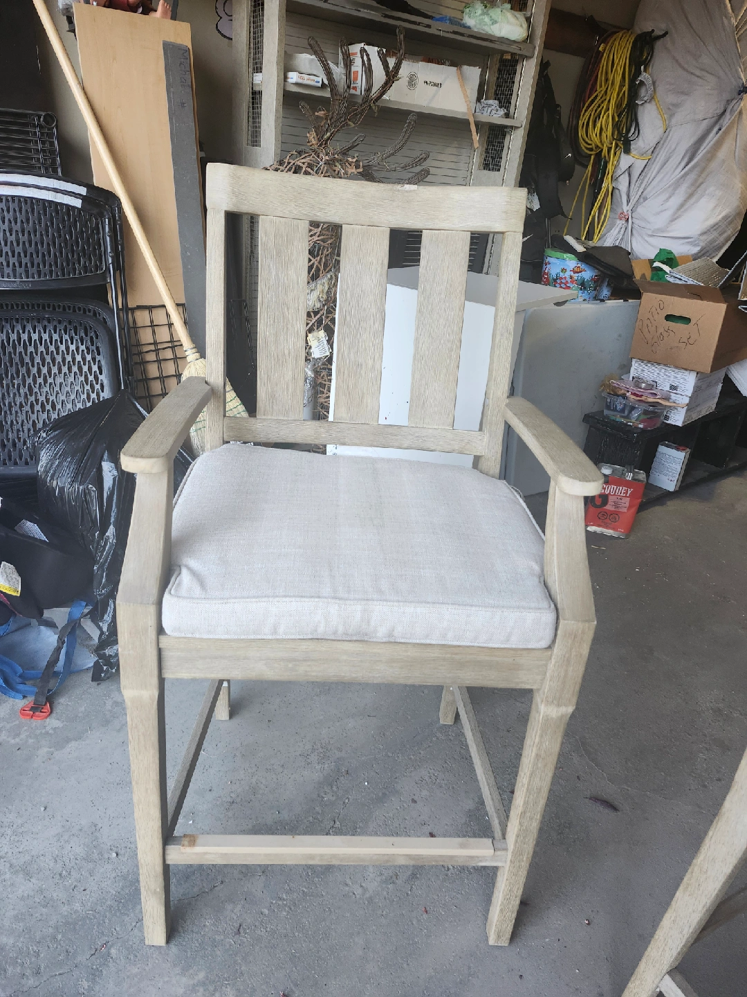 Selling a wooden outdoor dining chair. It comes with a comfy cushion. The chairs are in good condition except for a little gash in one of them. it would be a great addition to your patio or deck. Perfect for enjoying those summer evenings!