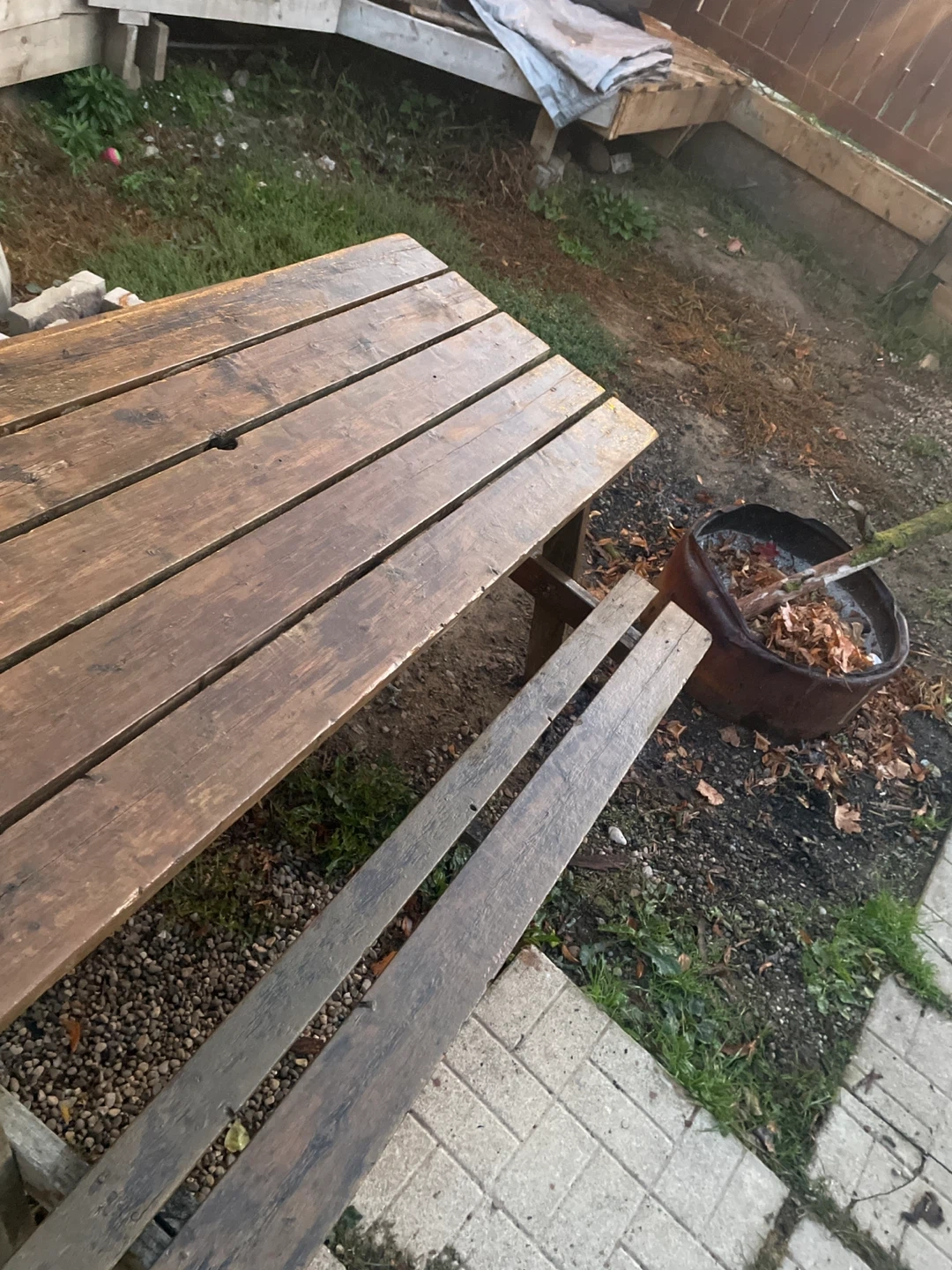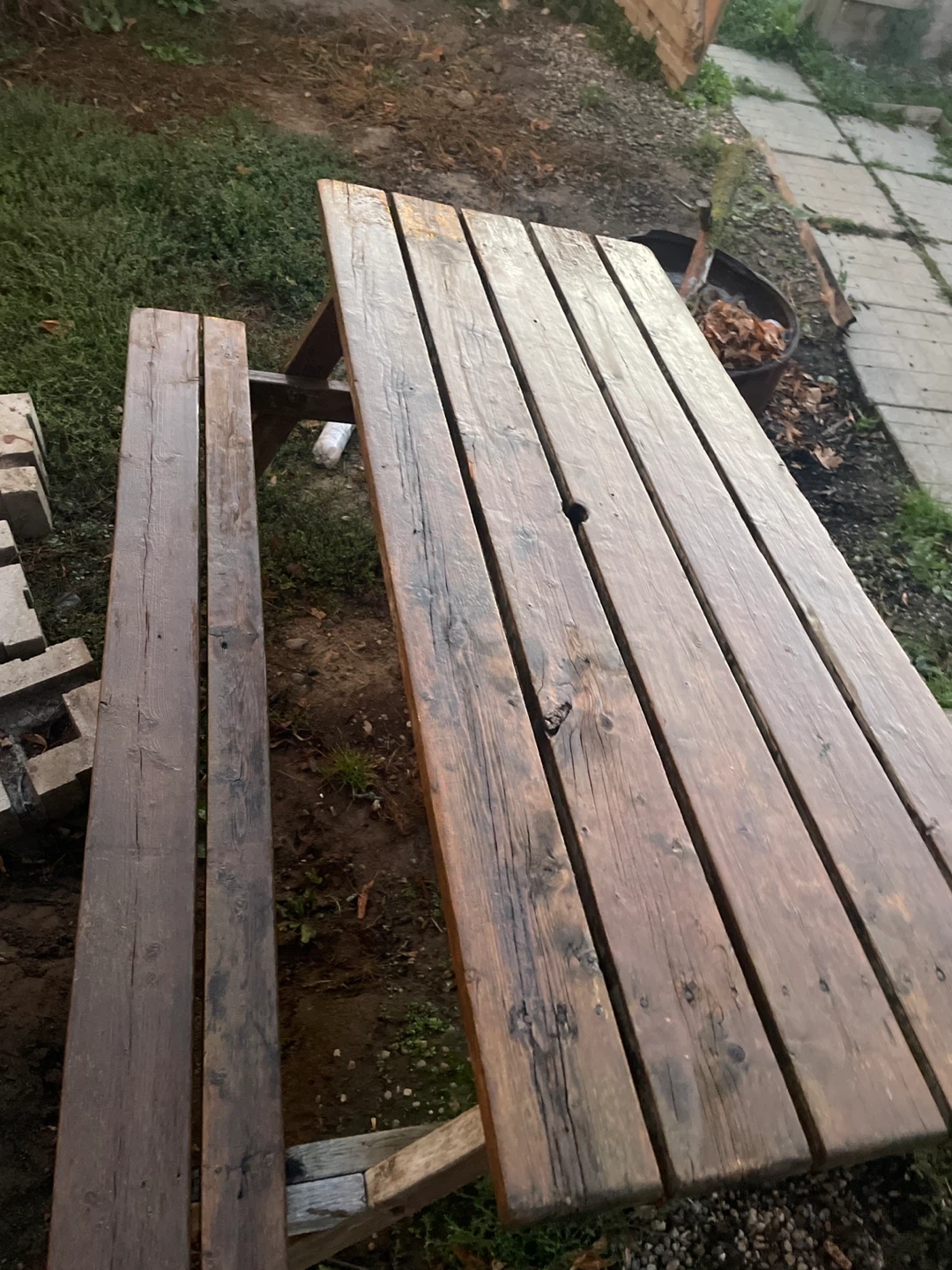 Selling a wooden picnic table. It's sturdy and perfect for outdoor gatherings or enjoying a meal in the backyard. It has a rustic look and feel.