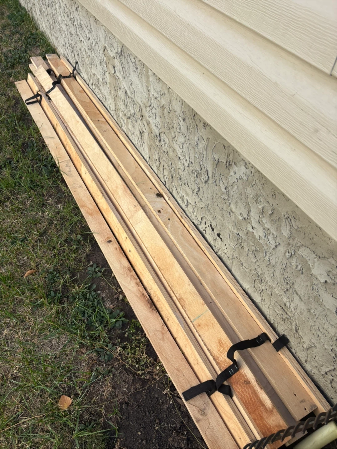 Selling some wooden planks, perfect for your next DIY project or home improvement! They are bundled together with black straps for easy transport