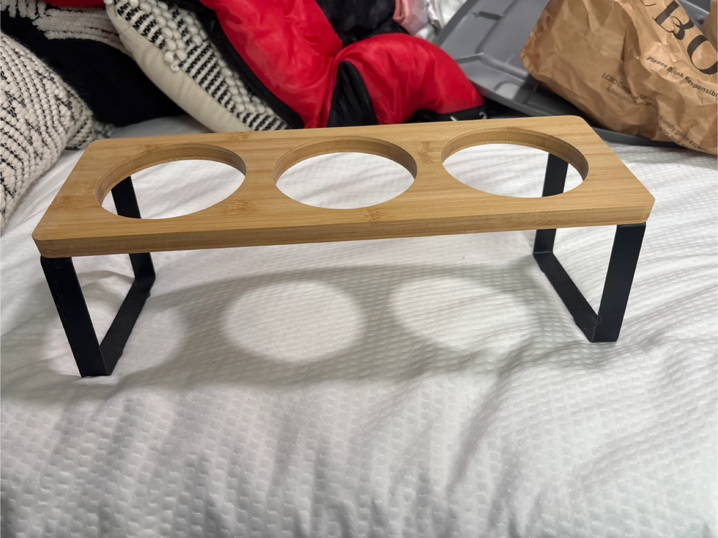 Selling a wooden plant stand with black metal legs! It has three circular cutouts on top, perfect for holding small potted plants or other decorative items. It's in great condition and ready to add a touch of style to your home