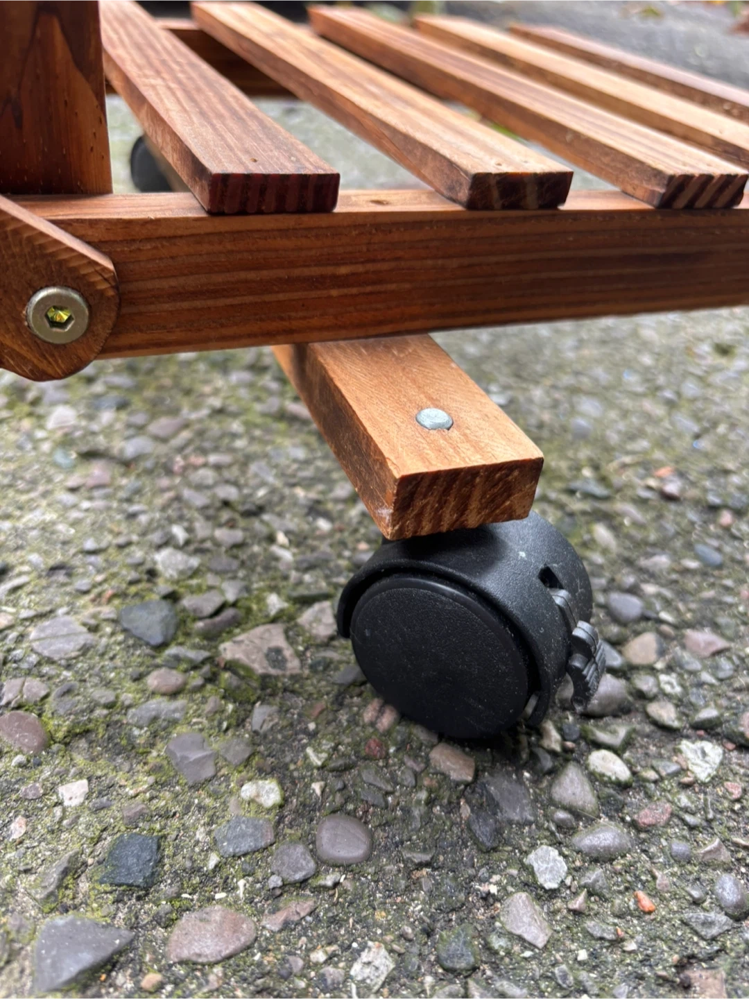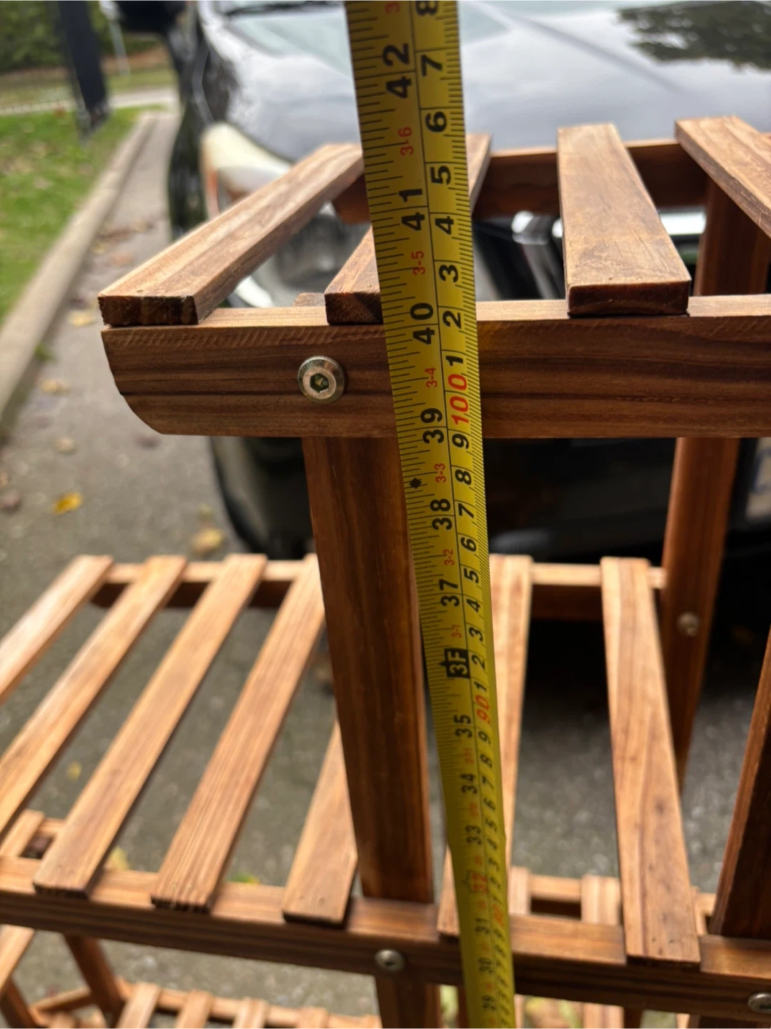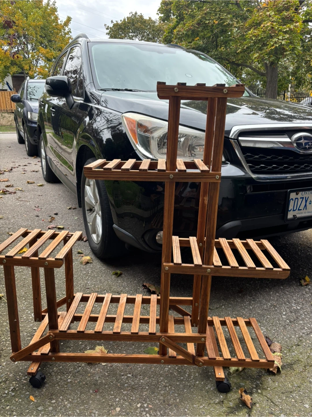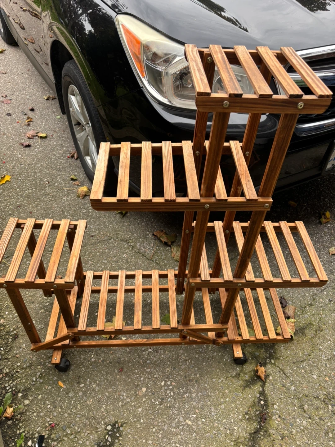 5 tier wooden plant stand with wheels. Holds six plants (or more depending on size)