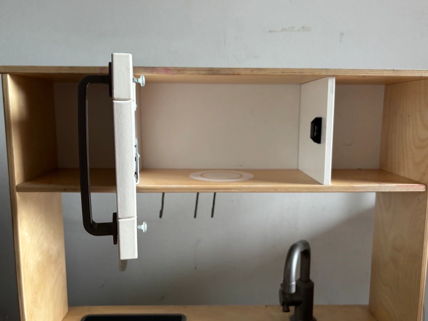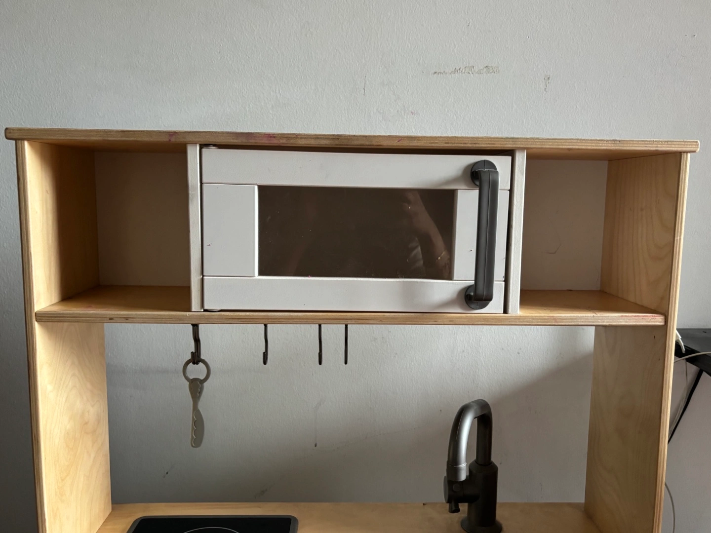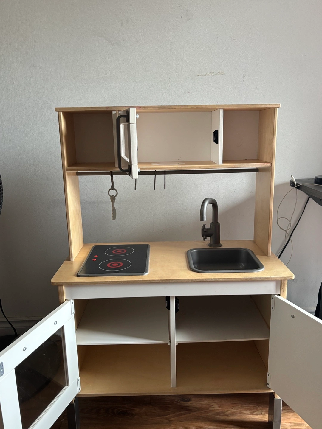 Adorable play kitchen. Features a microwave, stovetop, sink, and storage. Made of wood. Great for imaginative play.