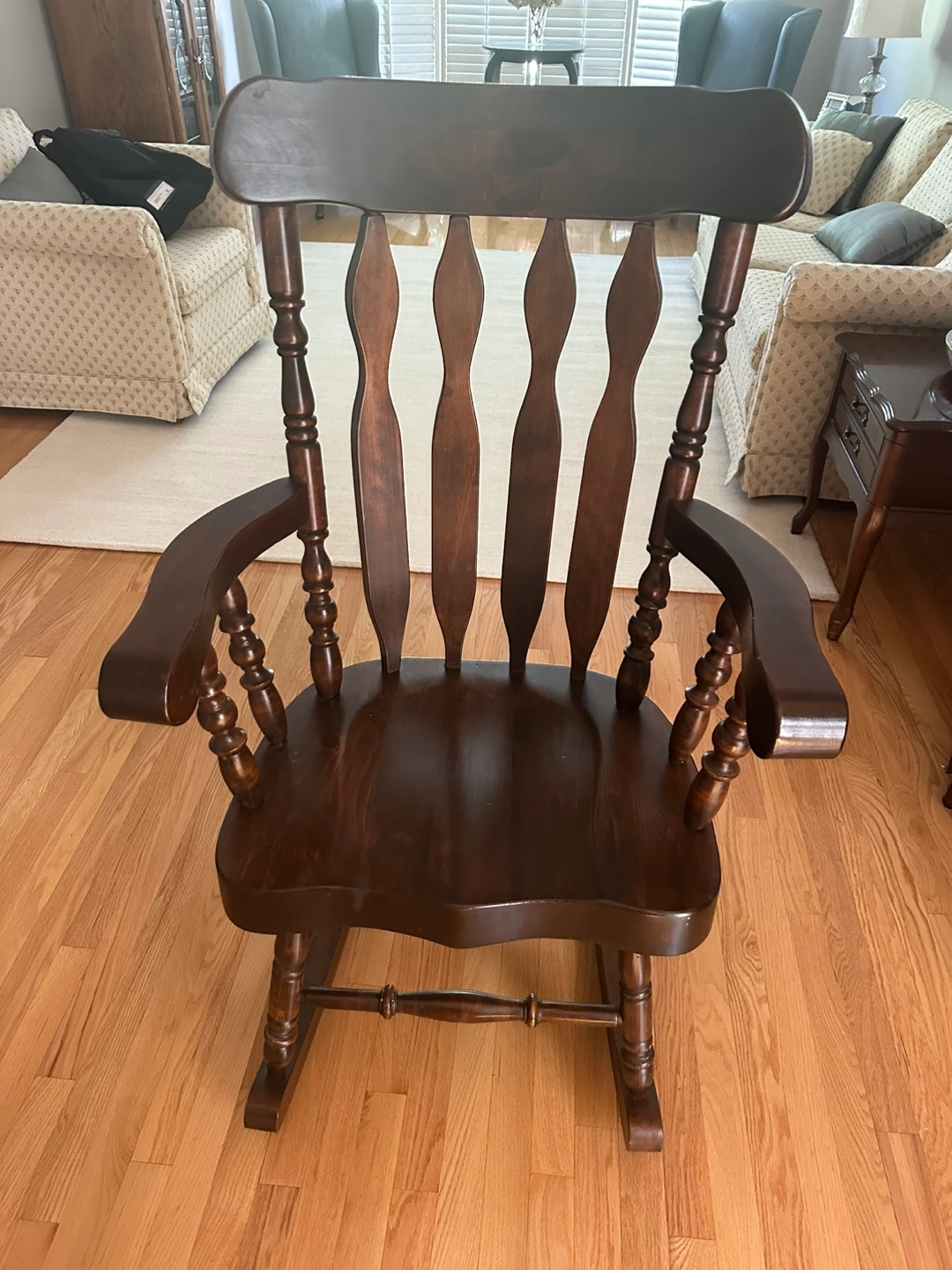 10Here's a lovely pine rocking chair, perfect for relaxing! It comes with a soft, light blue cushion for added comfort. The chair is in great condition and ready for a new home. It would look great in a living room or nursery