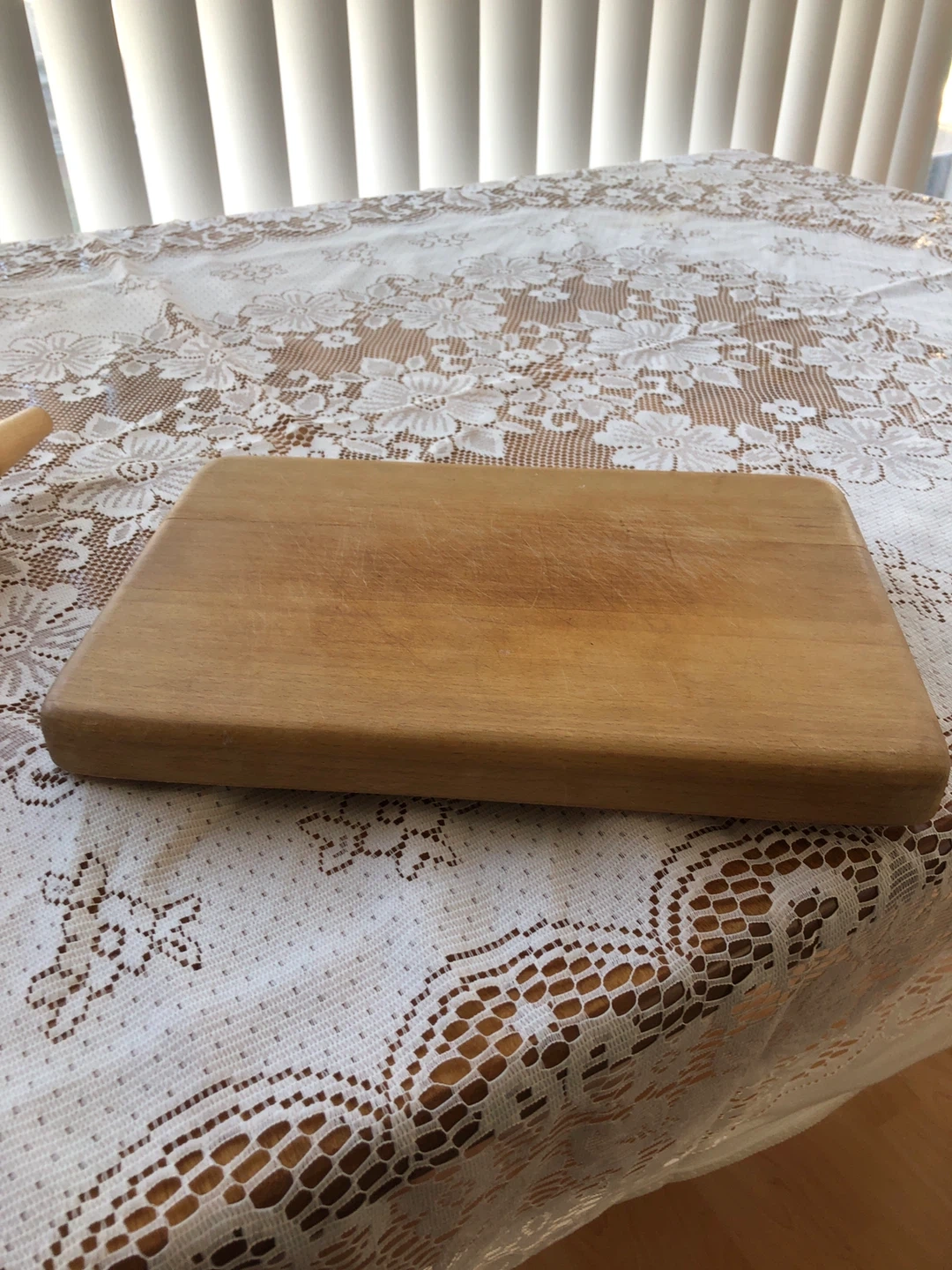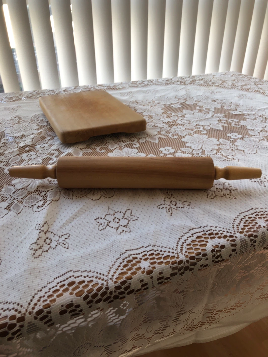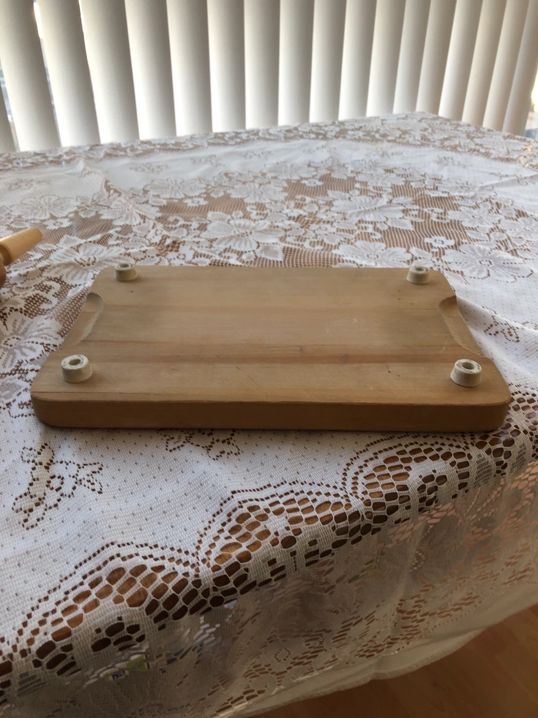 Selling a wooden rolling pin and cutting board set. Great for baking and food preparation! The cutting board has little feet on the bottom to keep it from sliding. It's in good used condition and ready for a new home