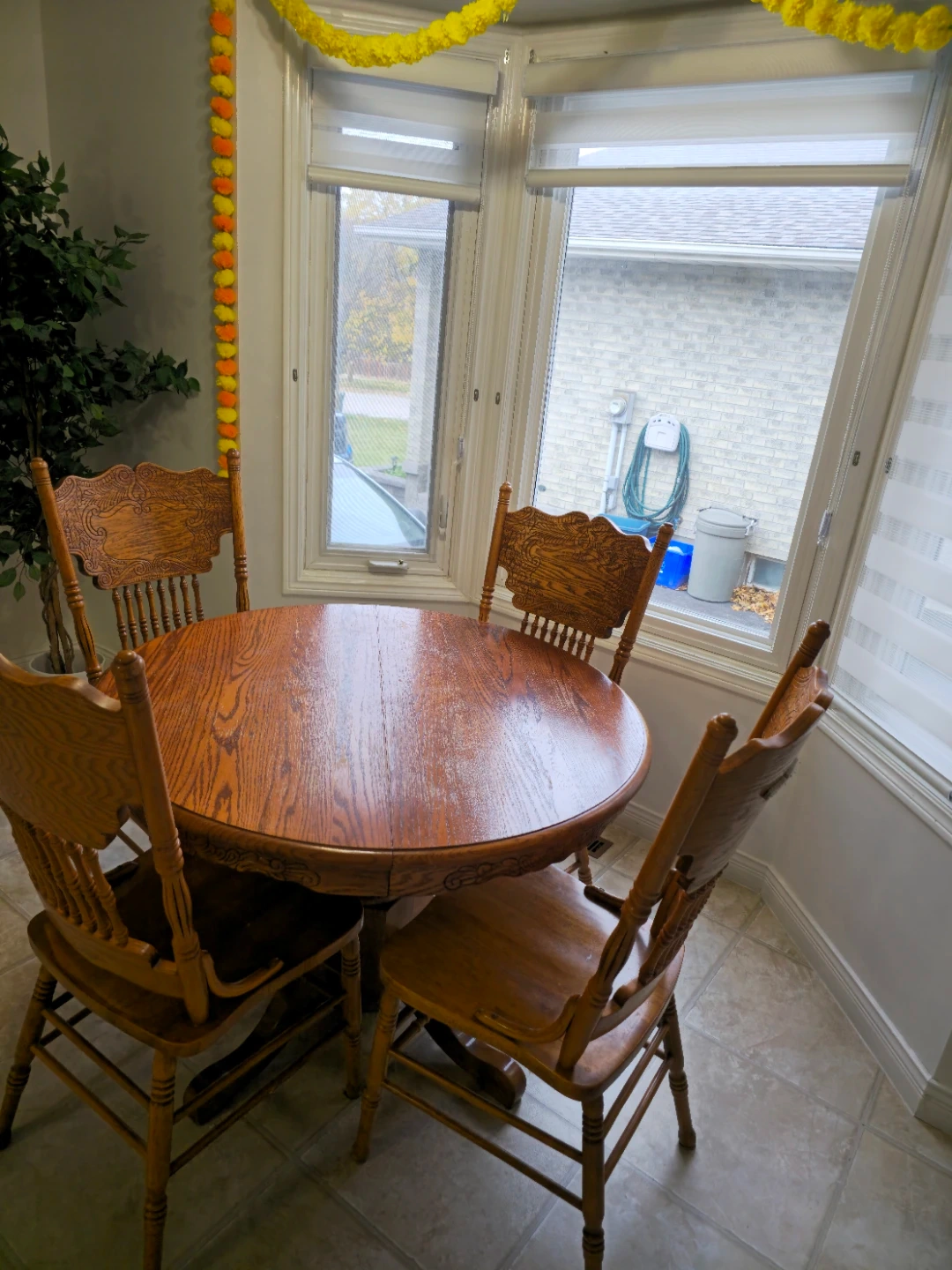 10Selling a solid wooden round dining table with four matching chairs. It's a beautiful set that would look great in any dining room or kitchen! The table and chairs are in good condition and ready for a new home