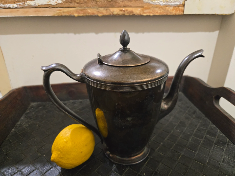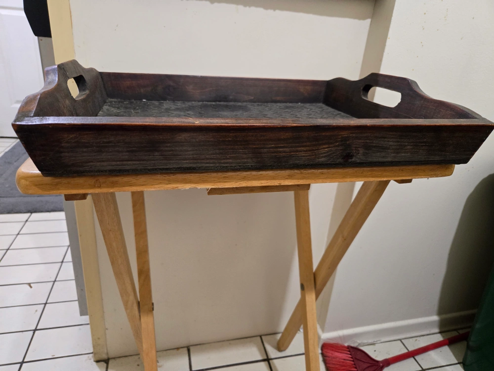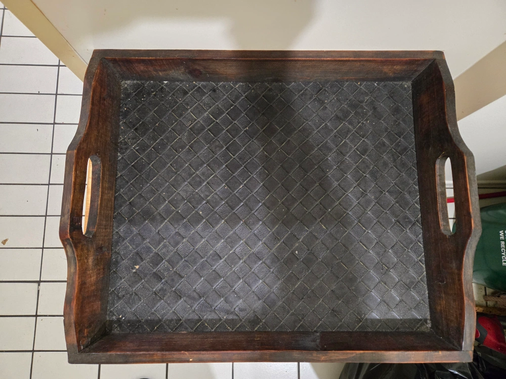 753Large wooden tray with black diamond pattern bottom. Good size for serving. Has two handles on either side. Perfect for serving tea, coffee, or snacks.