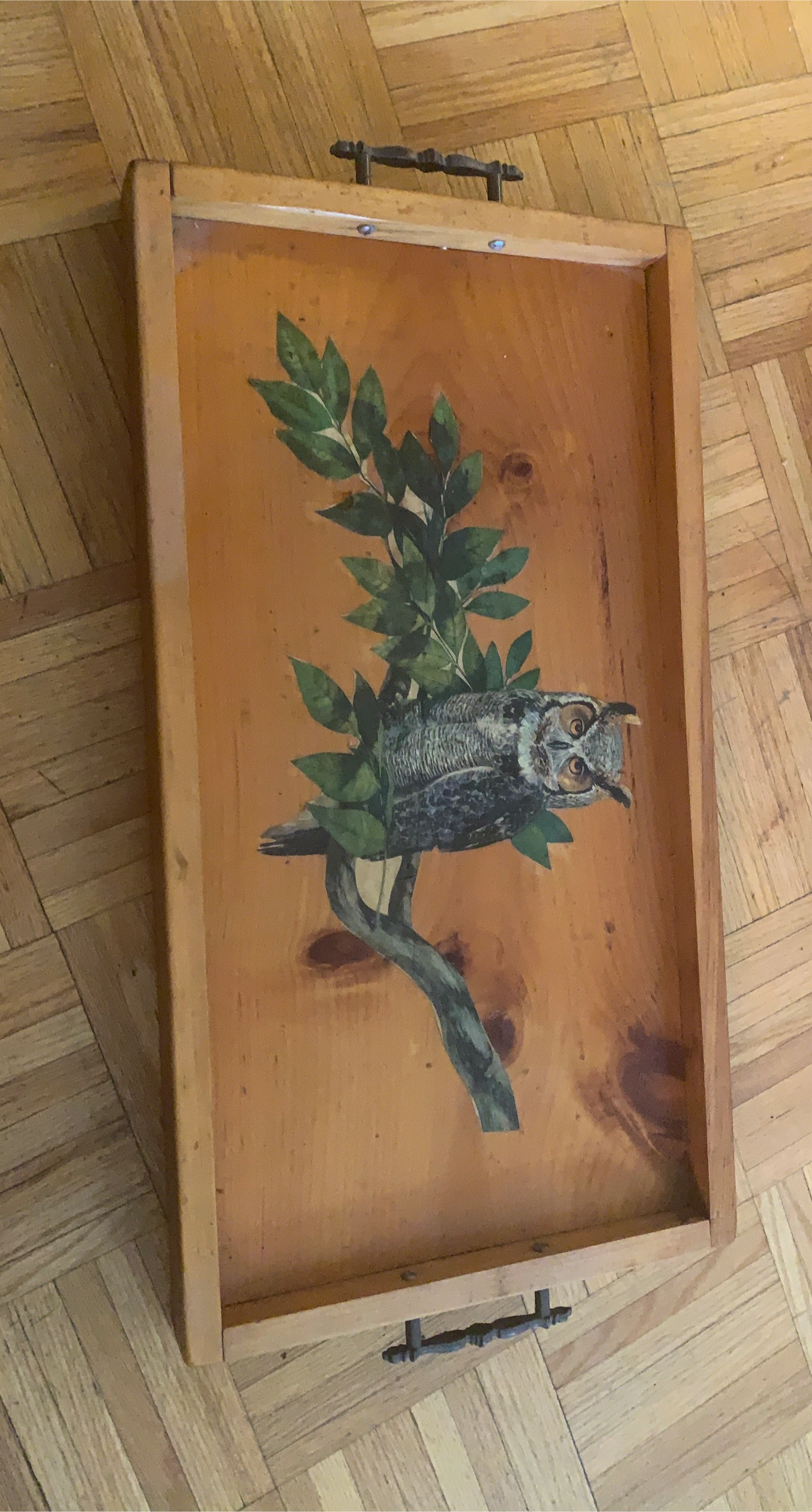 29Selling a wooden serving tray featuring a beautiful owl design! It's perfect for serving snacks or drinks, or even as a decorative piece. The tray has handles on each end for easy carrying. It's in great condition and ready for a new home