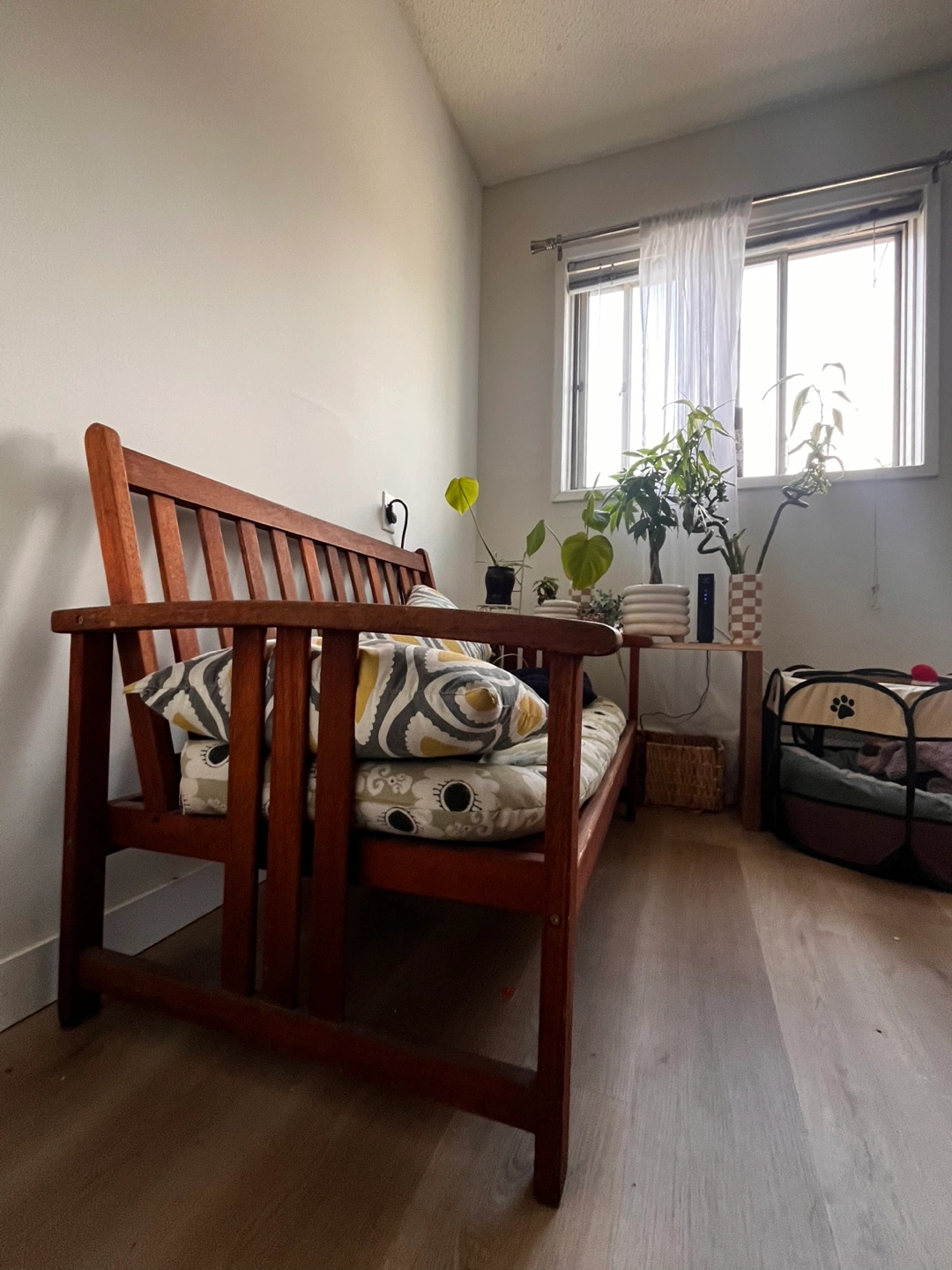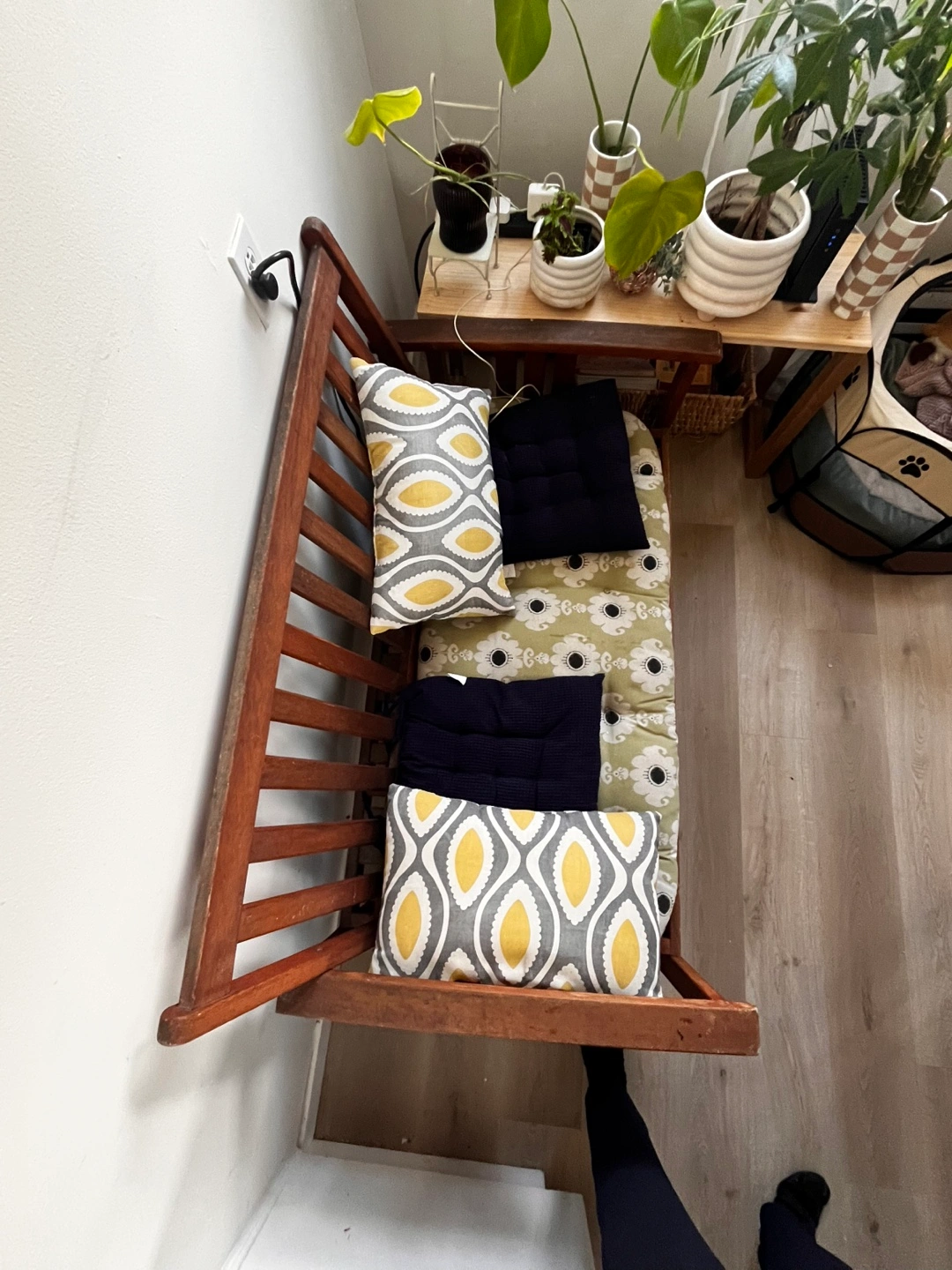 22Selling a charming wooden settee bench, perfect for adding a touch of rustic comfort to your home! It comes with patterned cushions, adding a cozy feel to any space. It's a lovely piece of furniture to relax on!