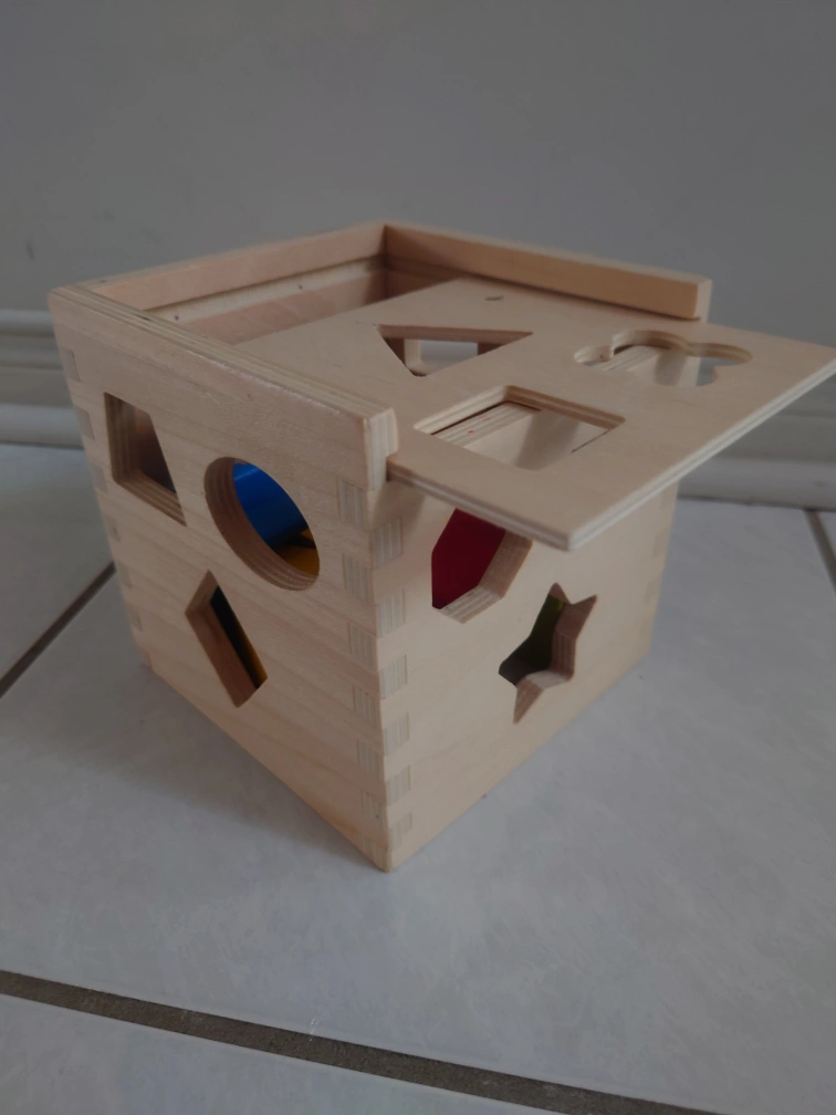 Adorable wooden shape sorter cube. Includes colourful shapes. Great for toddlers. Fun and educational.