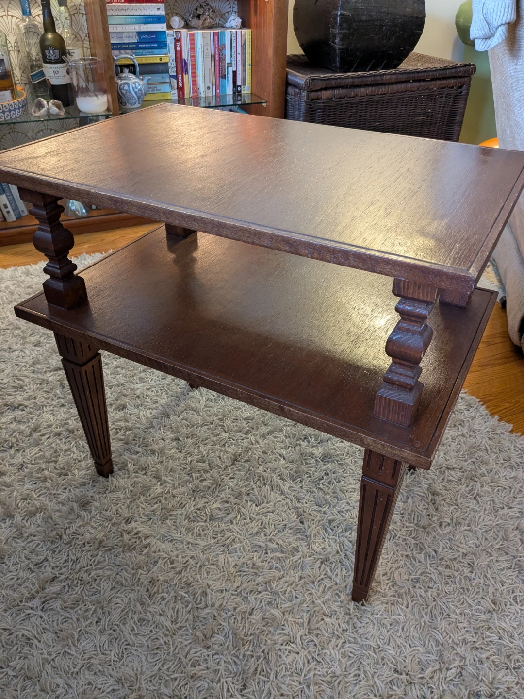 This is an old, retro side table-- my grandparents had their box TV on it in the '70s and '80s...maybe even earlier! Would make a fun DIY project, I had ideas to paint this a vibrant colour and show off those spindle shapes. But I just don't have a spot for it anymore, sadly. 24" long x 16" wide x 23" tall Pick up near Keele and Eglinton