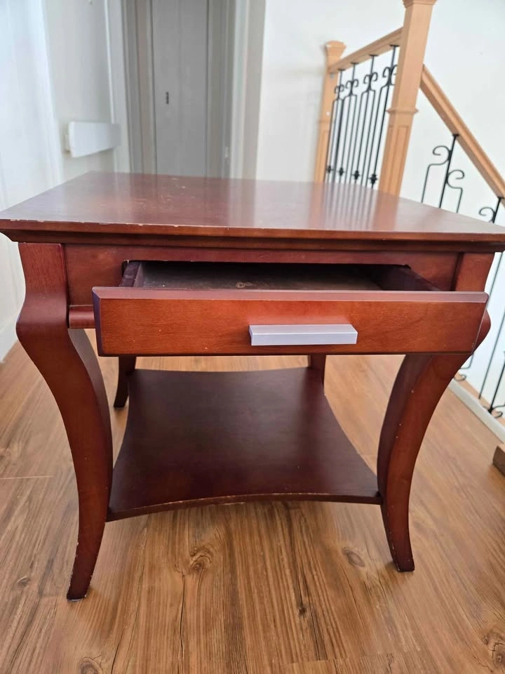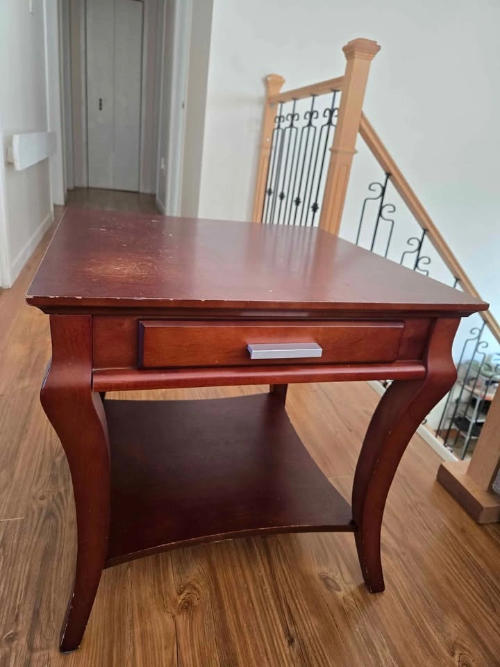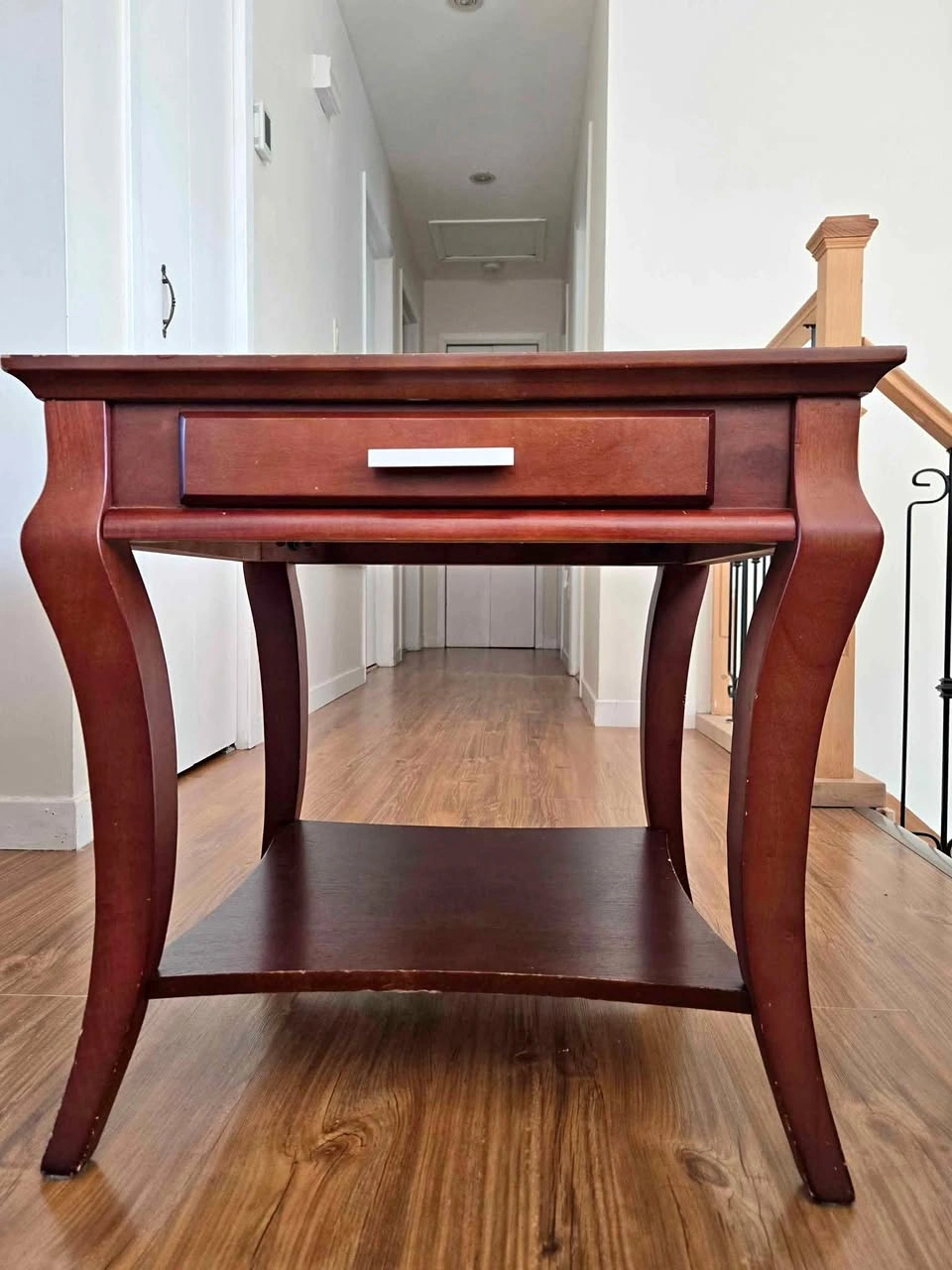60Wooden side table with a small drawer — perfect to use as an end table beside the sofa or a nightstand next to the bed. Nicely polished finish with minor surface scratches from normal use, but still in great condition. Can easily be repolished for a fresh look, and its classic design blends beautifully with any furniture style. Height 21.5" Weight 22.5" Length 22.5"