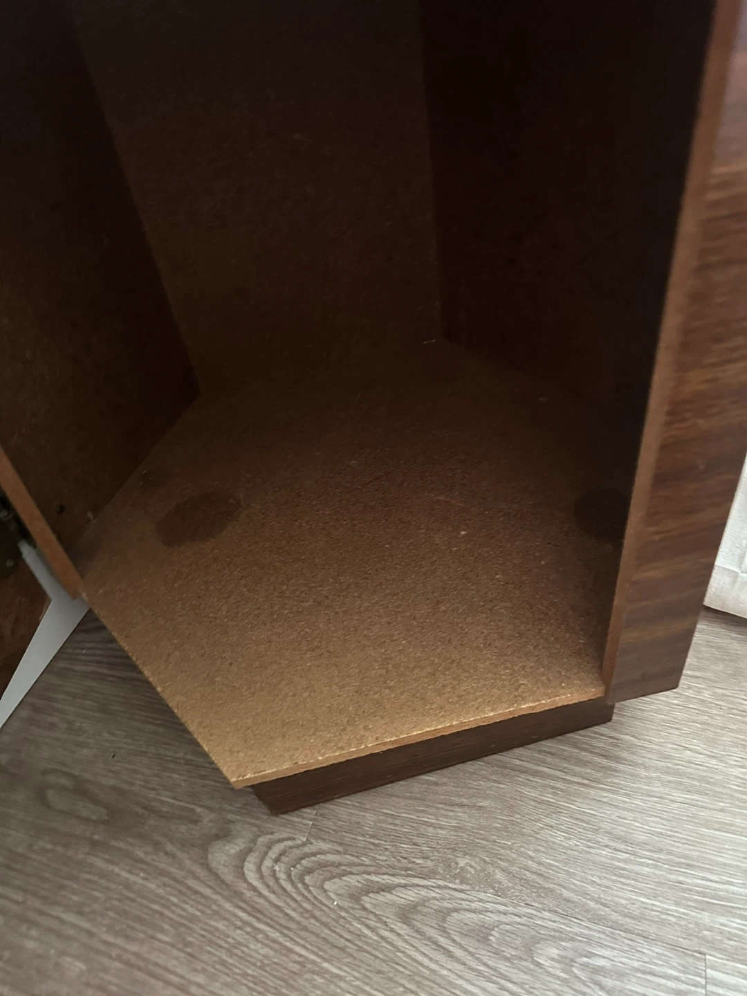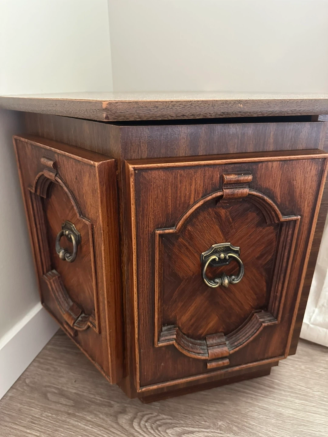 162Selling a wooden side table with a door. It features a unique hexagonal shape and a rich, dark wood finish. It would be a great addition to any living room or bedroom as a bedside table or accent piece