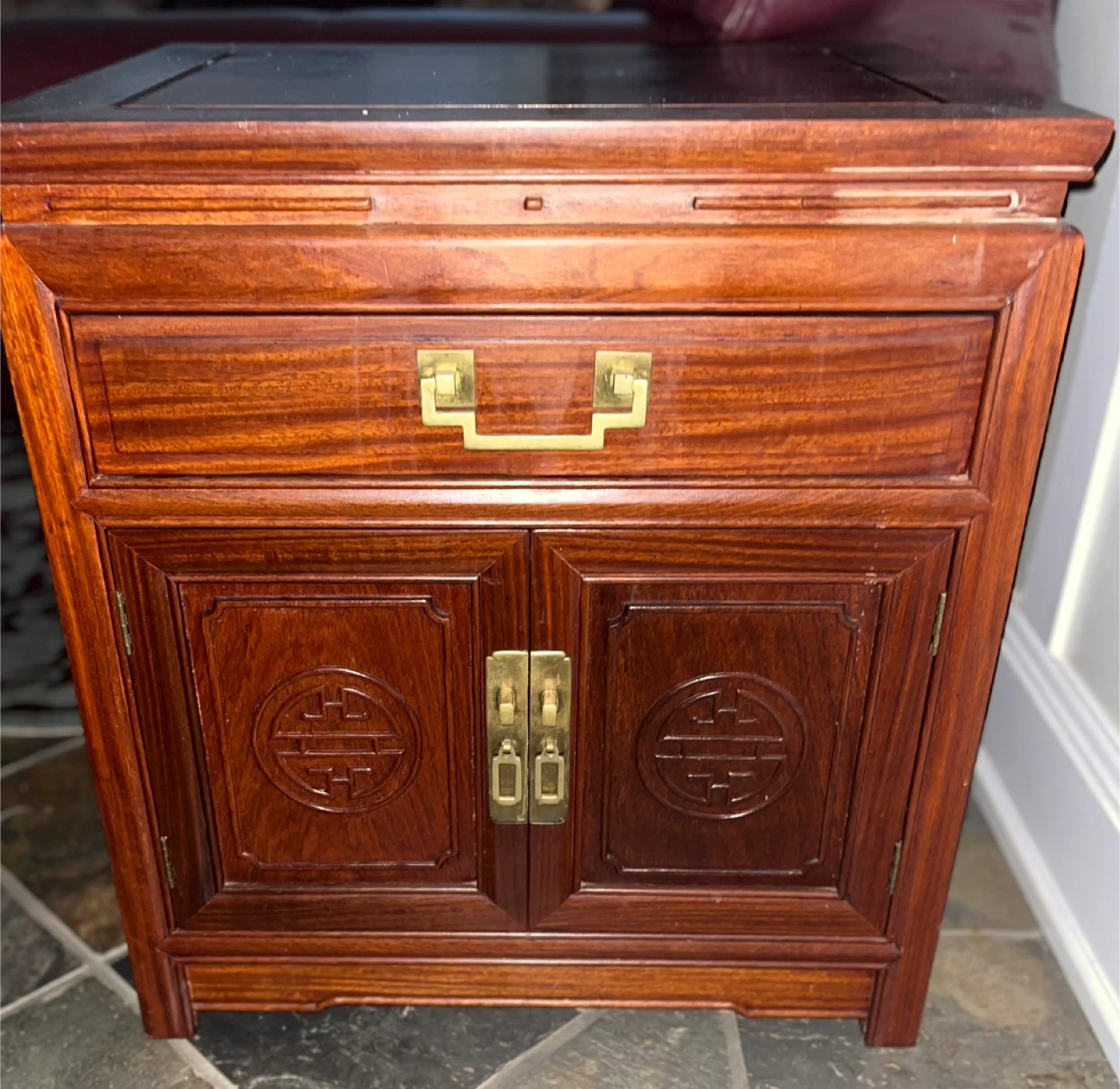 10Selling a lovely wooden side table! It features a drawer and a cabinet, perfect for extra storage. The wood has a beautiful grain and a rich colour. The hardware is brass-toned, adding a touch of elegance to any room