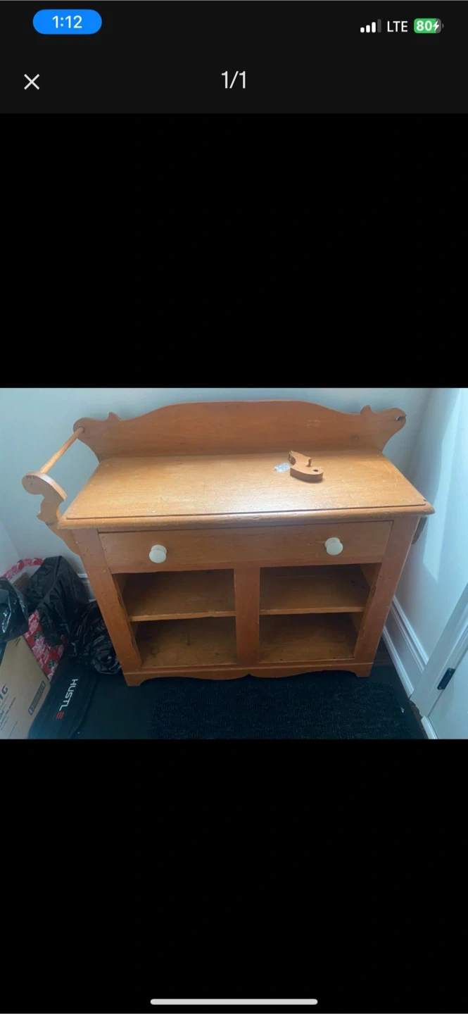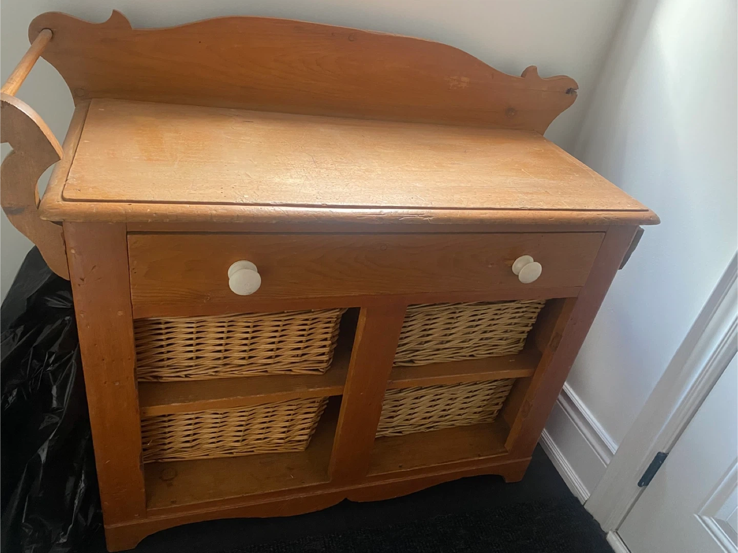 50Selling a charming wooden sideboard! It features a drawer and two shelves with wicker baskets, perfect for adding a touch of rustic charm to your home. It's in good used condition and ready for a new home