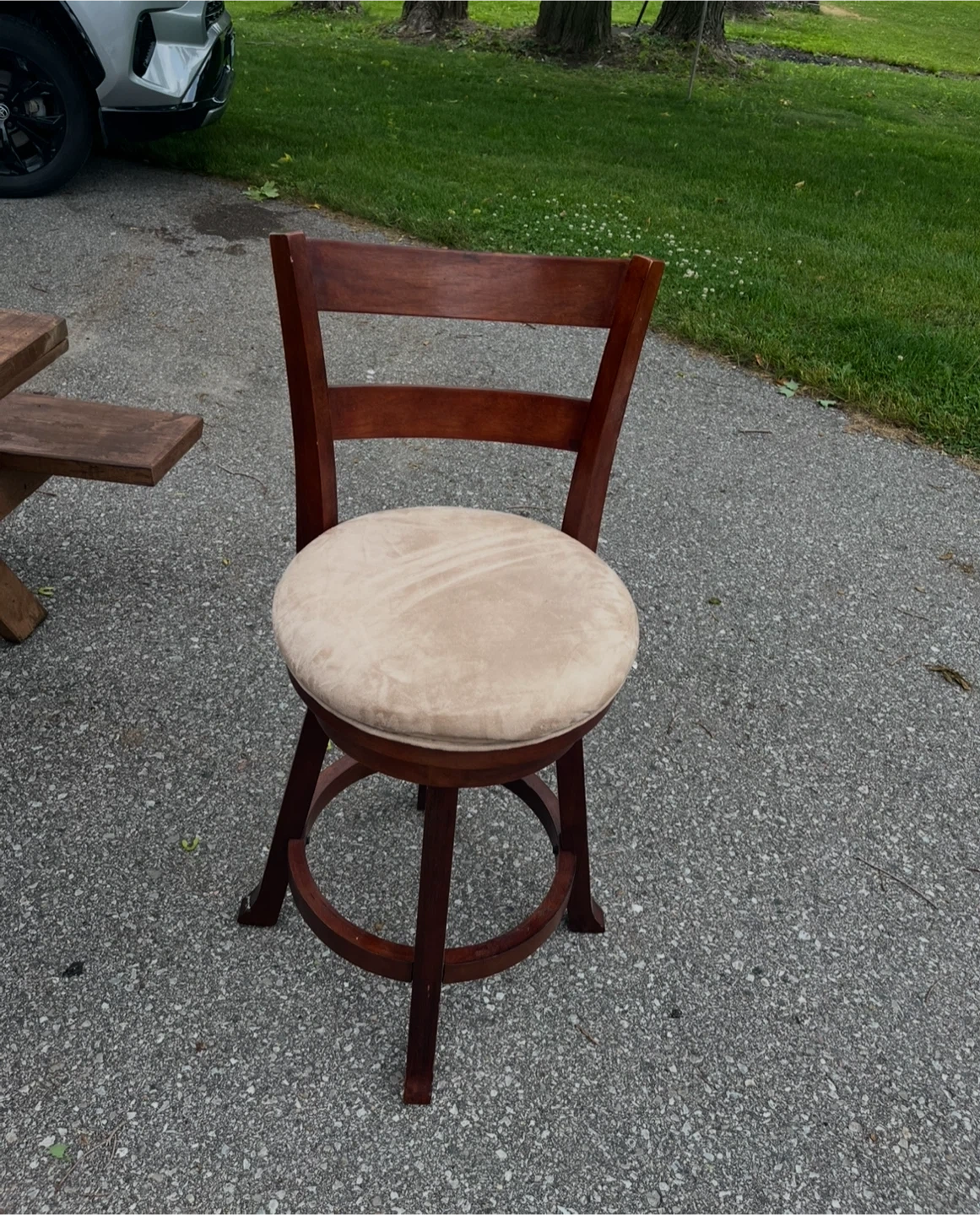 29Selling a gently used wooden swivel bar stool. It features a comfortable beige cushioned seat and a sturdy wooden frame. Perfect for adding a touch of classic style to your kitchen or bar area!