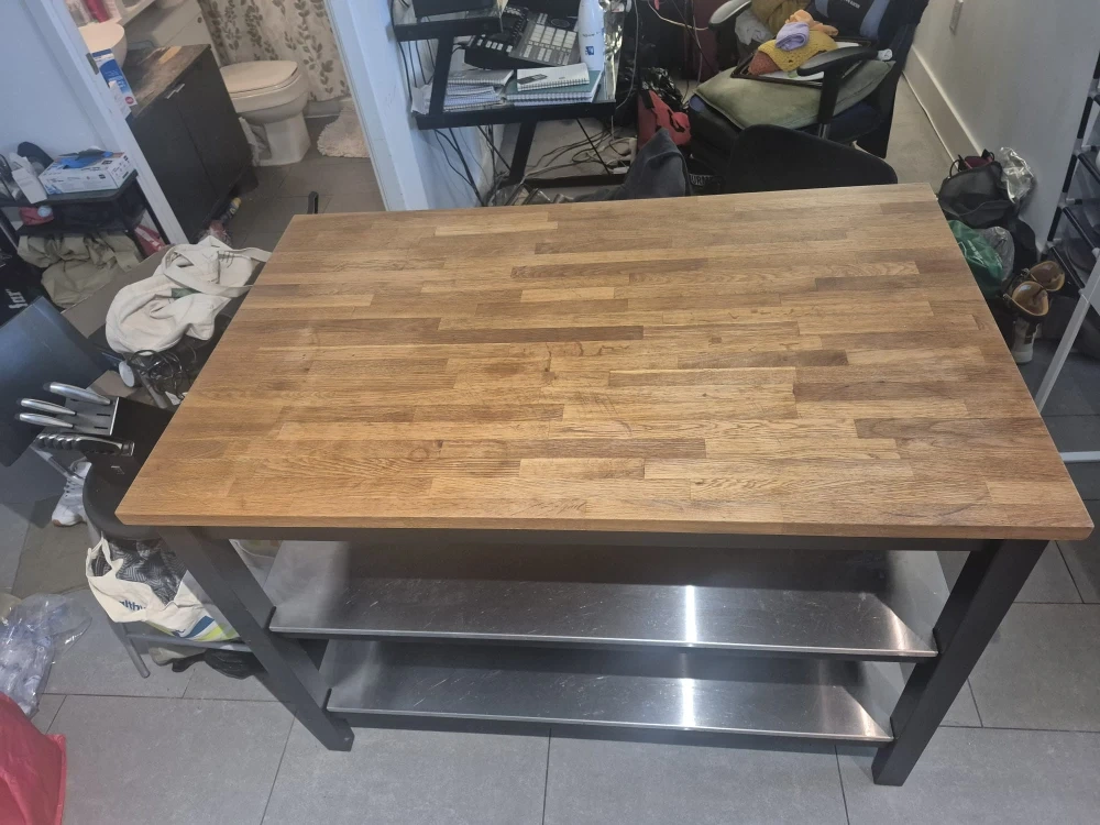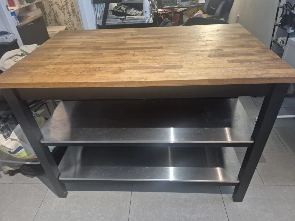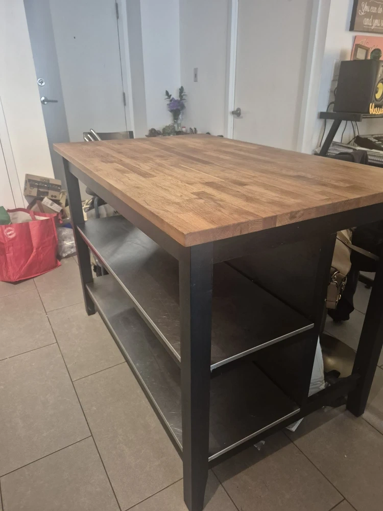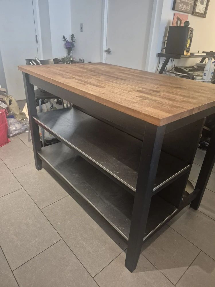 171Selling a kitchen island cart with a wooden top and black frame. It has two stainless steel shelves for extra storage. Perfect for adding extra counter space and storage to your kitchen!