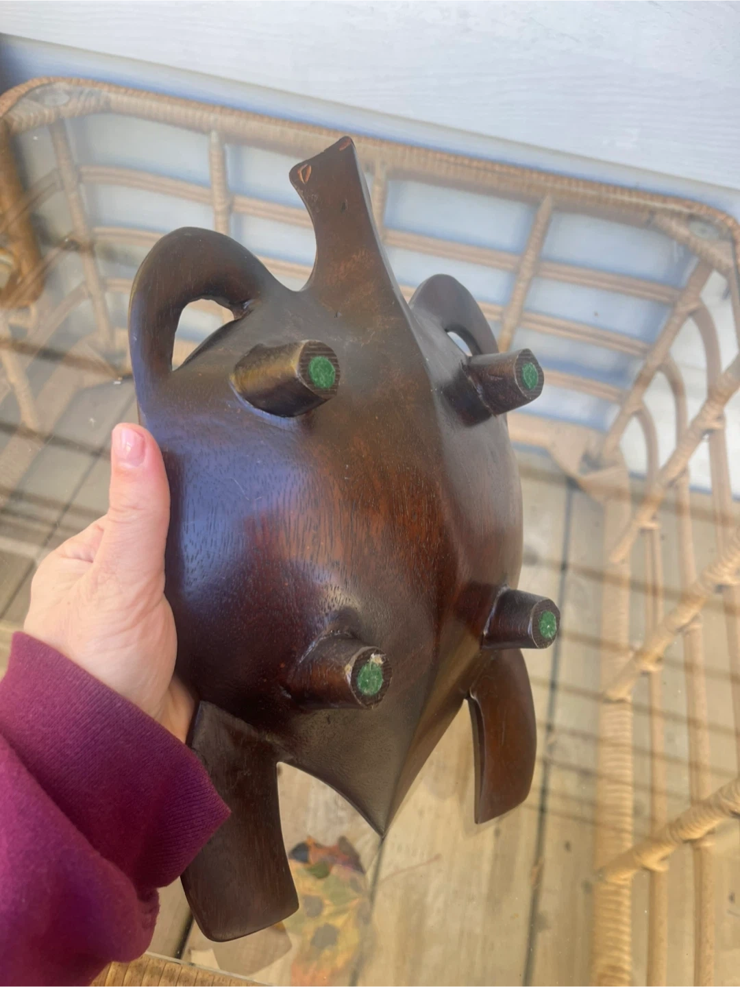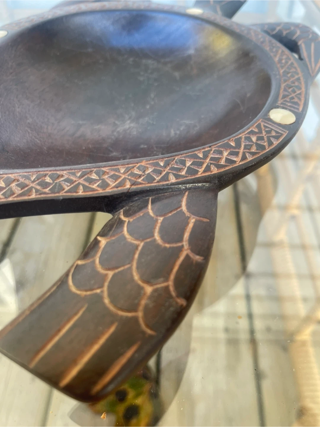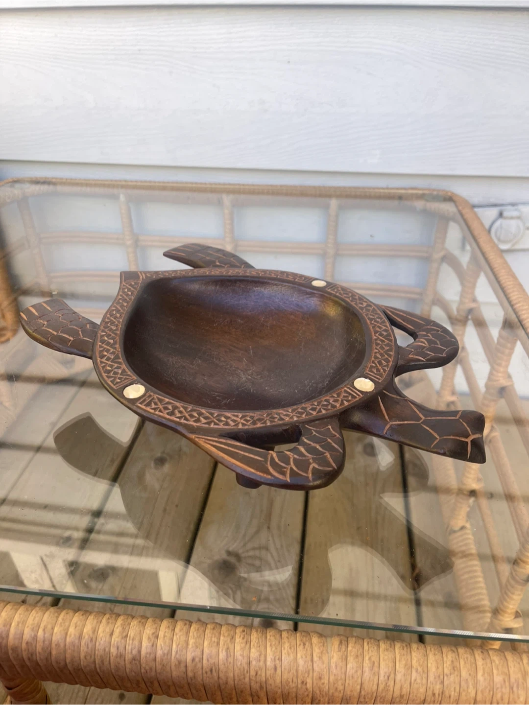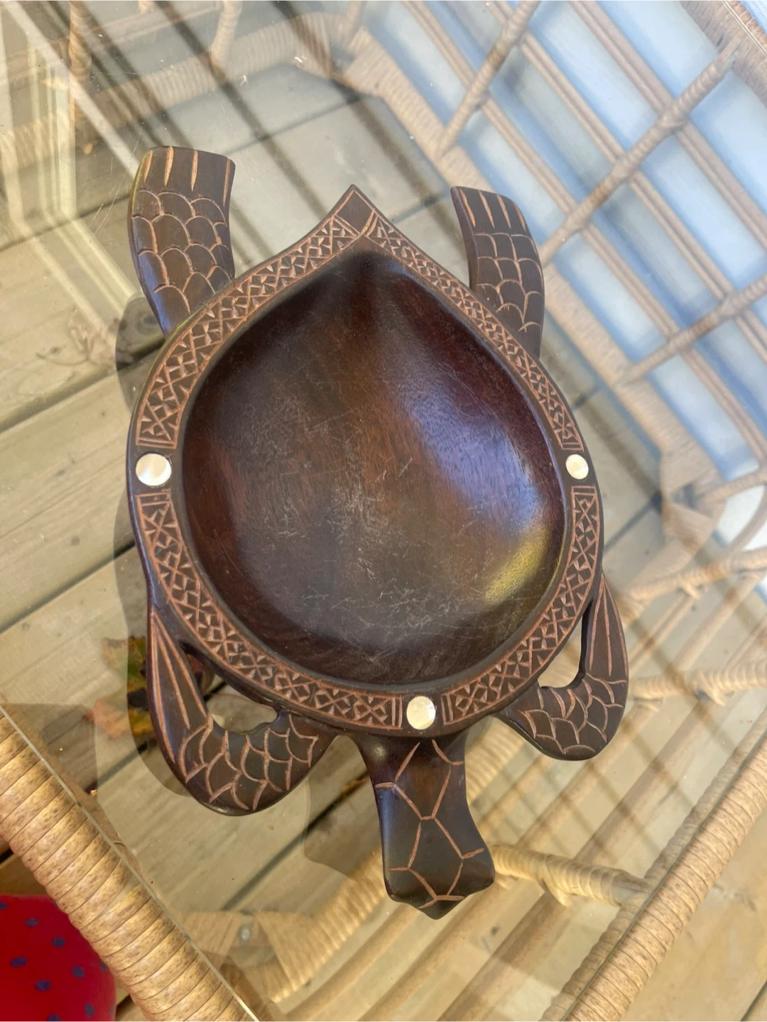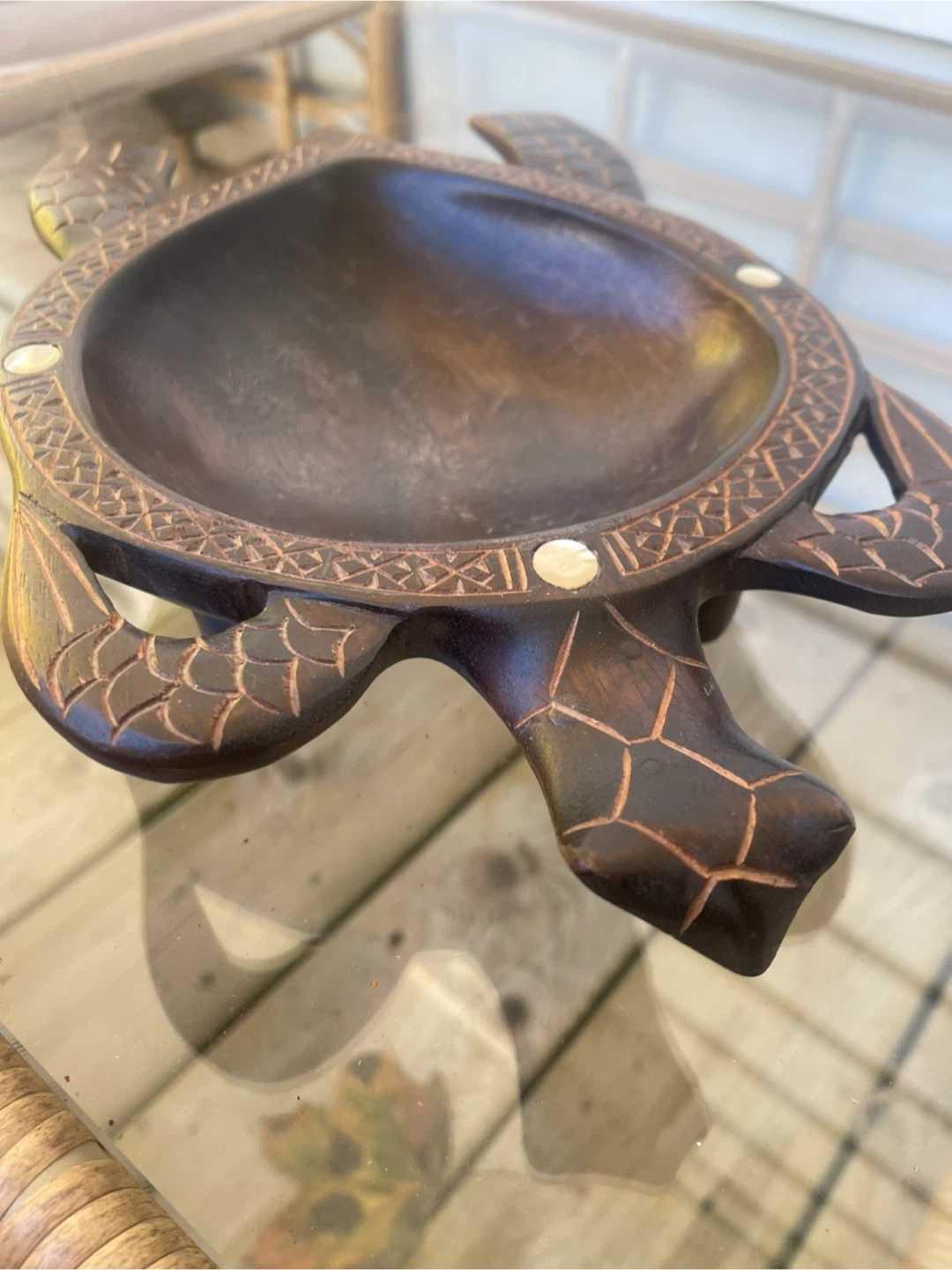 Here's a unique wooden dish shaped like a turtle! It has intricate carvings and a smooth finish. Perfect for adding a touch of whimsy to your home decor