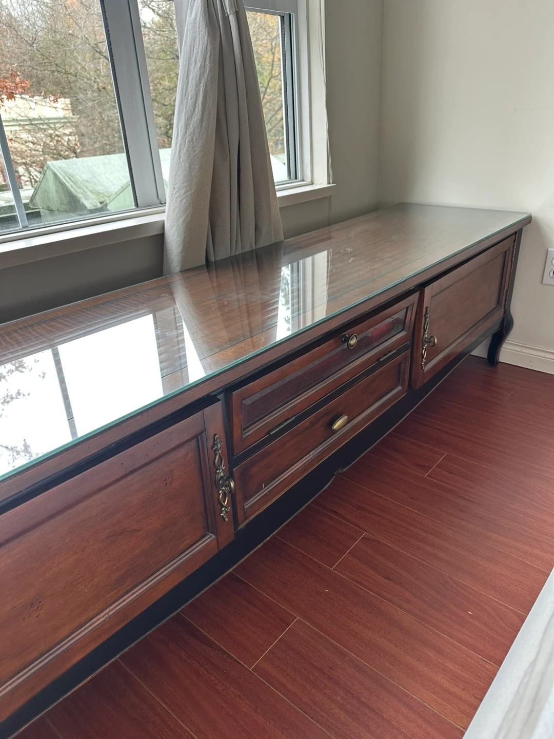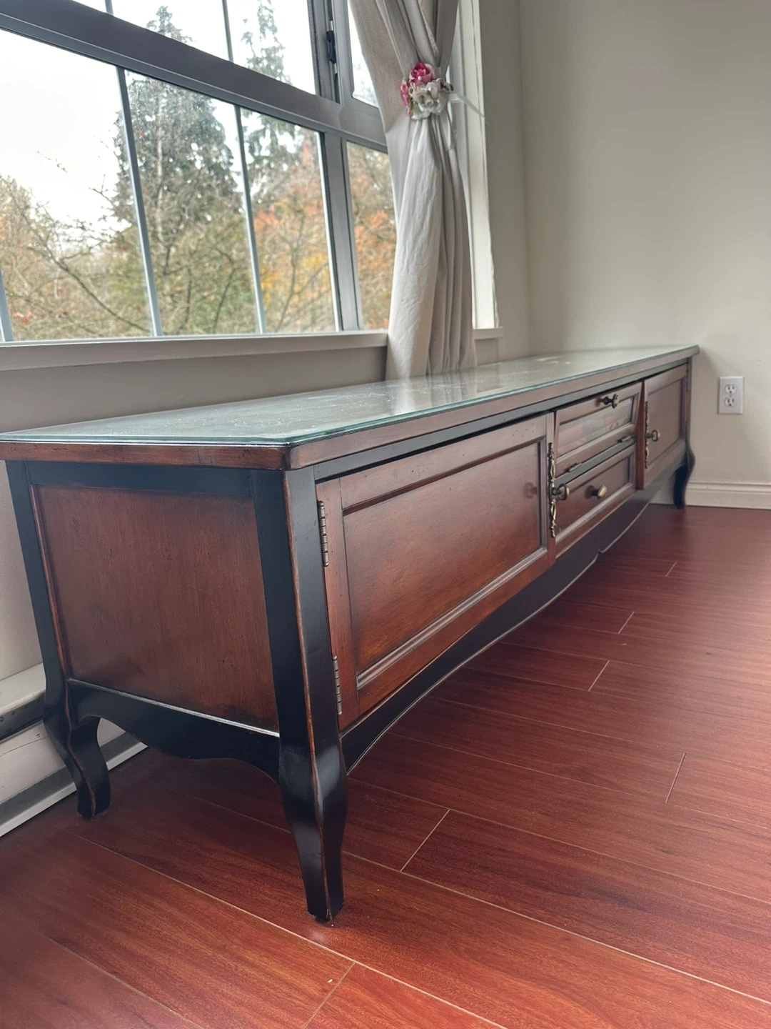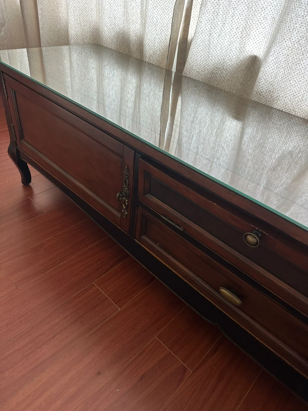 15Selling a wooden TV stand or console table. It features a glass top and a classic design. Perfect for adding a touch of elegance to your living room or entertainment area